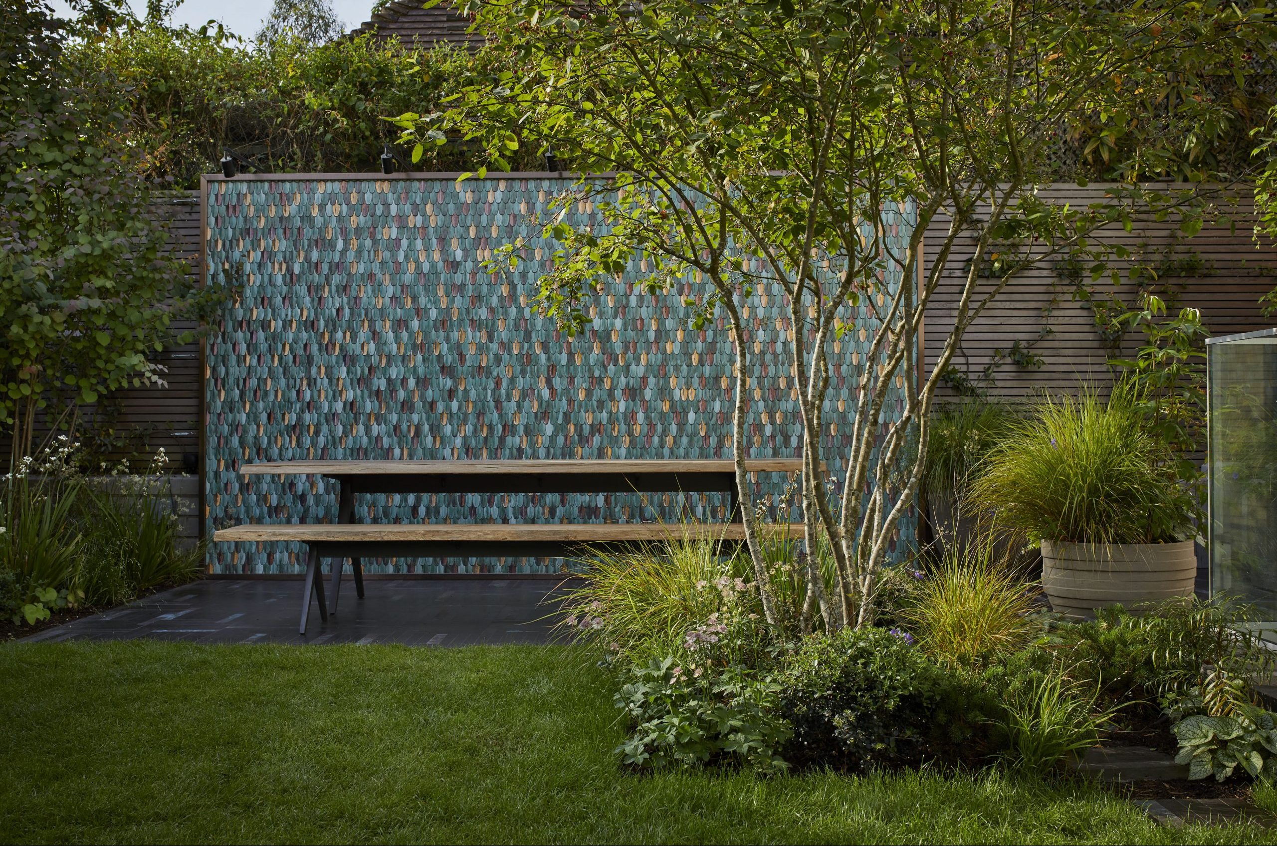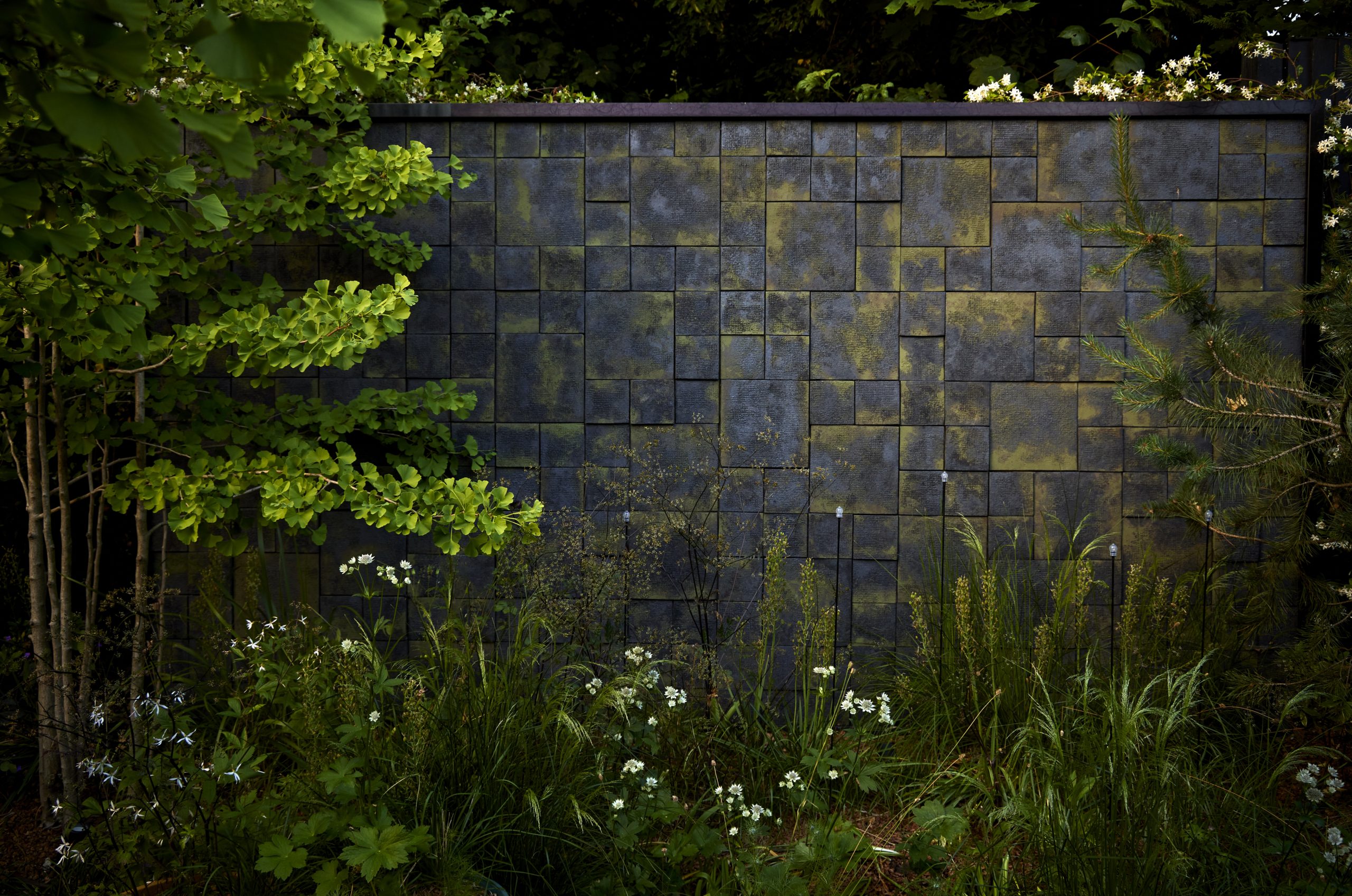Here the feature wall for the garden of a brand new house is made from sensational tiles designed by Cristina Celestino and produced in Italy by Botteganove. Over four metres high, its installation transformed the bland outlook from the new house, and its subtle colours and intricate textures also served as inspiration for our planting scheme. At night the wall is illuminated by six downlights.
