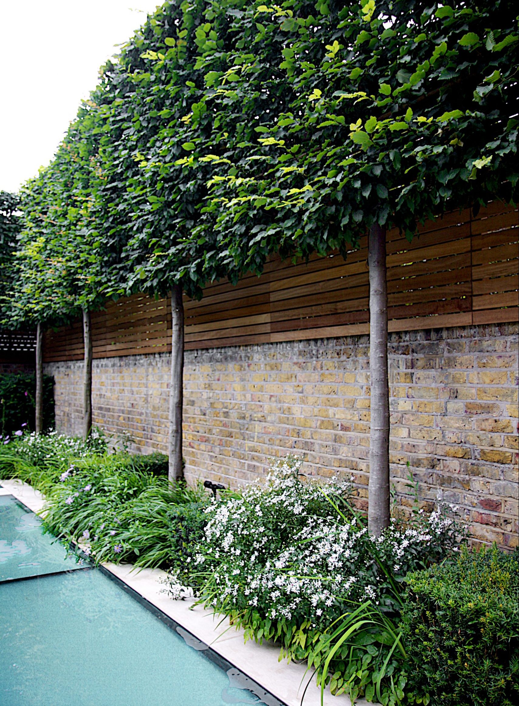 This formal garden was commissioned as a chic outdoor space for entertaining friends and colleagues. We guarded the privacy of these occasions by building up the garden boundary with an espaliered hornbeam hedge and an iroko fence mounted on top of the existing wall.