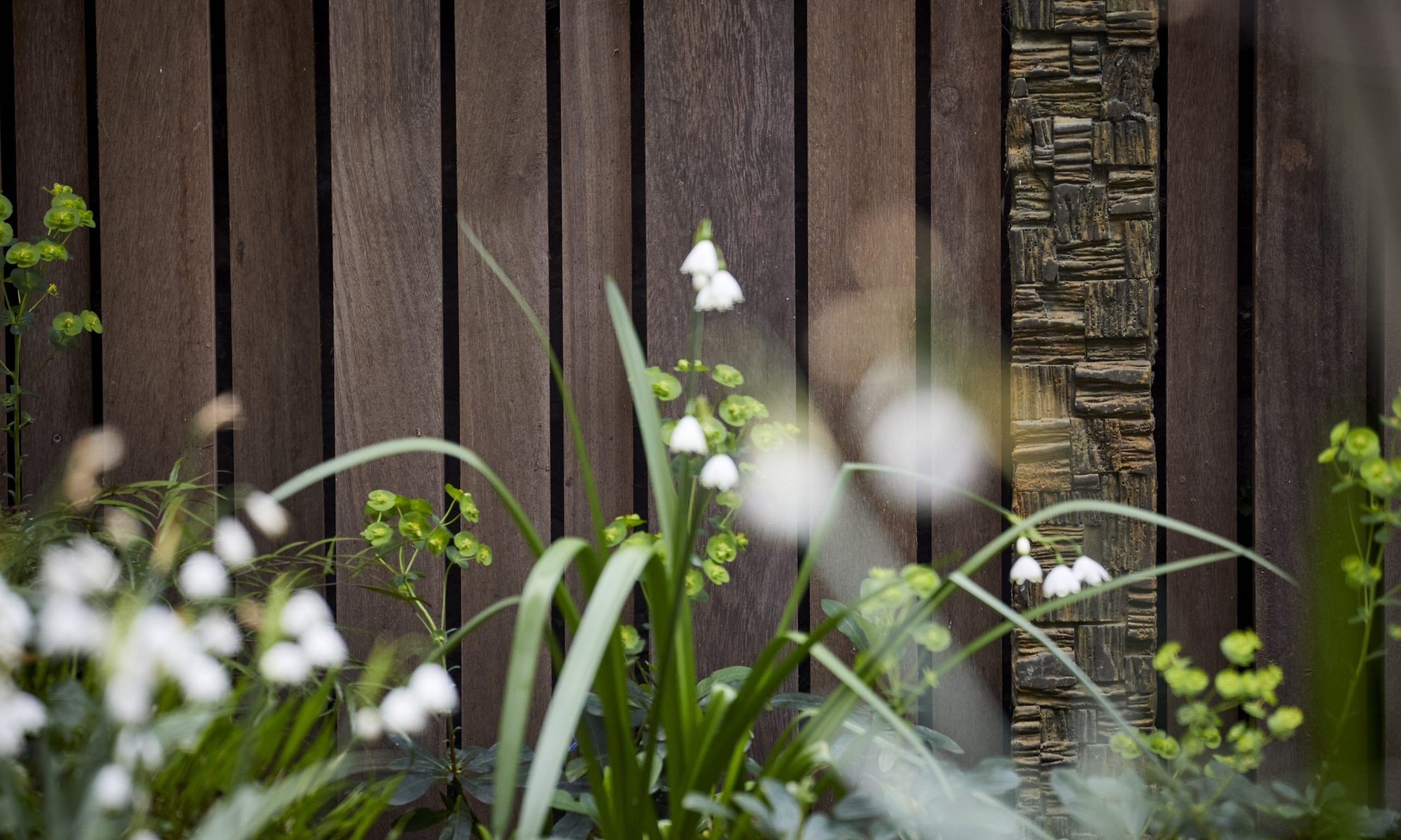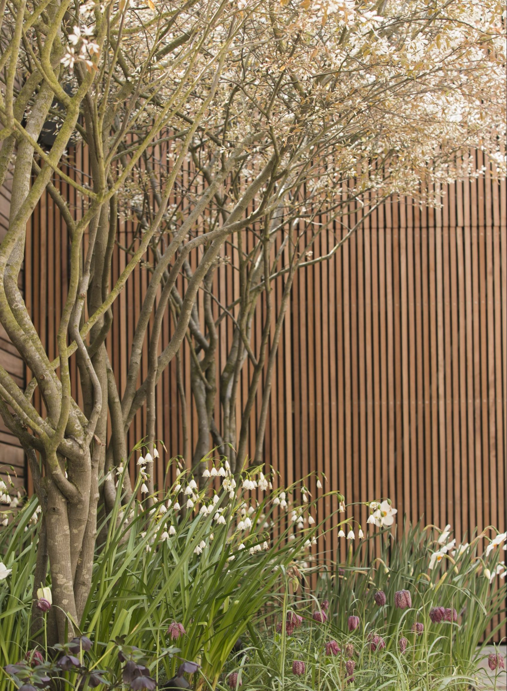 We enclosed this garden on two sides with a slatted iroko fence. This stretch of fencing might have become monotonous, had we not used uprights in a selection of different widths and depths, and even a few made from bronze.