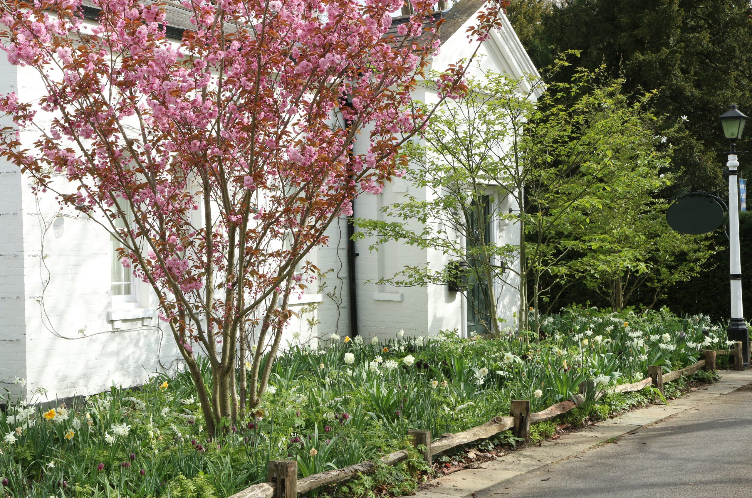 Cleft timber has been used for centuries to make fences in Britain. We chose a miniature version of the traditional, cleft-timber fence to enclose new beds packed with spring bulbs in this informal garden.