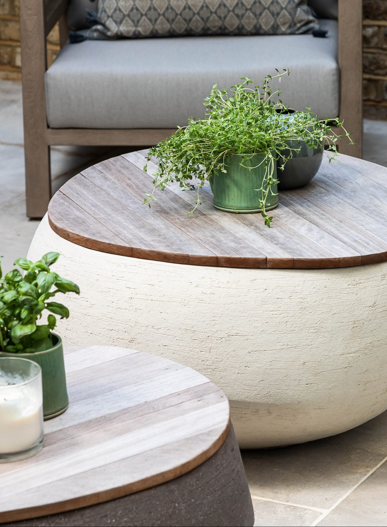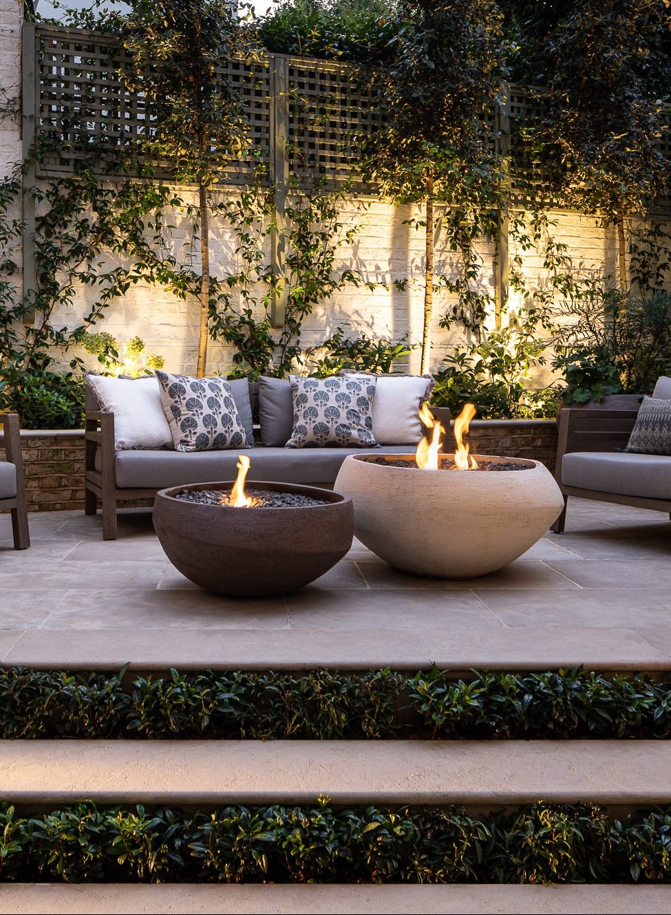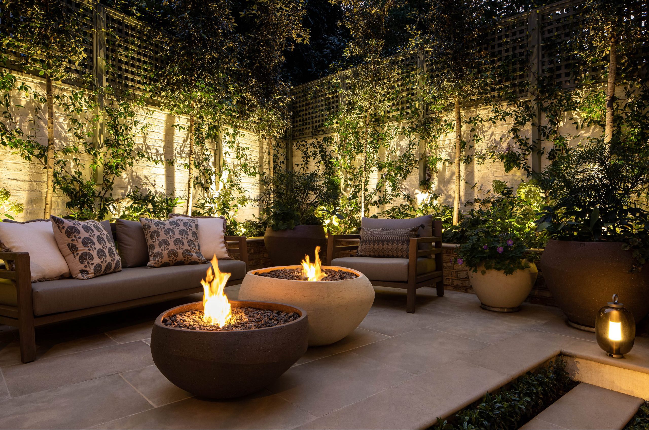 We put bioethanol burners on gravel inside two terracotta pots from Atelier Vierkant to make firepits for this garden. With the burners and the wall lights glowing, the garden is as welcoming by night as it is during the day. We have had timber tops especially made to fit the pots, so that they can serve as small tables when the firepits are not in use.