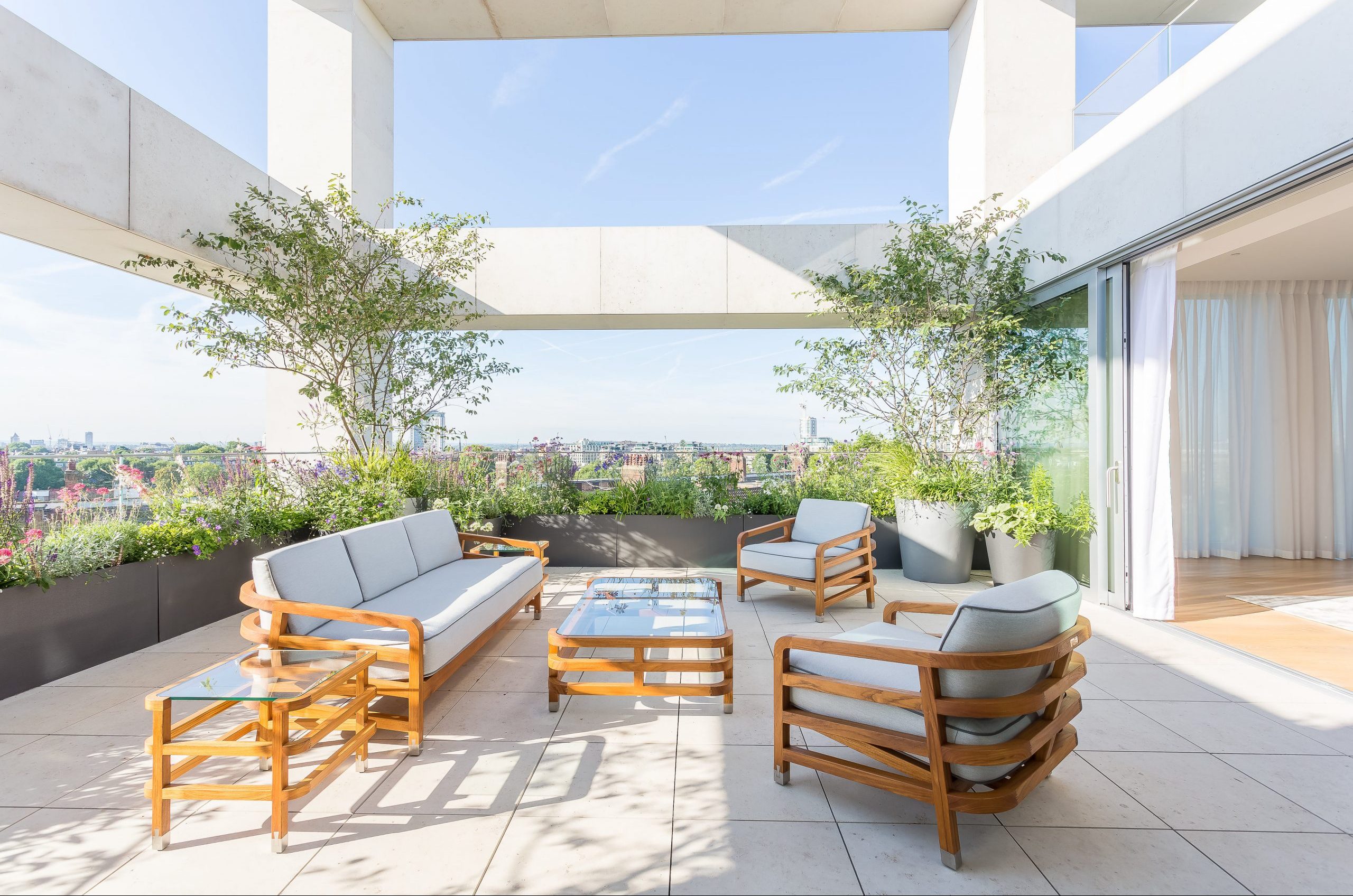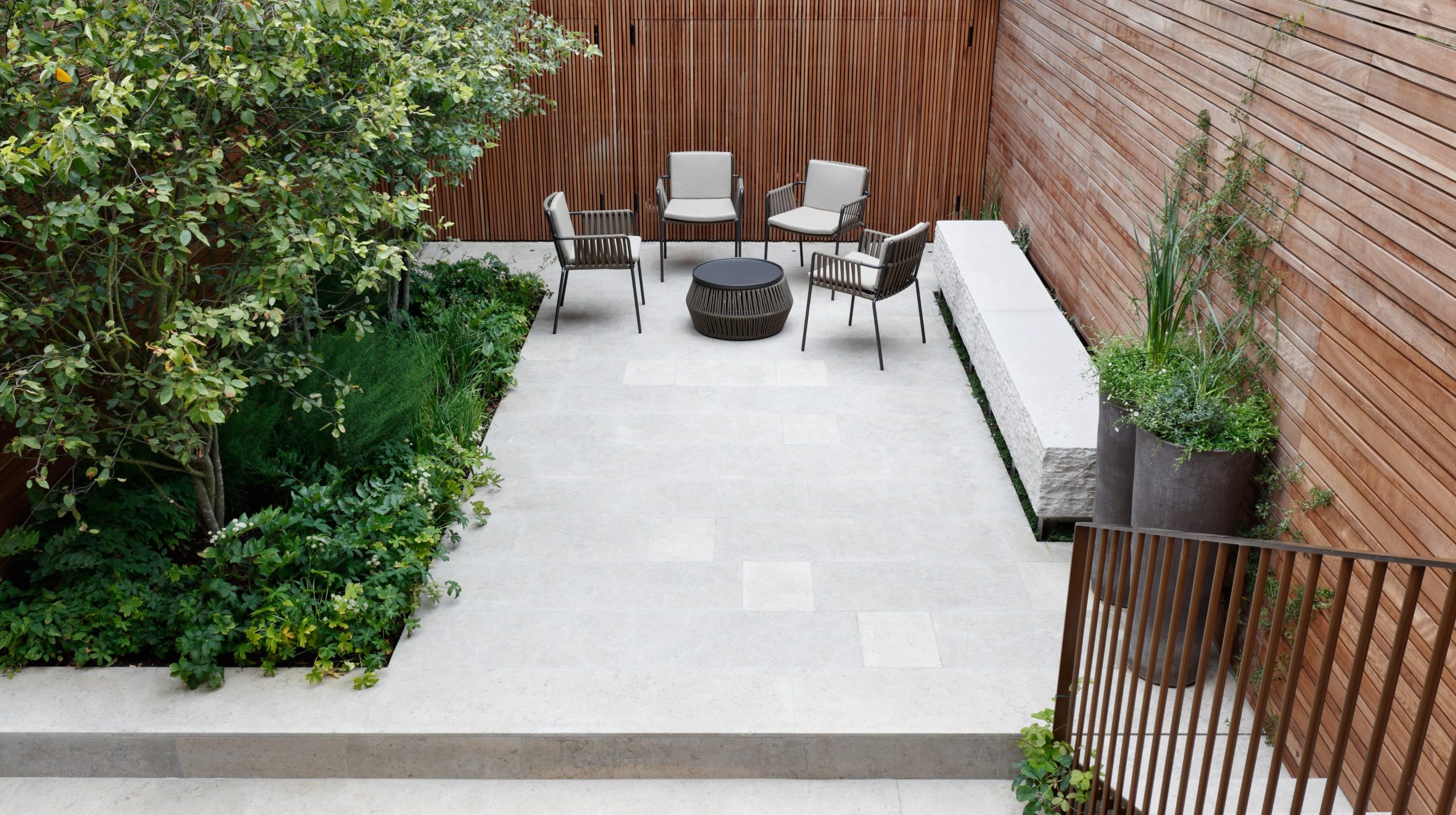 Pale and pristine, limestone seemed the only possible choice for the terrace of this apartment in a new development near London’s Holland Park. Both paving and furniture mirrored the minimalist style of the apartment, making the terrace into a seamless continuation of the inside space.