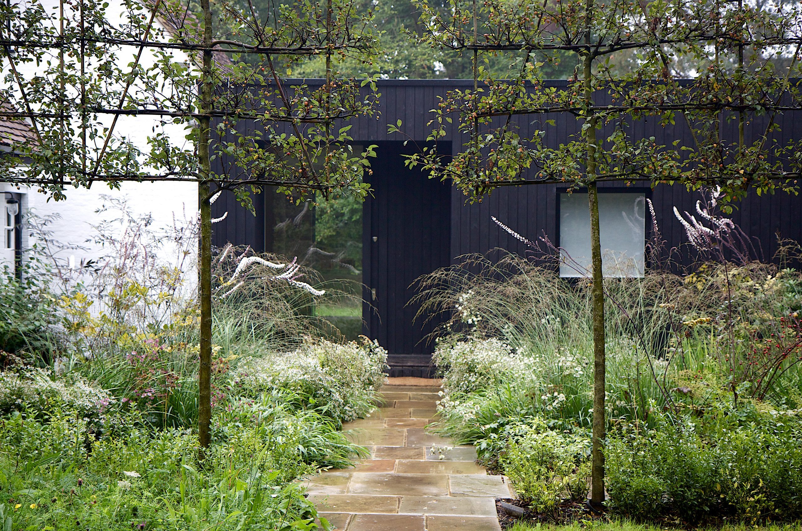 Reclaimed York-stone slabs sit comfortably in the garden we designed for this country house, seeming to marry well with the planting in each season, and displaying a new palette of colours with every shower of rain.