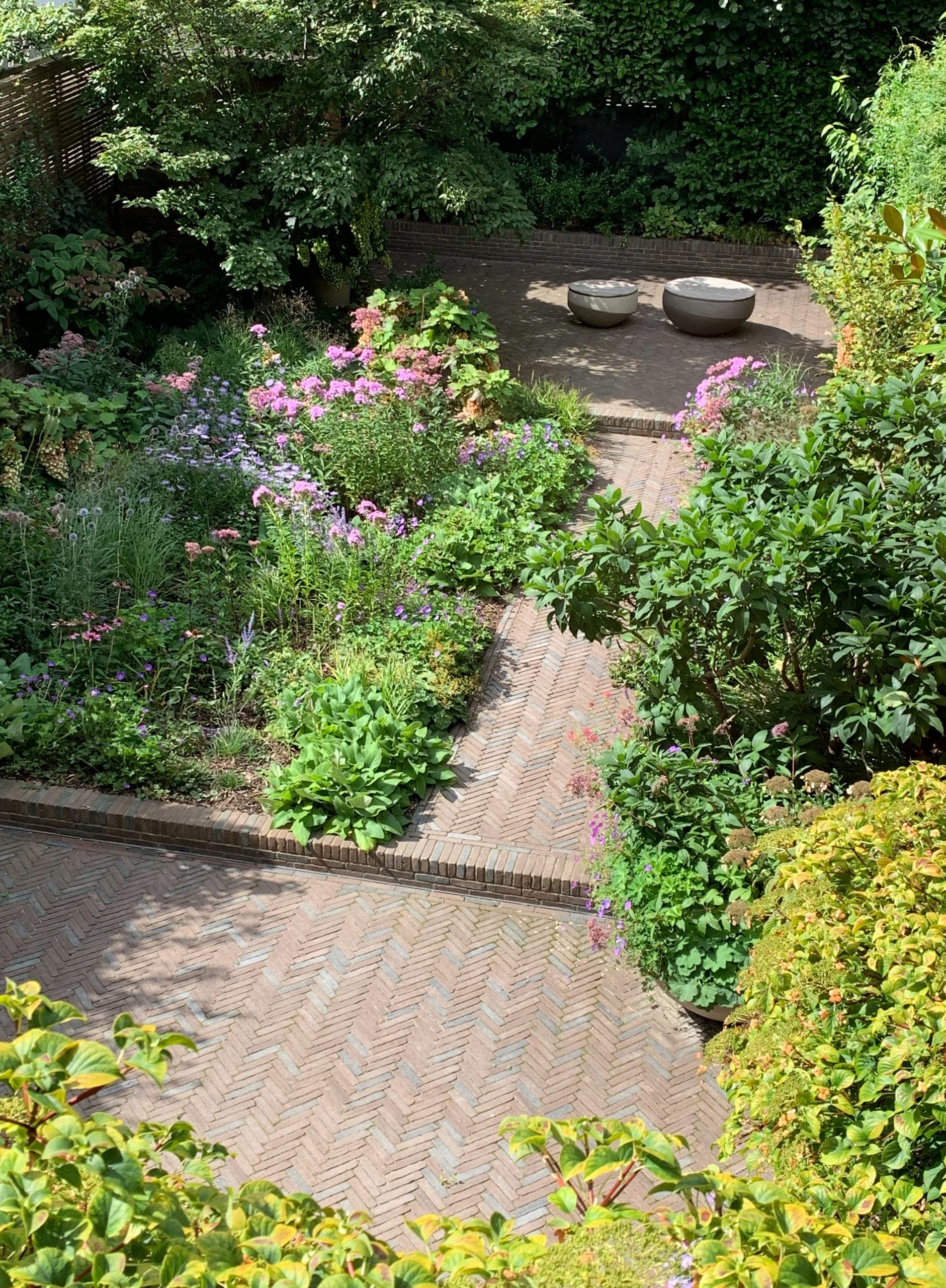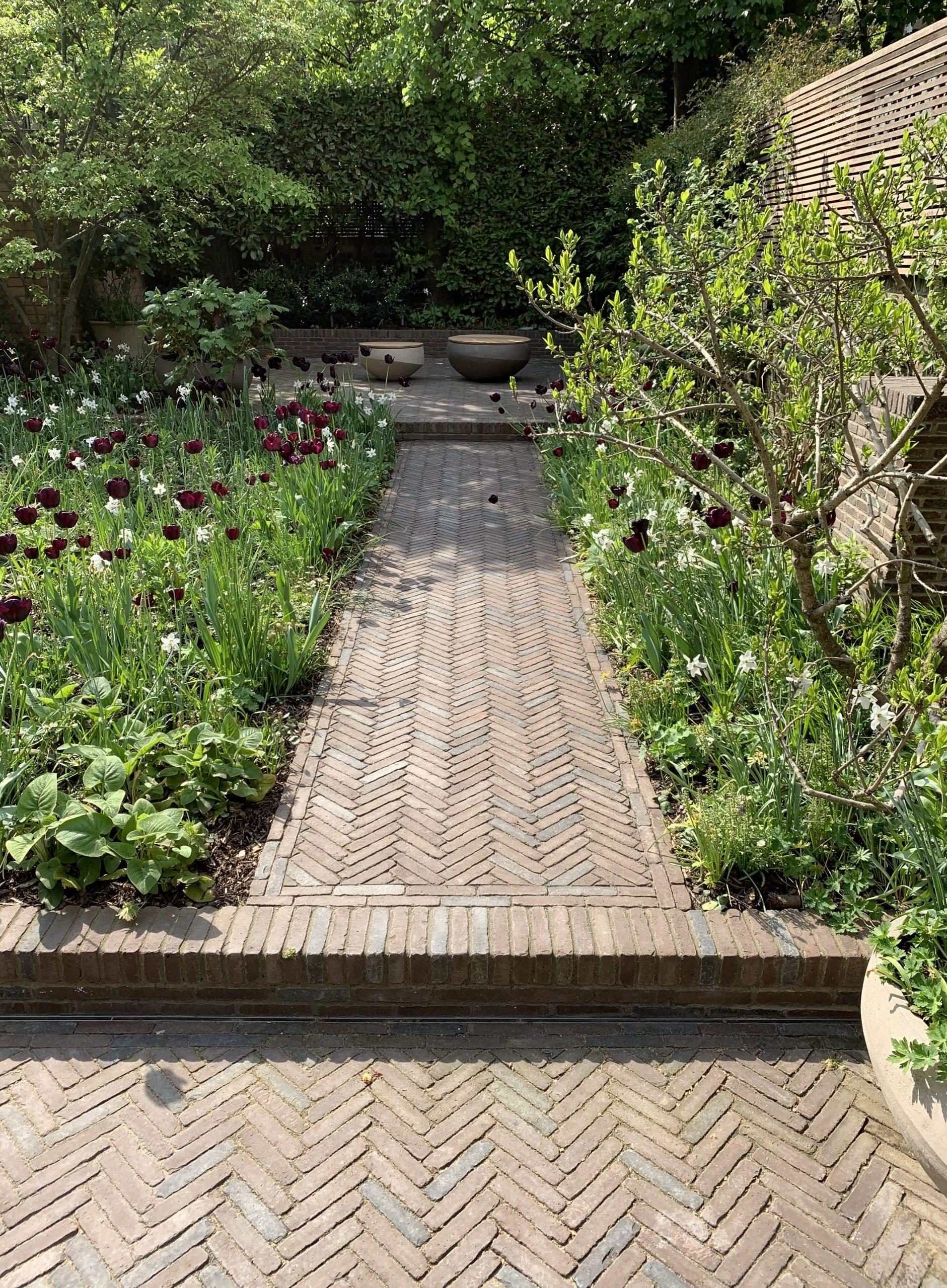 These paths are laid with narrow bricks made Vande Moortel, a brickworks in Belgium run by the same family for nearly 150 years. We softened their impact by choosing two different colours of brick, laying them in an intricate herringbone pattern.