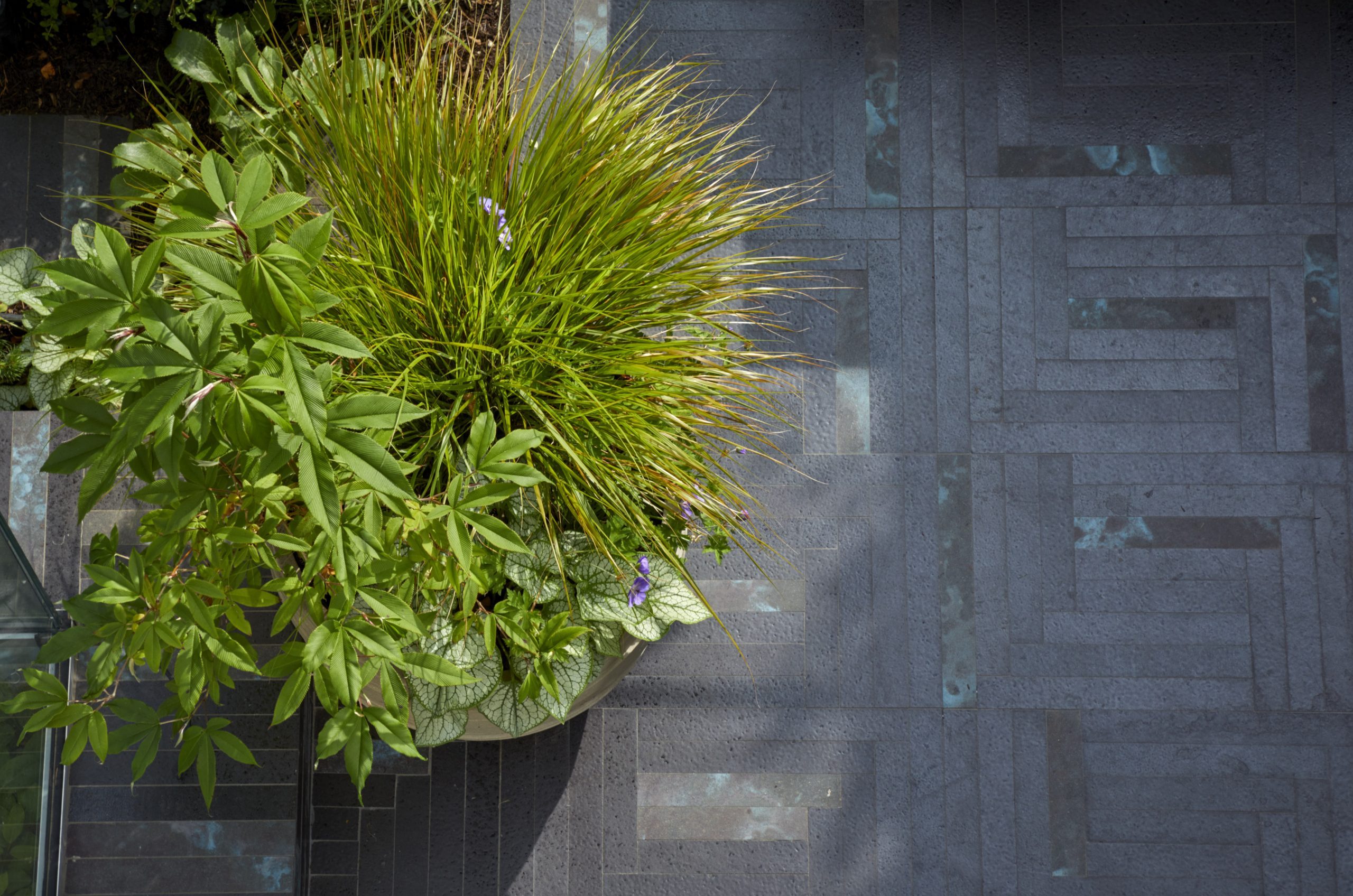The paving slabs for this elegant garden were supplied by Nero Sicilia – a company working exclusively with lava gathered on the slopes of Mount Etna in Sicily and fired at 1200 degrees. Some of the slabs contain metal particles, and these bring splashes of vibrant colour to the layout.