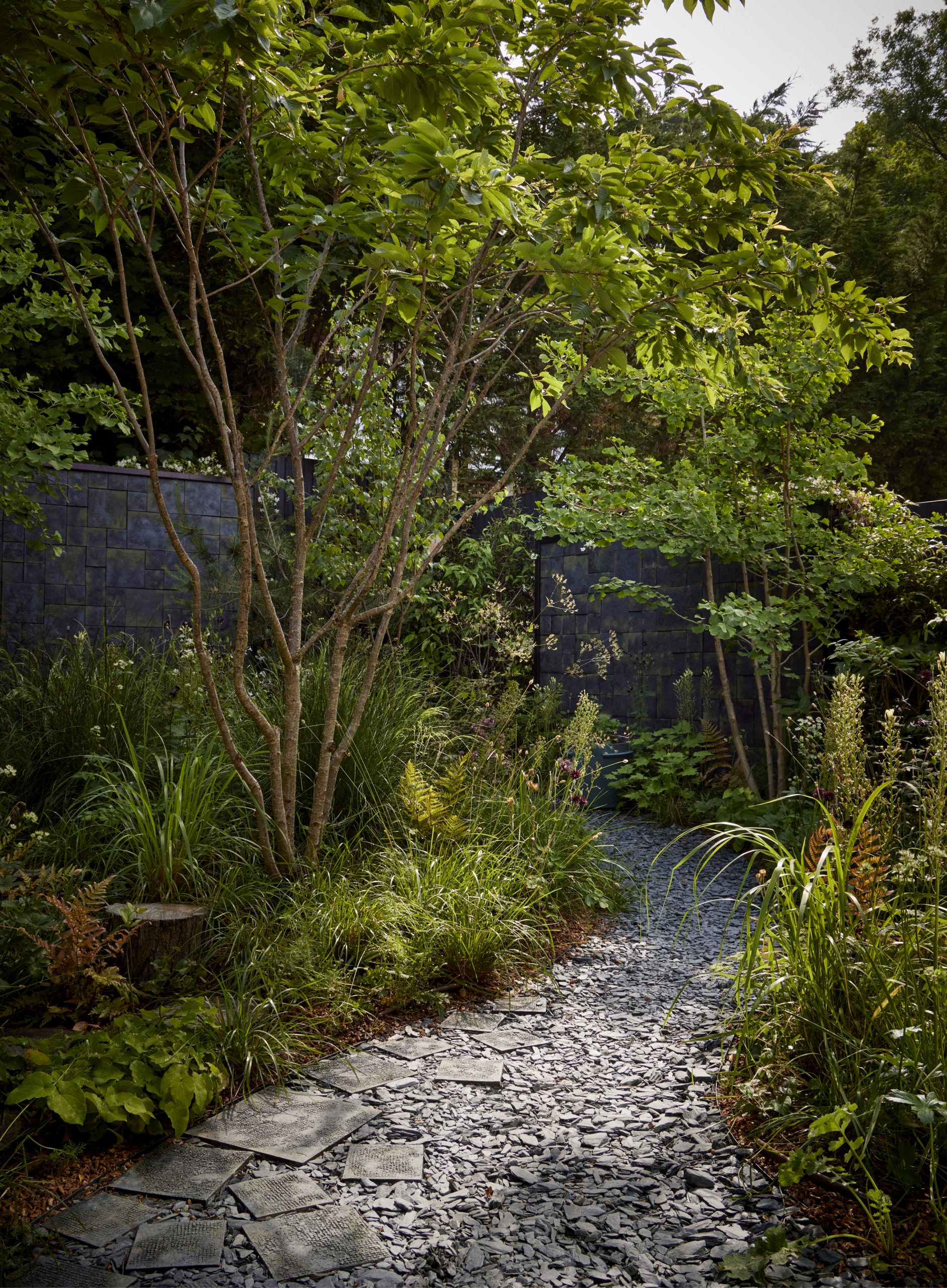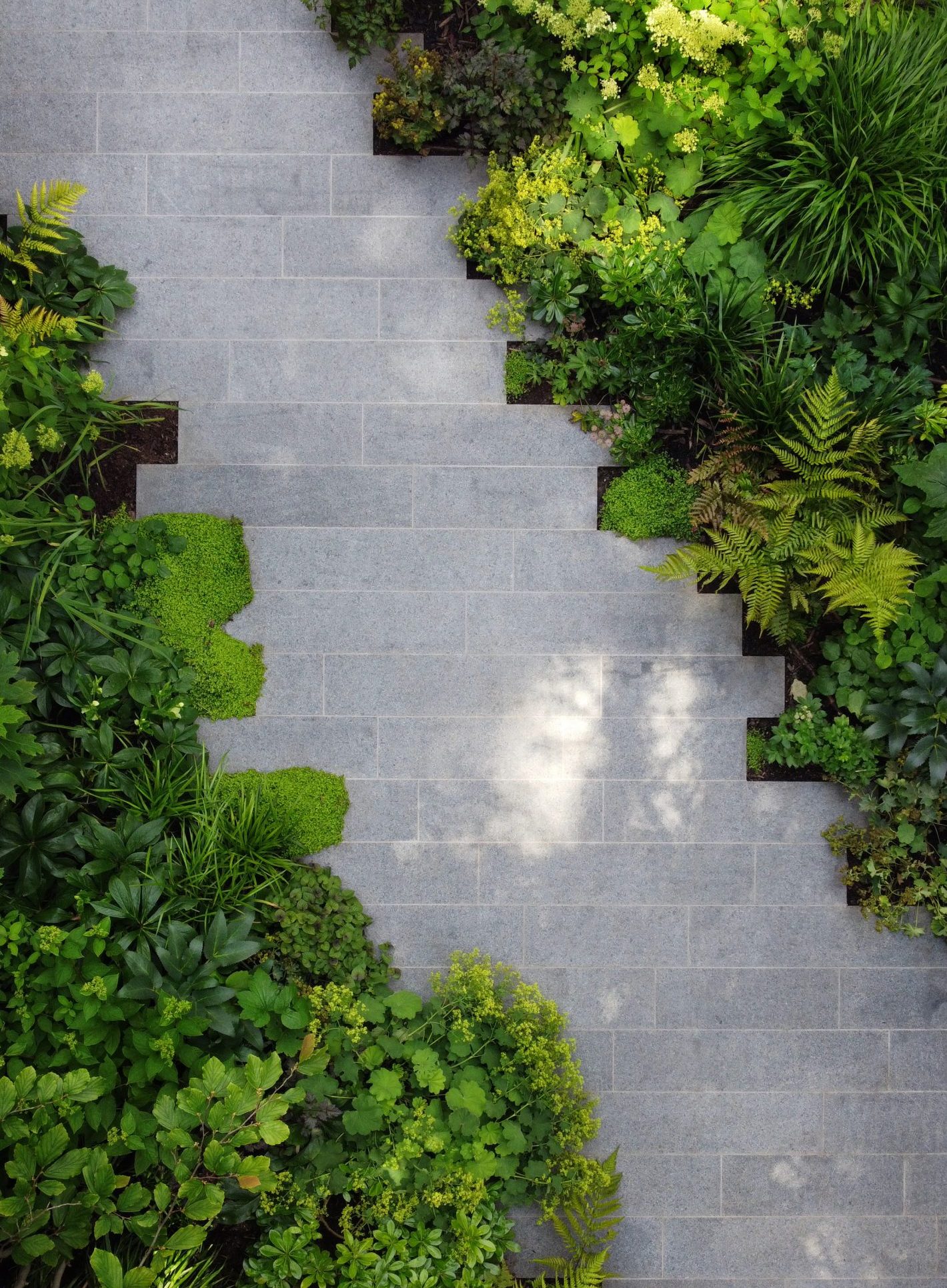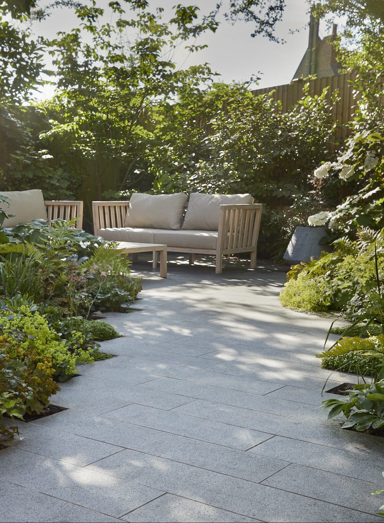 We created an impression of greater width in this garden by selecting sleek granite- plank paving from London Stone and laying it across the paths horizontally, leaving the edges jagged to create an eye-catching and intrinsically modern look.