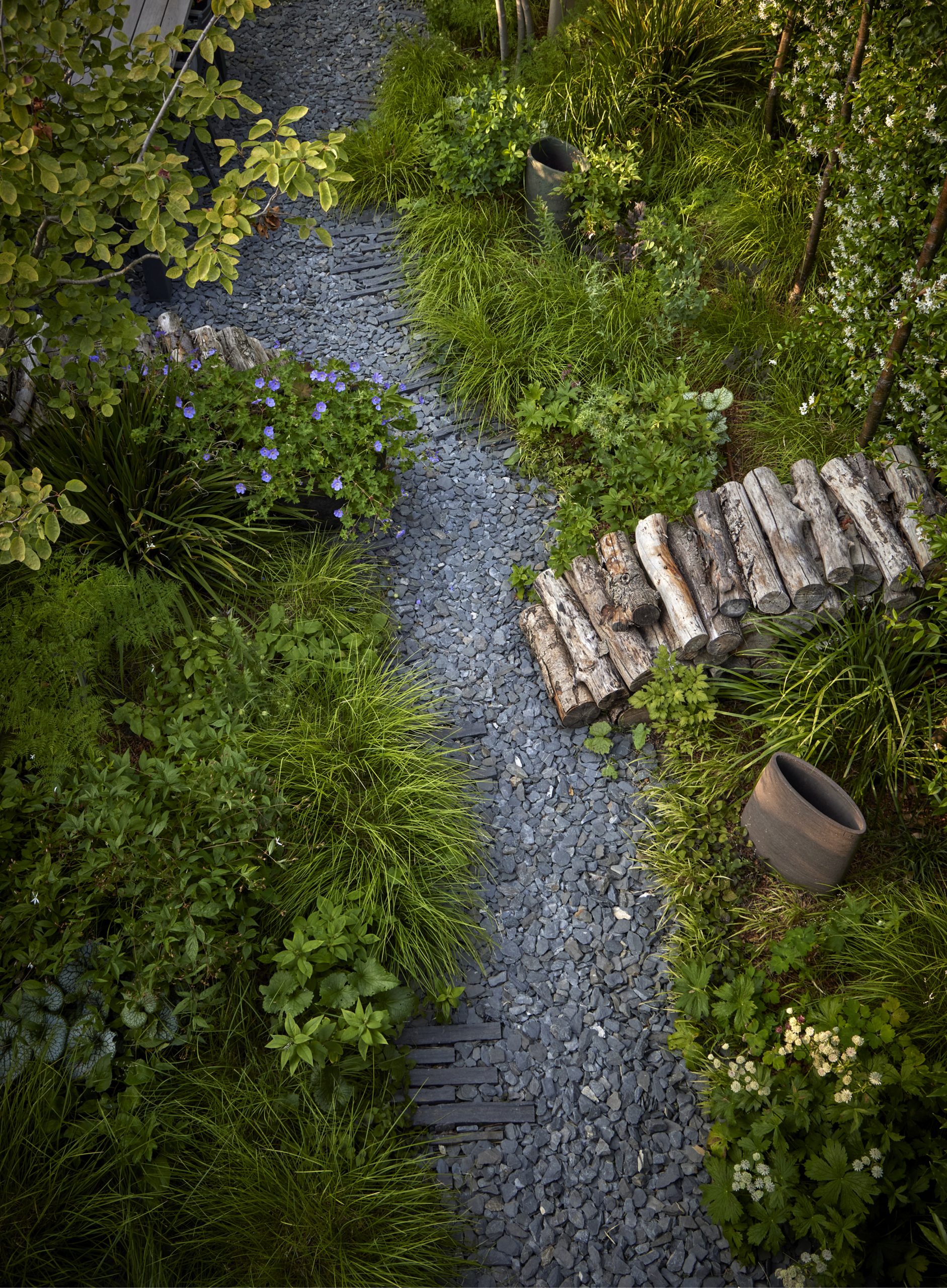 The inclusion of this loose material provided an ideal environment for allowing self-seeding plants to thrive between the chippings, seamlessly blurring the boundaries between the hardscaping and the planting. In doing so, we managed to create a softer and more inviting space and effectively mitigate the starkness of the hard landscaping.