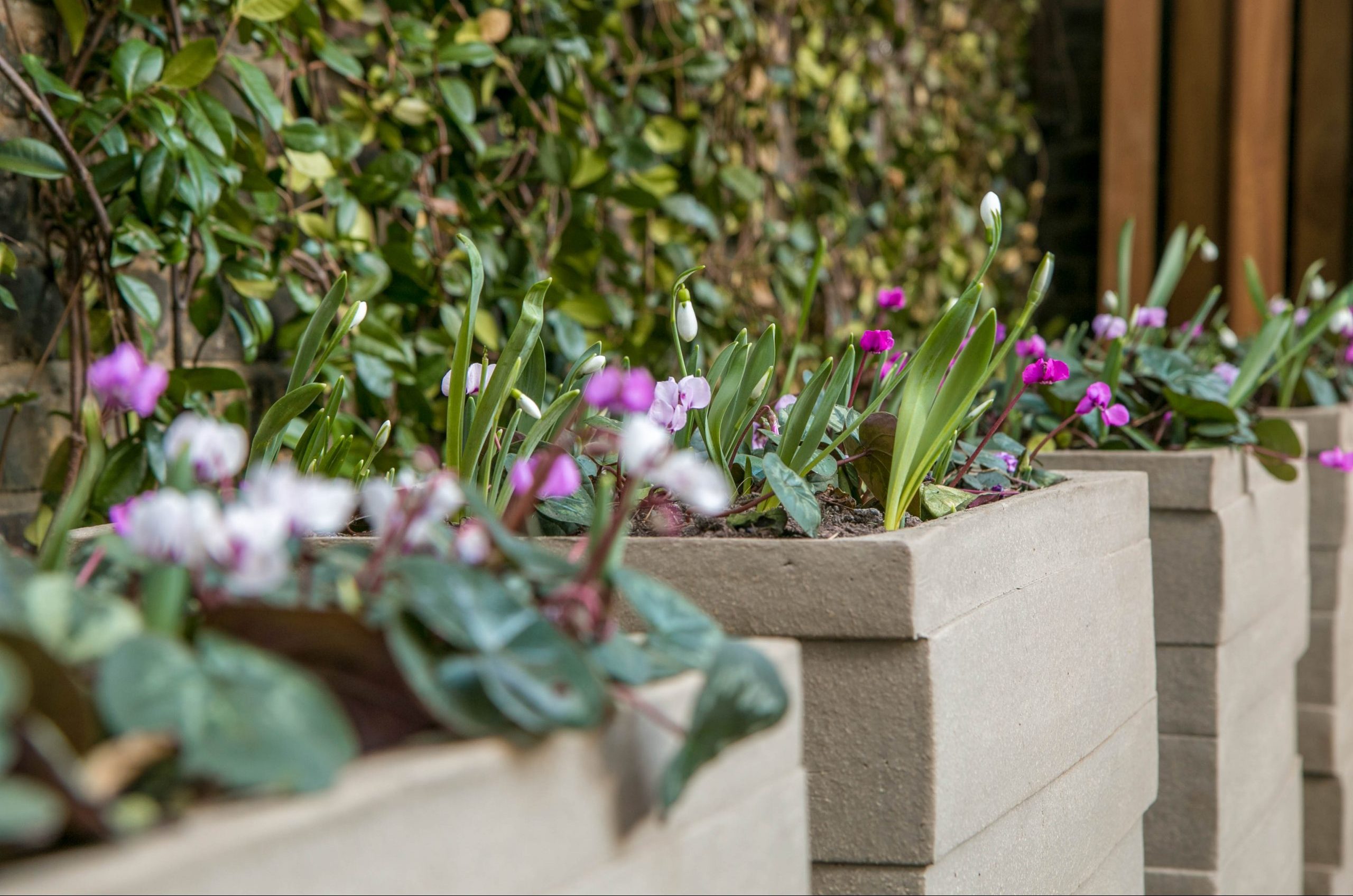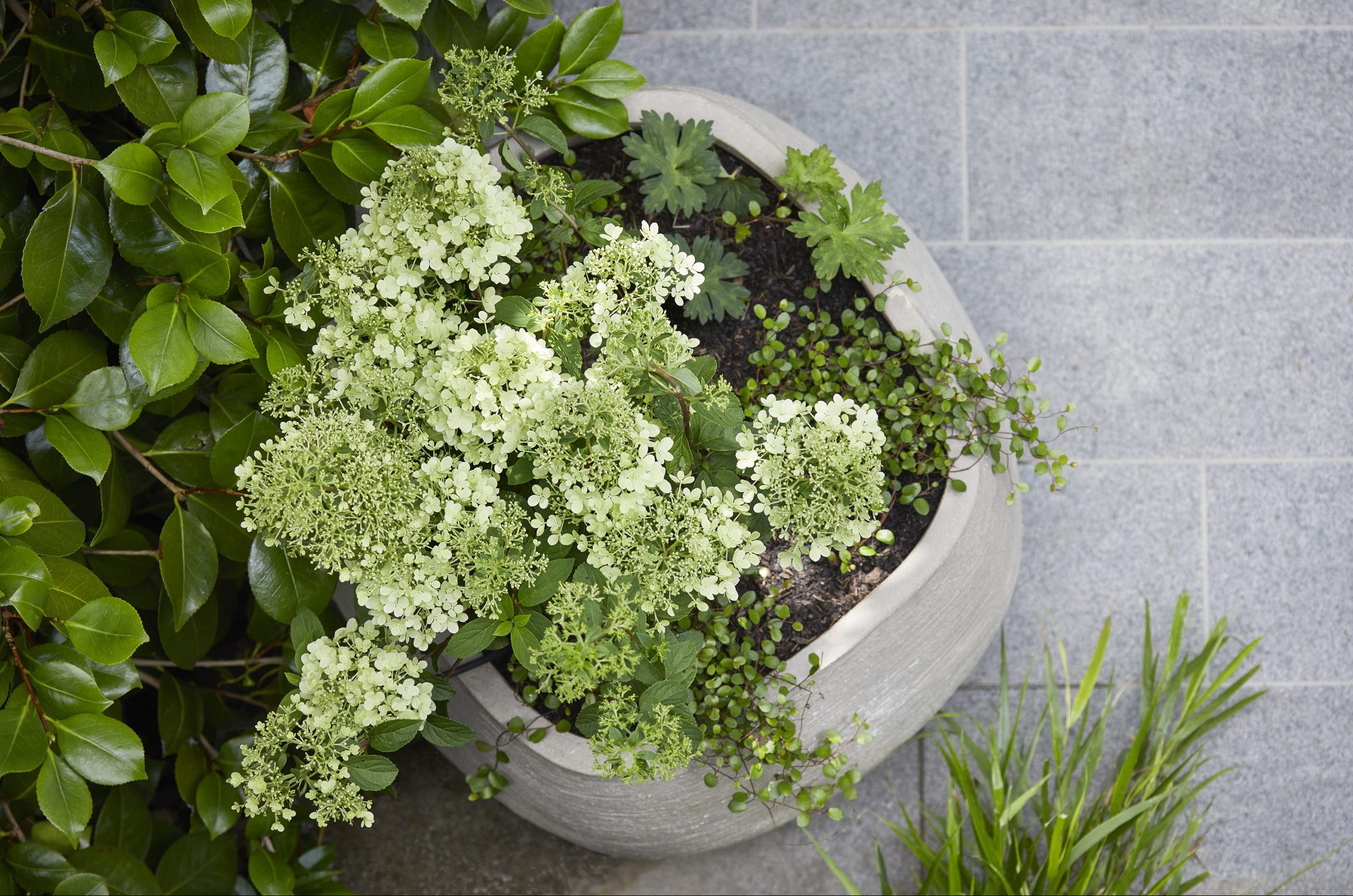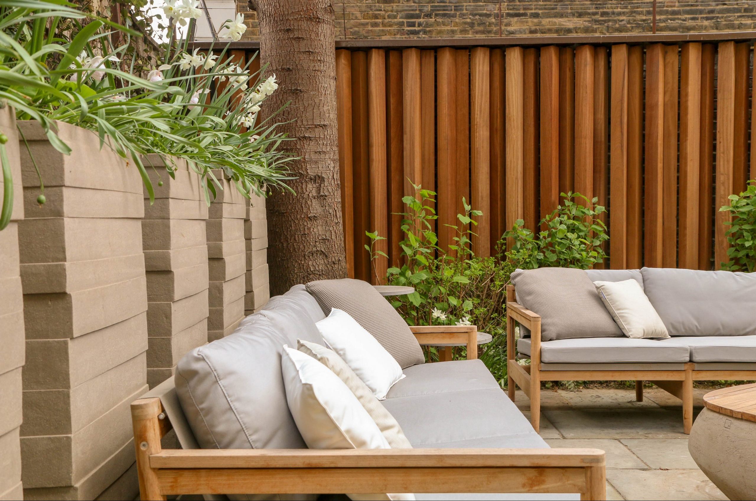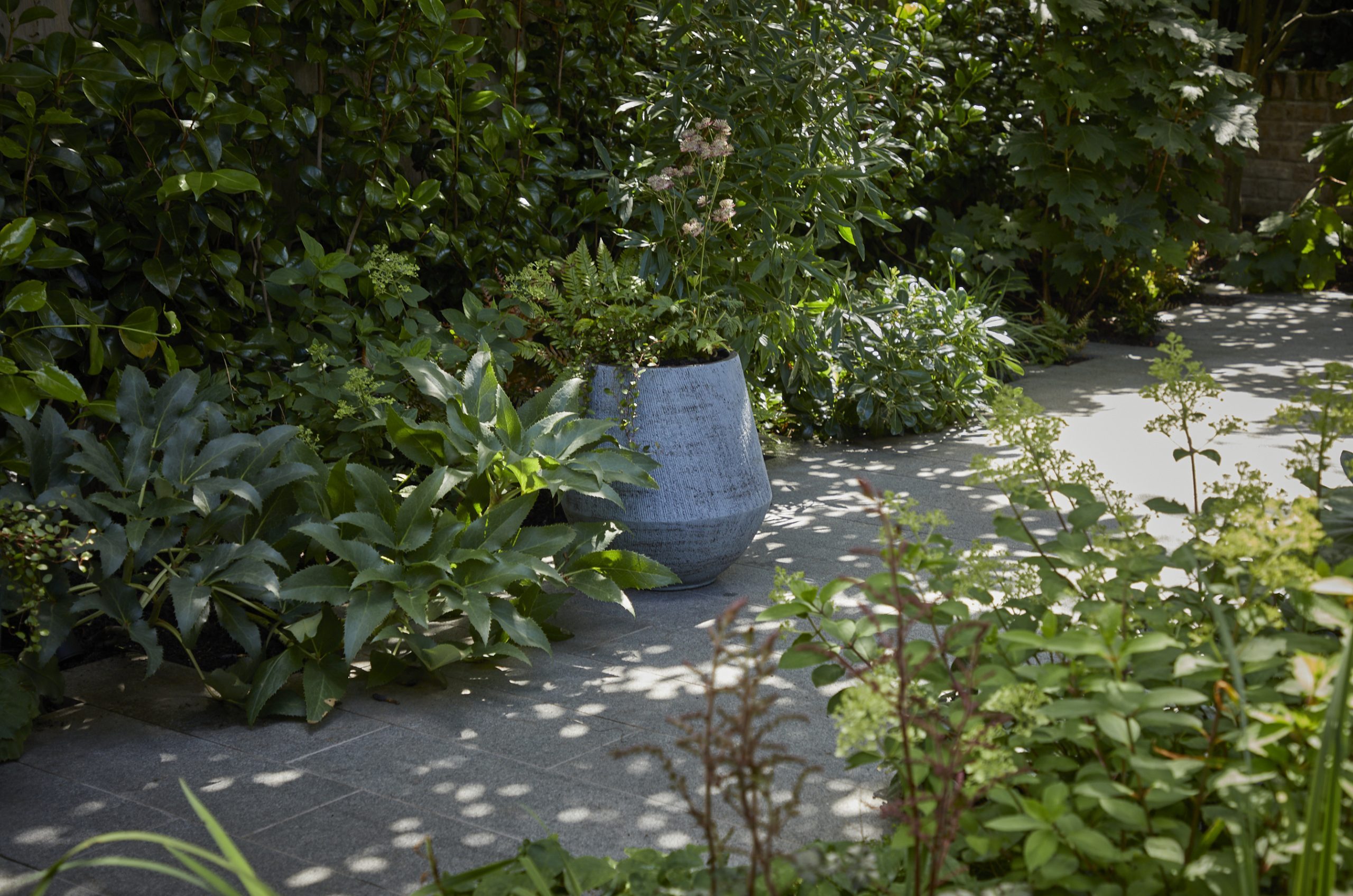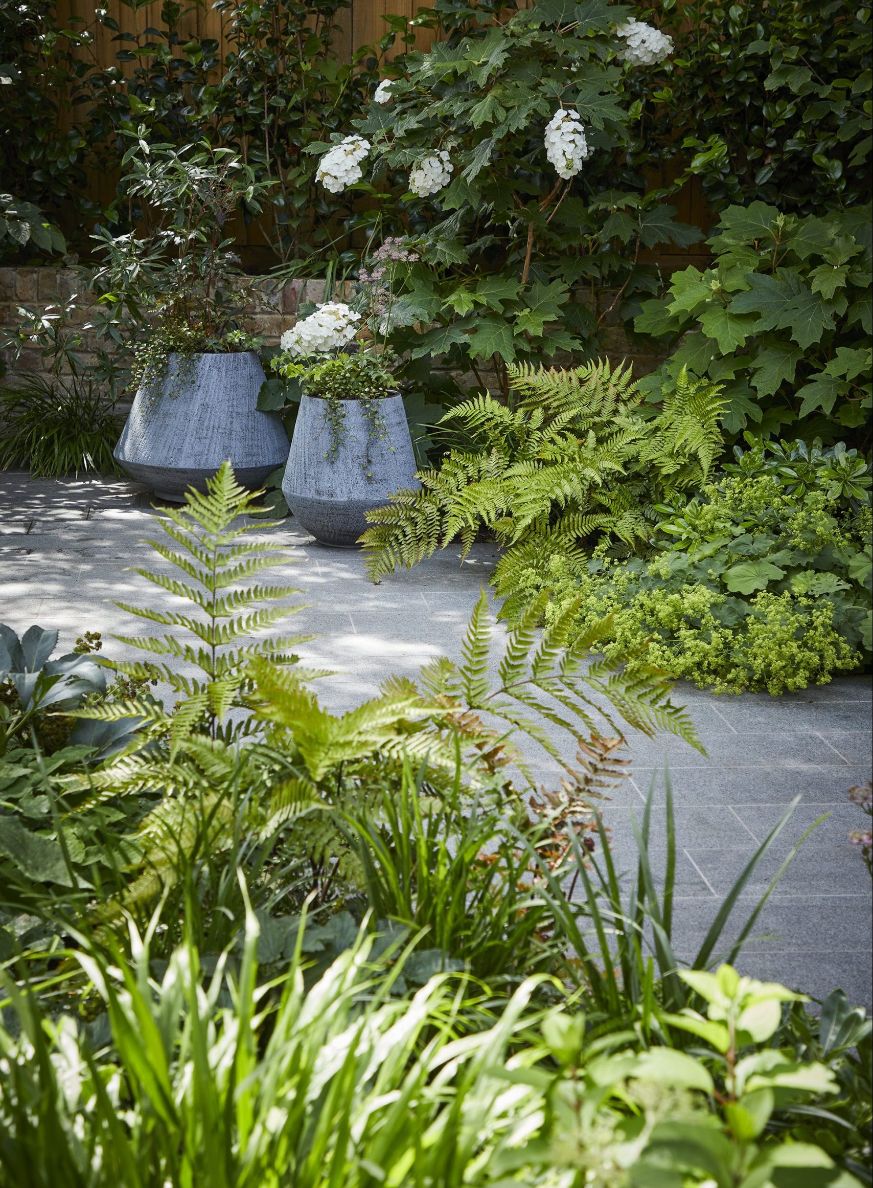 We added to the lush, modern planting in this north-London garden with an array of terracotta pots made in Belgium by Atelier Vierkant. Gun-metal grey, they sit well with the lush green planting and the granite paving.