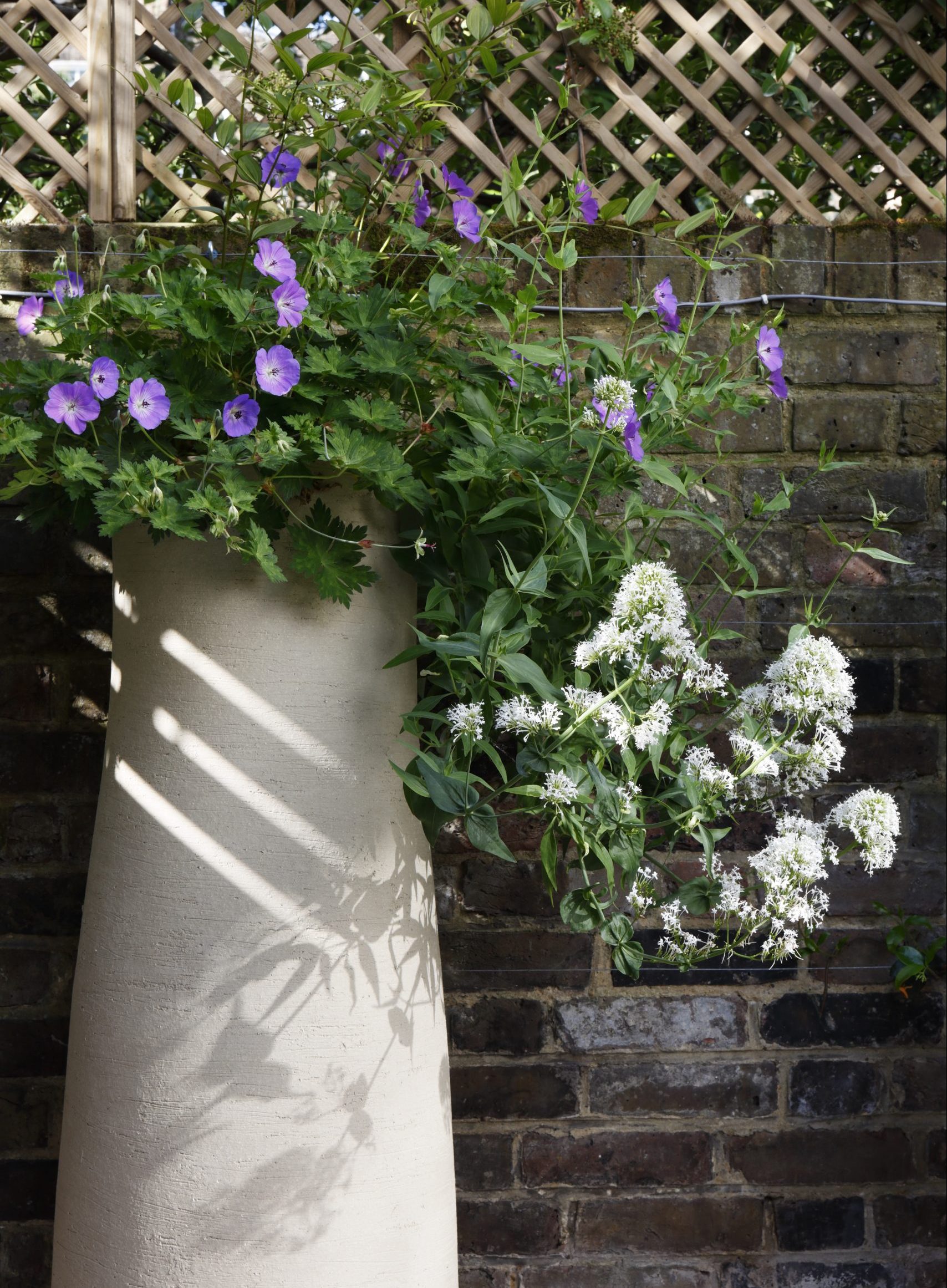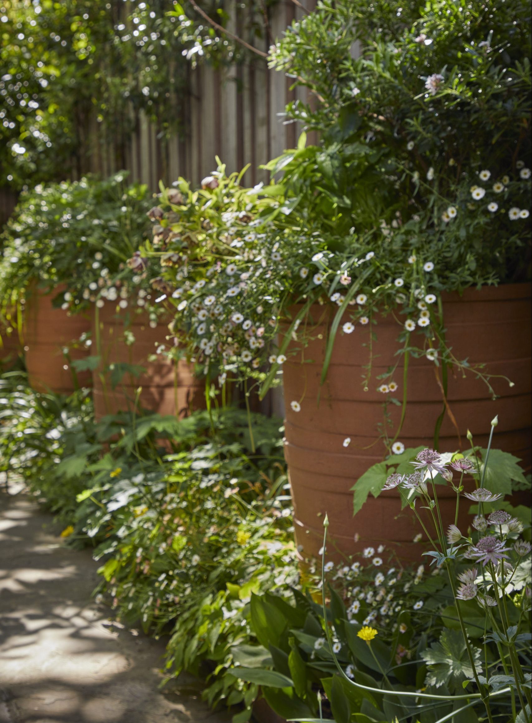 These plump, terracotta pots from Atelier Vierkant were selected to echo the colours of the pendant lights above the table. Overflowing with pale, erigeron daisies, they bring a real sense of comfort and abundance to this informal garden.