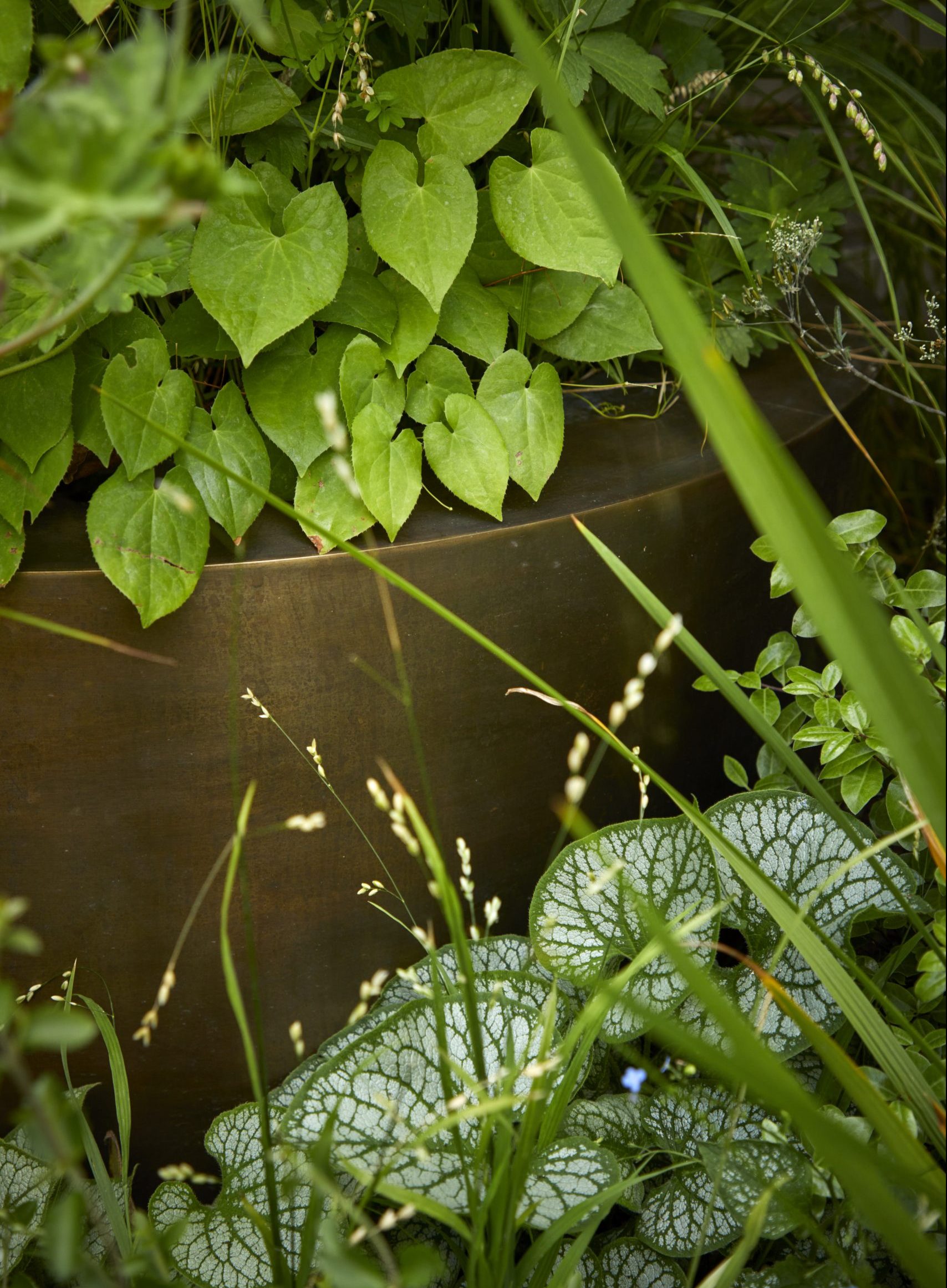 Nestling among the permanent planting, these handmade, weathered-brass pots from Belgium allow us to create a second layer of textures and warm colours in the garden. Made by LVIV to a light-weight design, they can be rearranged to suit seasonal changes in the planting.