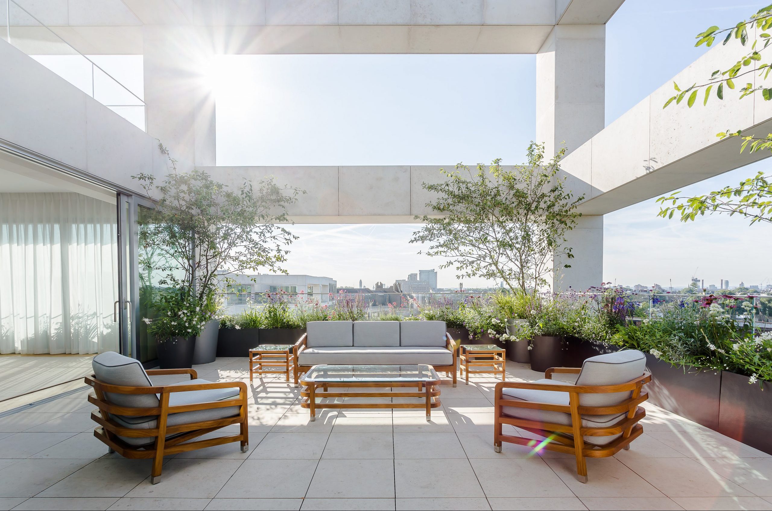 By using pots and planters from Capital Garden Products, we were able to pack this roof terrace in central London with plants, trees and flowers, framing the imposing view with two multi-stem Amelanchier lamarckii.