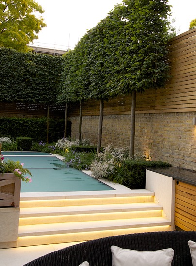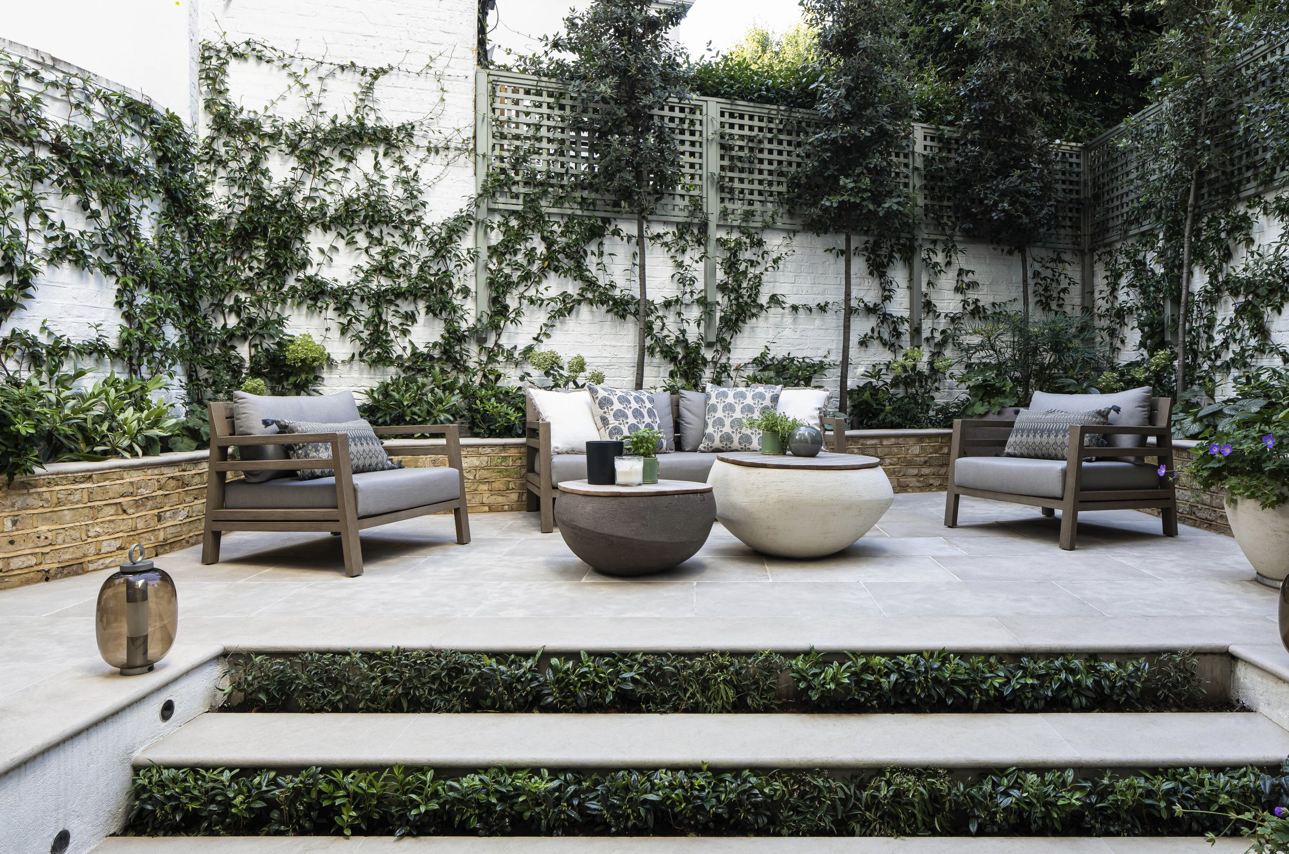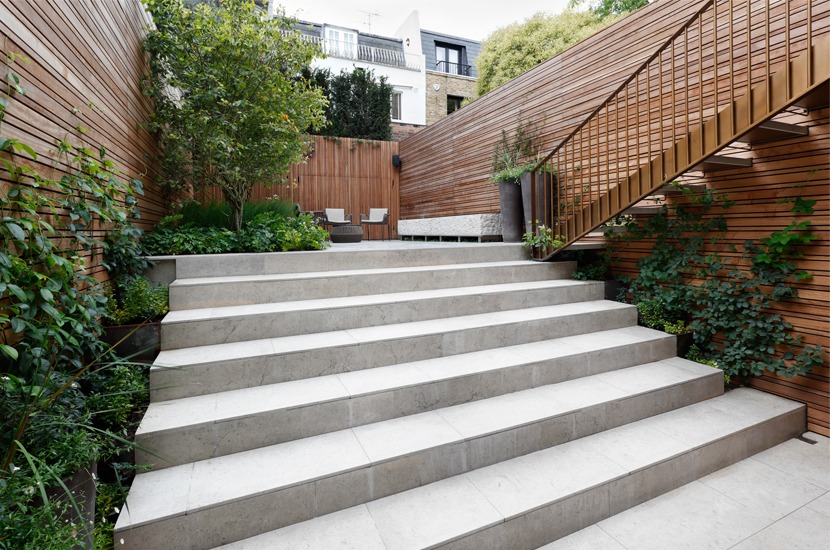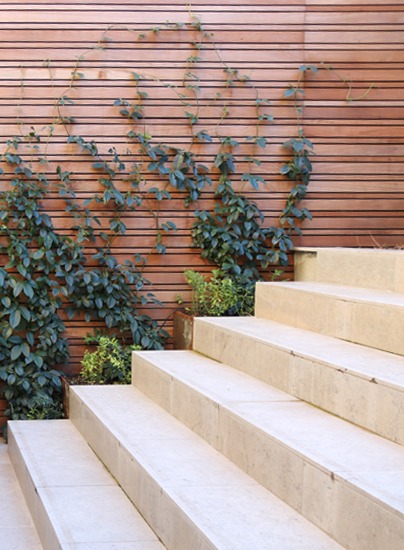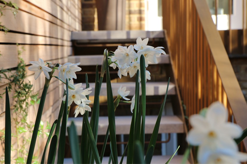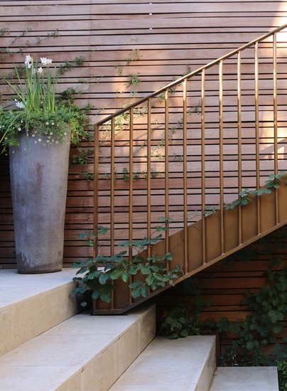Mellow sandstone steps leading to the upper part of this garden are a dominant feature, and a crucial to its structure. This made it especially important to integrate the steps with the overall planting scheme. With this in mind, we allowed space for planting on both sides of the staircase, softening the edges of the steps and connecting the staircase to planting on the upper level. The evergreen jasmine scrambling up from these planting beds to the top of the fence allowed us to blend the lowest and highest points of the garden, creating natural continuity.