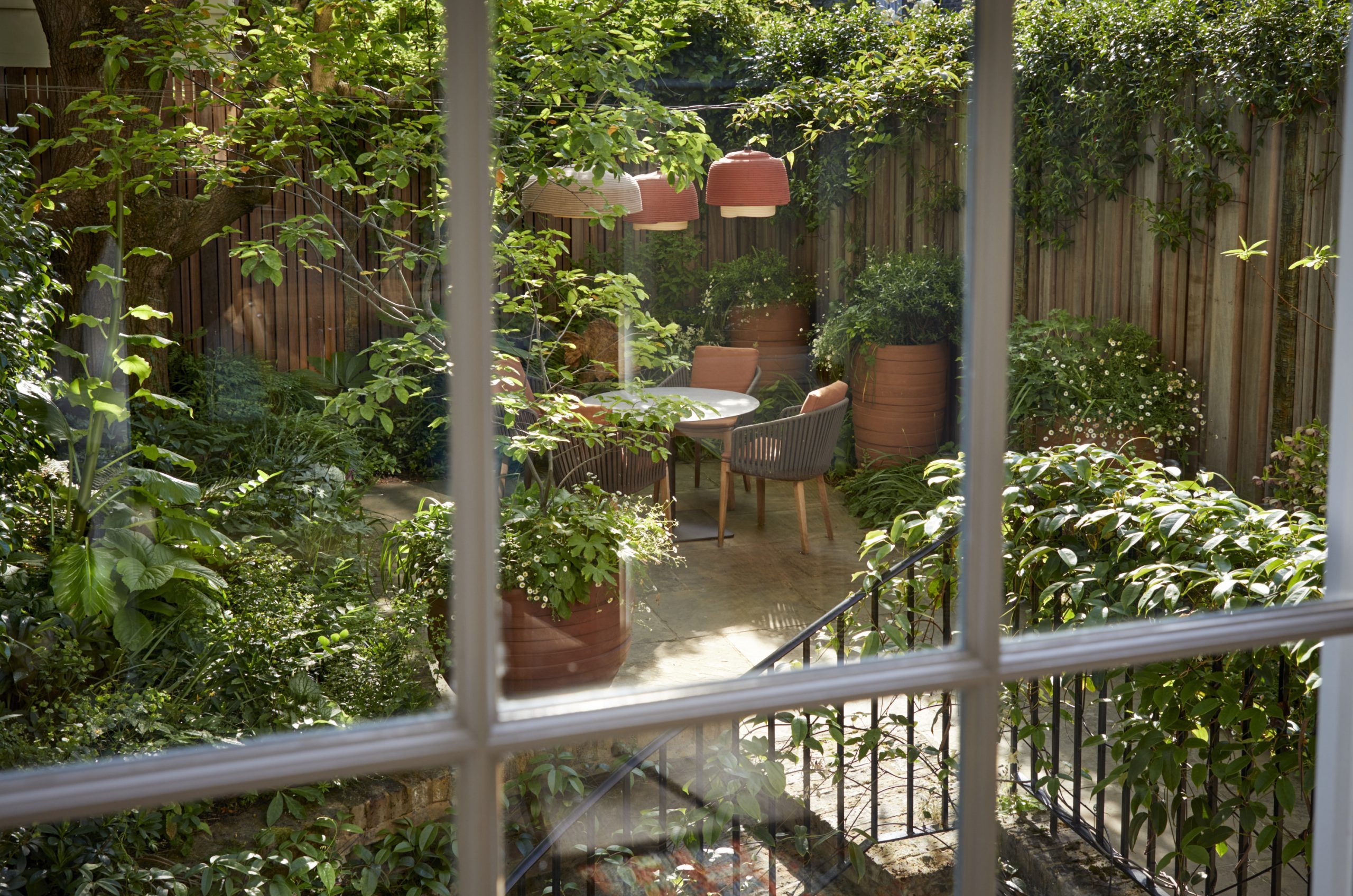 Whether seen from the basement or the ground floor, this garden is dominated by the round table and colourful pendant lights hanging over it. This carefully constructed view draws the eye away from the garden’s narrow boundaries, creating a sense of space.