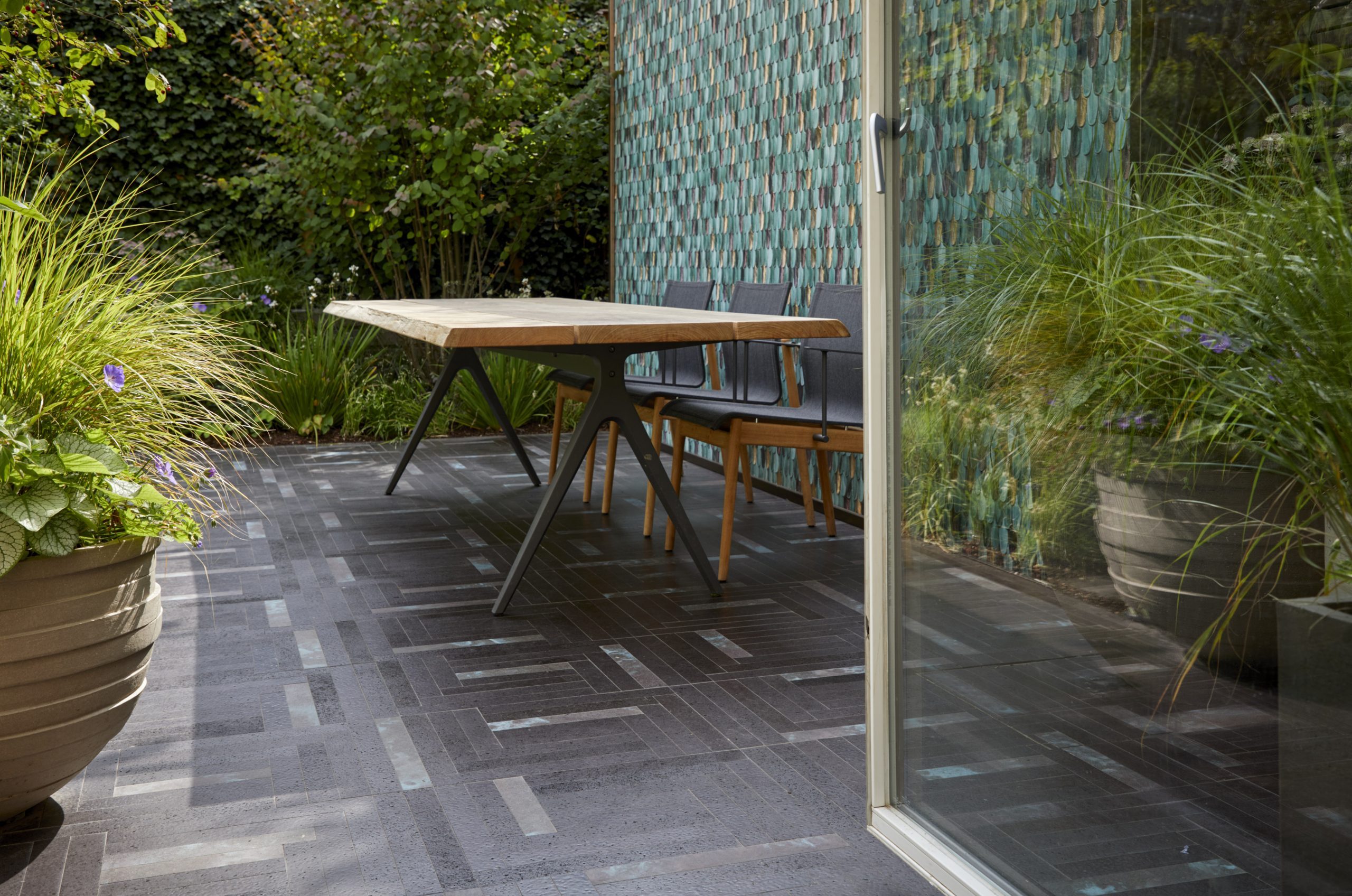 This feature wall is made of subtly coloured, glittering tiles taken from Cristina Celestino’s Plumage collection, produced in Italy by Botteganove. It transforms what was once a dull view from the basement, drawing the eye and tempting us to step outside and sit down at the table.