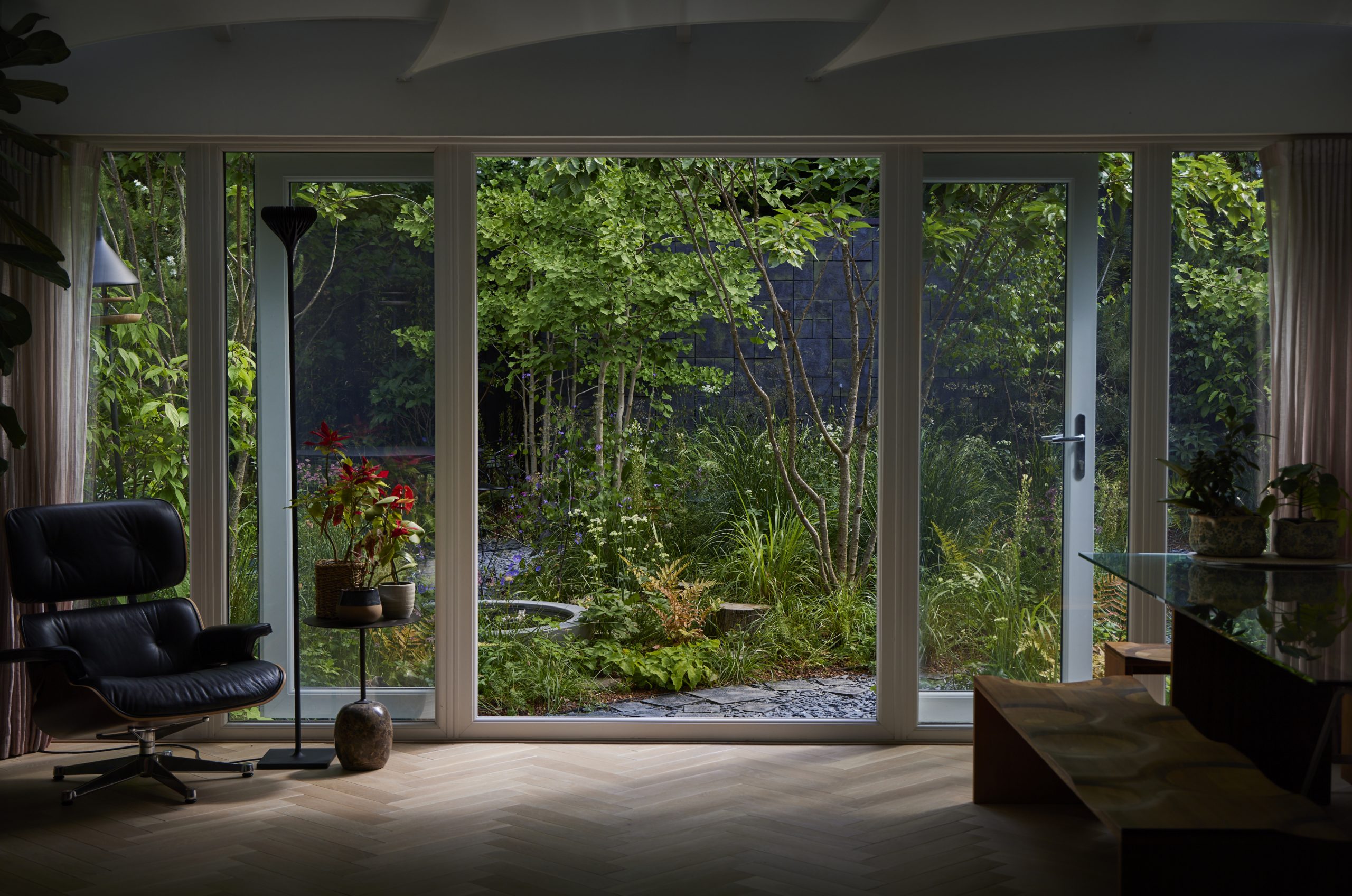 The sliding glass doors hold and frame the view of the captivating garden beyond. As the curtains are drawn back, a theatrical unveiling commences. The garden takes on the role of a grand performer, seamlessly transitioning from season to season. In early spring, delicate spring bulbs make their debut, peeking through the earth. Summer arrives, bringing forth the lush and layered greenery of the woodland garden. Finally, as autumn approaches, the scene crescendos with a breathtaking spectacle of Ginko leaves transforming into vibrant shades of yellow, harmoniously echoing the yellow pots, which now claim centerstage. All of this natural splendour unfolds before your very eyes through this enchanting view.