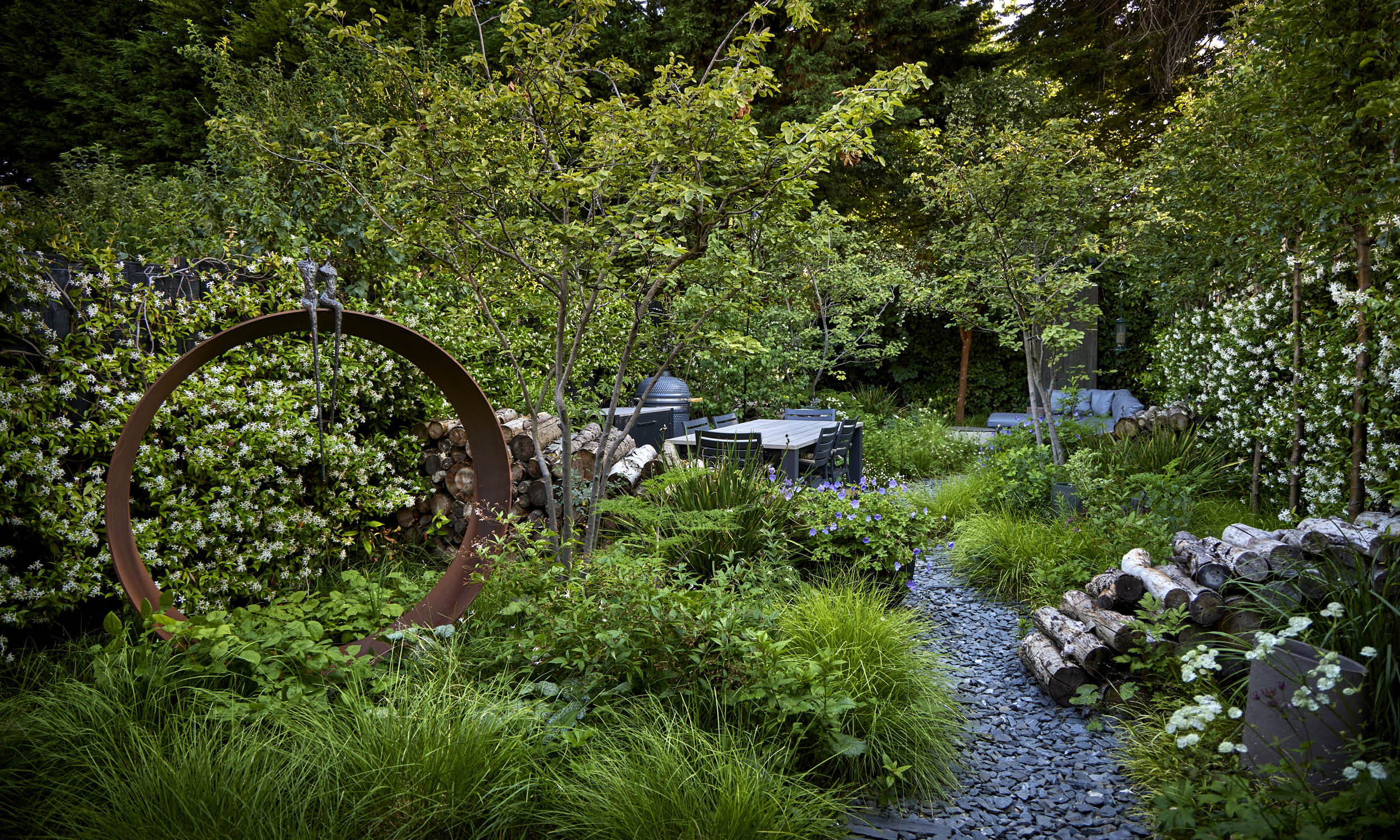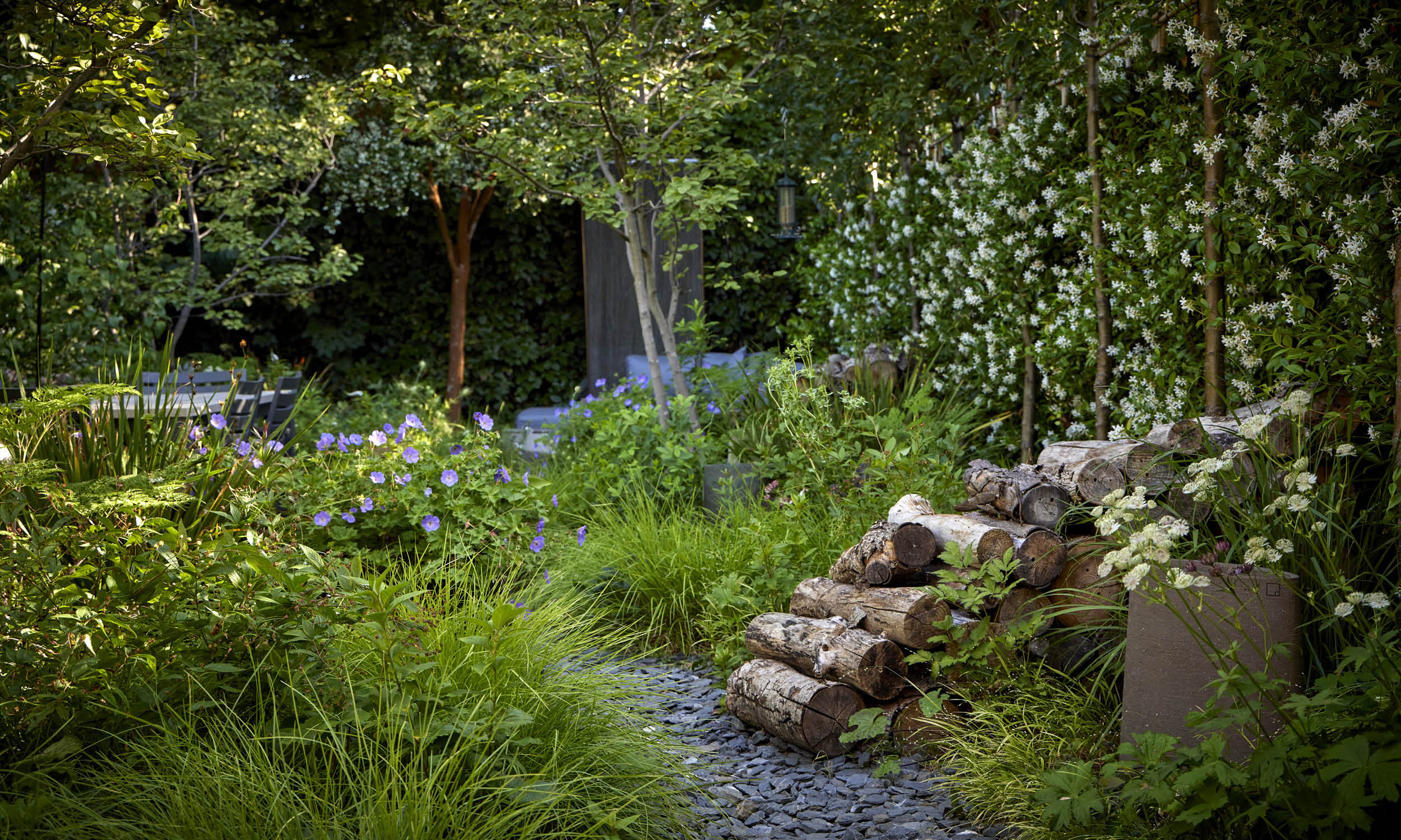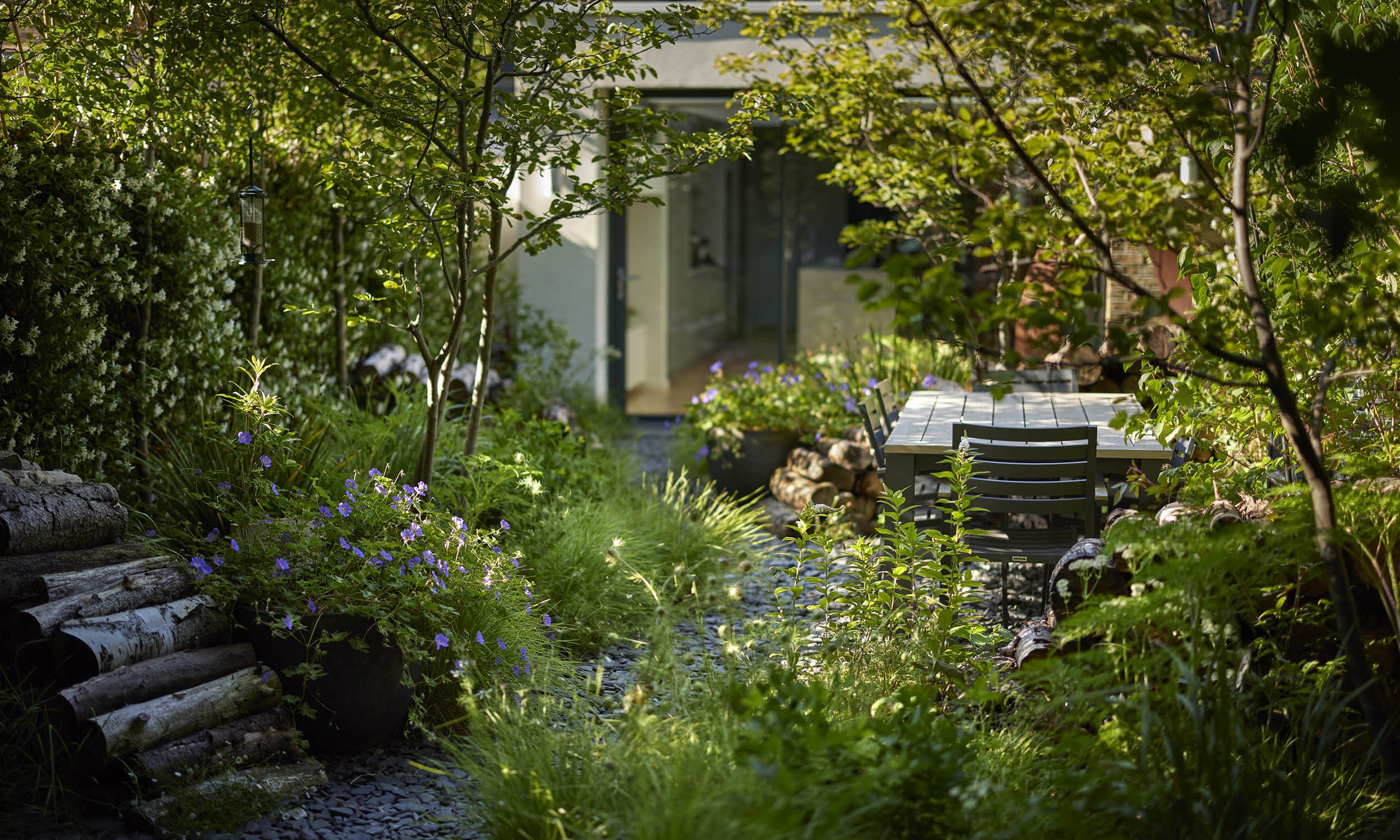 We are always aware of wildlife in the garden, and by using eye-catching log “waves” to separate the beds from the seating and dining areas we have created habitats for garden insects. We also encourage plants to self-seed, allowing love-in-the mist, creeping thyme, Valerian, Cerinthe and the striking Lunaria annua ‘Chedglow’, to make themselves at home in cracks and crevices between the paving slabs.