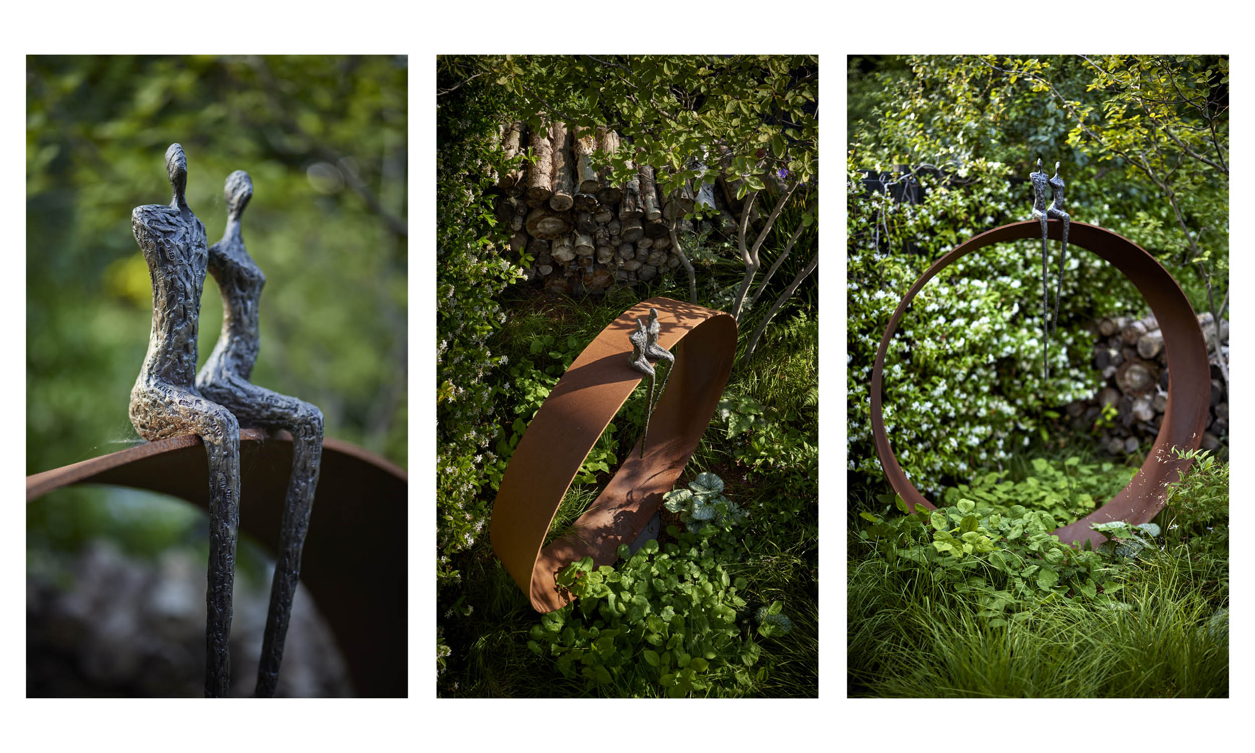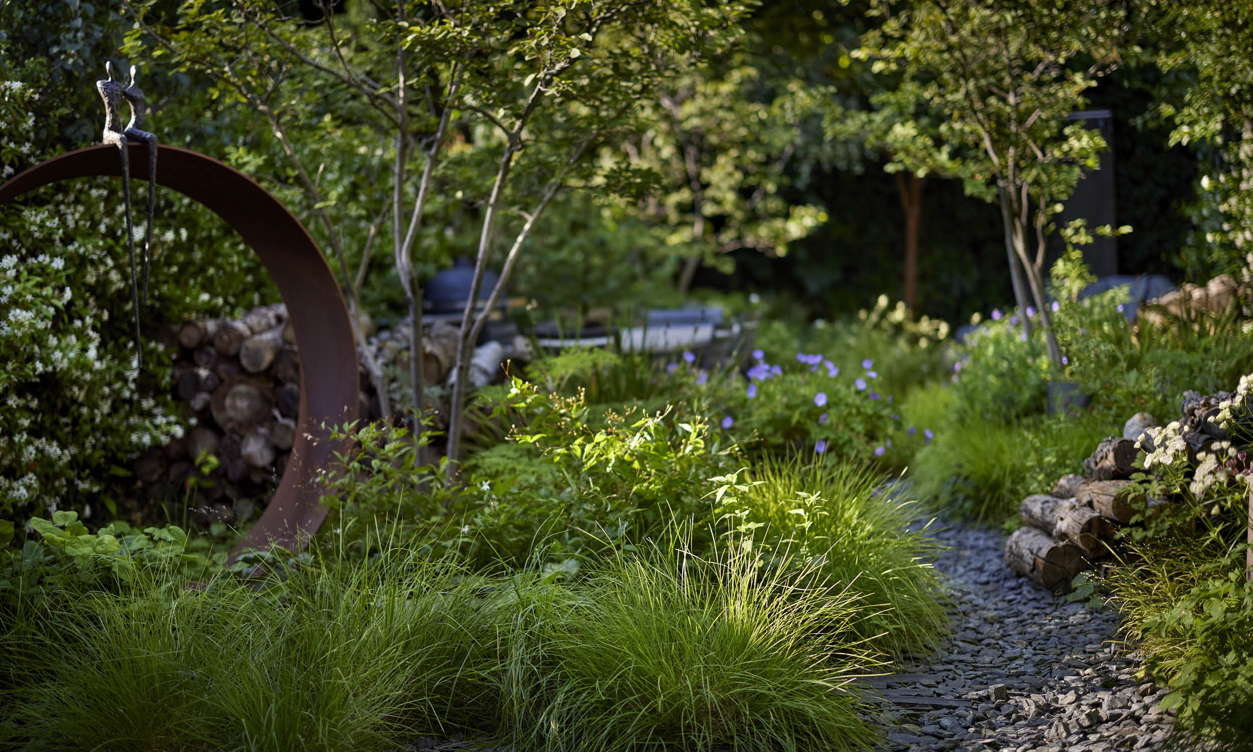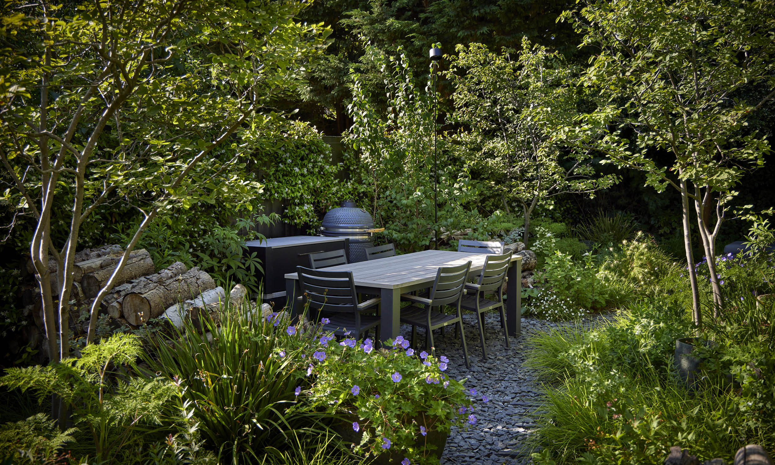We are always aware of wildlife in the garden, and by using eye-catching log “waves” to separate the beds from the seating and dining areas we have created habitats for garden insects. We also encourage plants to self-seed, allowing love-in-the mist, creeping thyme, Valerian, Cerinthe and the striking Lunaria annua ‘Chedglow’, to make themselves at home in cracks and crevices between the paving slabs.