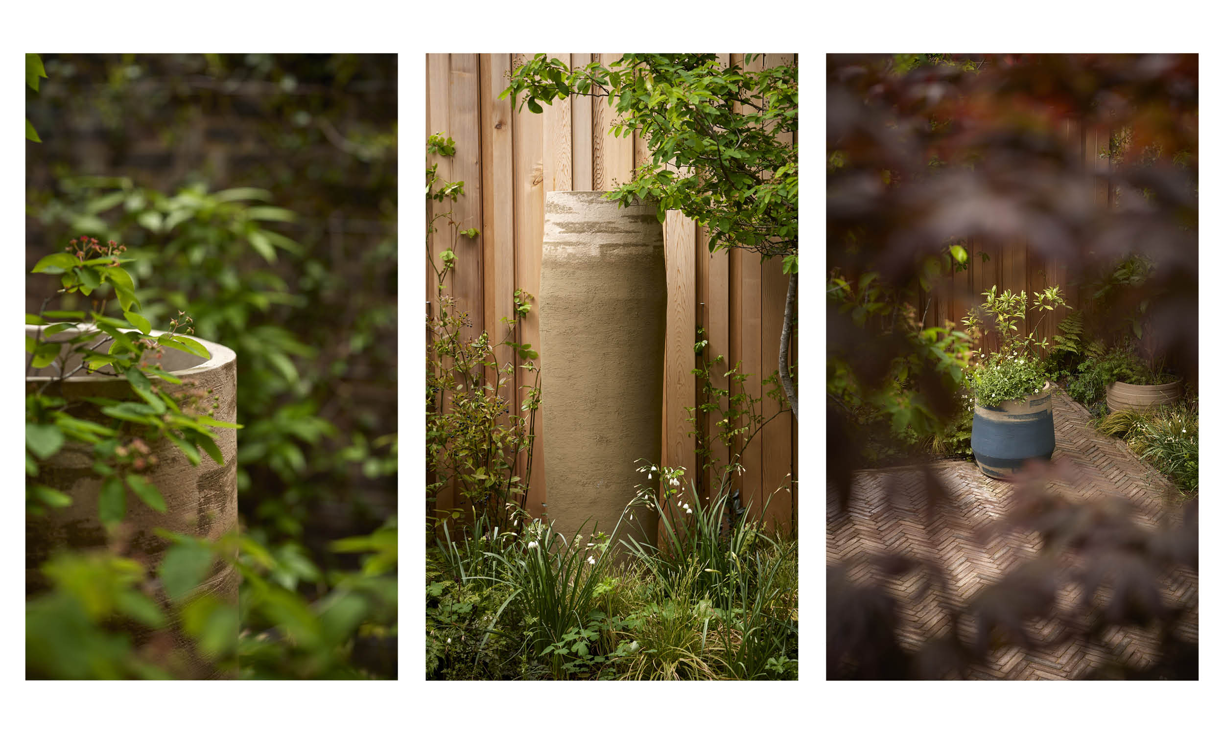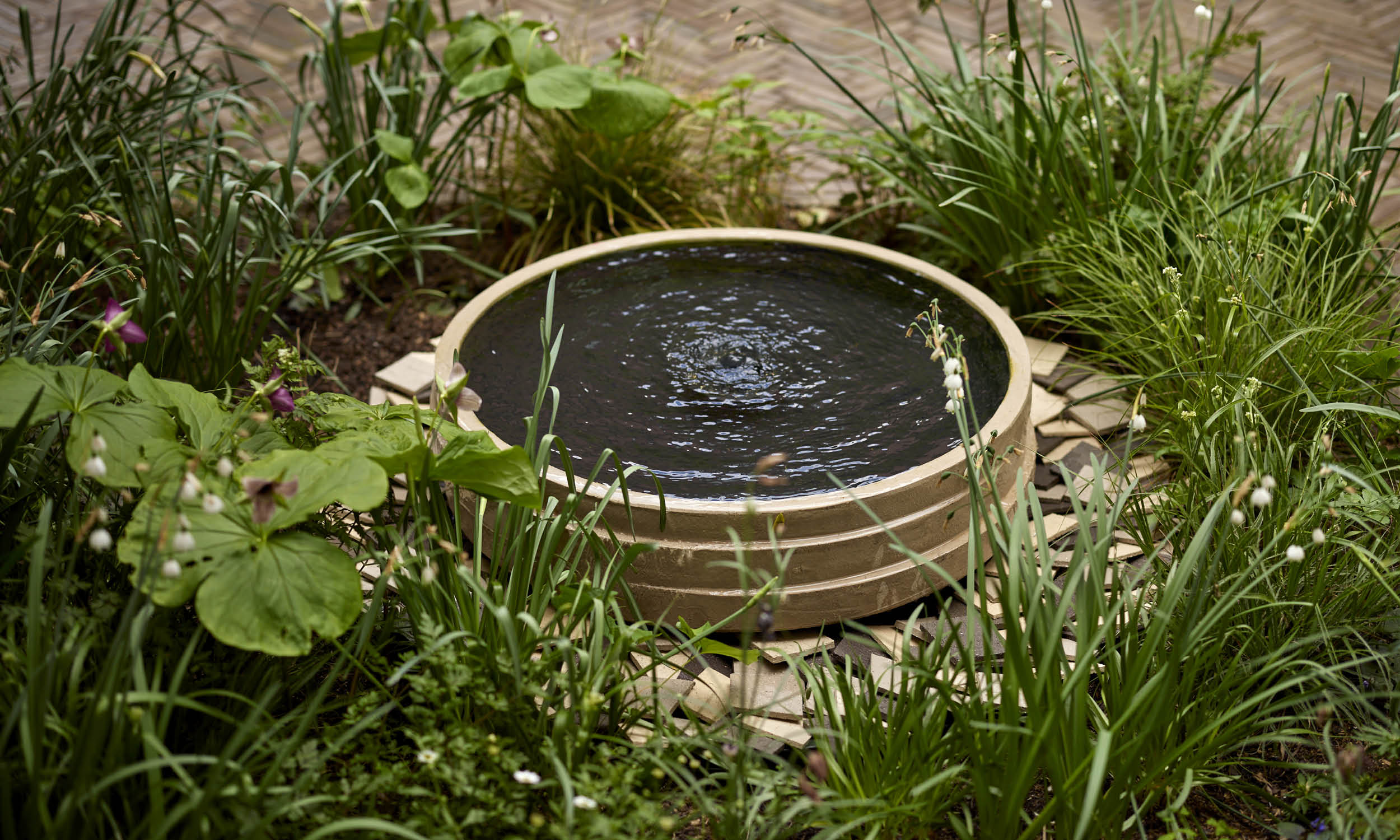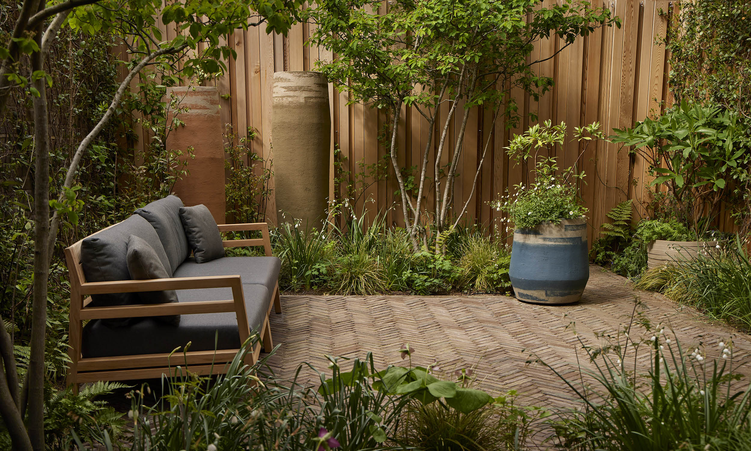 We mirrored the mellow tone of the garden wall in handmade bricks from Vande Moortel in Belgium, laying them in a herringbone pattern to create a path leading to a terrace at the garden’s far end. We made this terrace into a generous seating area by installing an L-shaped Ethimo sofa. The greys and blues of its upholstery and cushions marry with the colours of Gigi, an Atelier Vierkant pot placed like a punctuation mark at the sofa’s end. Planted with dwarf irises, Geranium ‘Rozanne’ and sweet-scented Daphne, Gigi resonates in its turn with the blues of a favourite painting hanging in the kitchen overlooking the garden. Pots by the same maker stand tall behind the sofa, and against the fence in one of the beds. Unplanted, their flowing contours draw the eye like sculptures in the garden. We converted a fifth Atelier Vierkant pot into a simple fountain, to fill the area immediately below the steps from the house with flashes of reflected light and gentle sounds.
