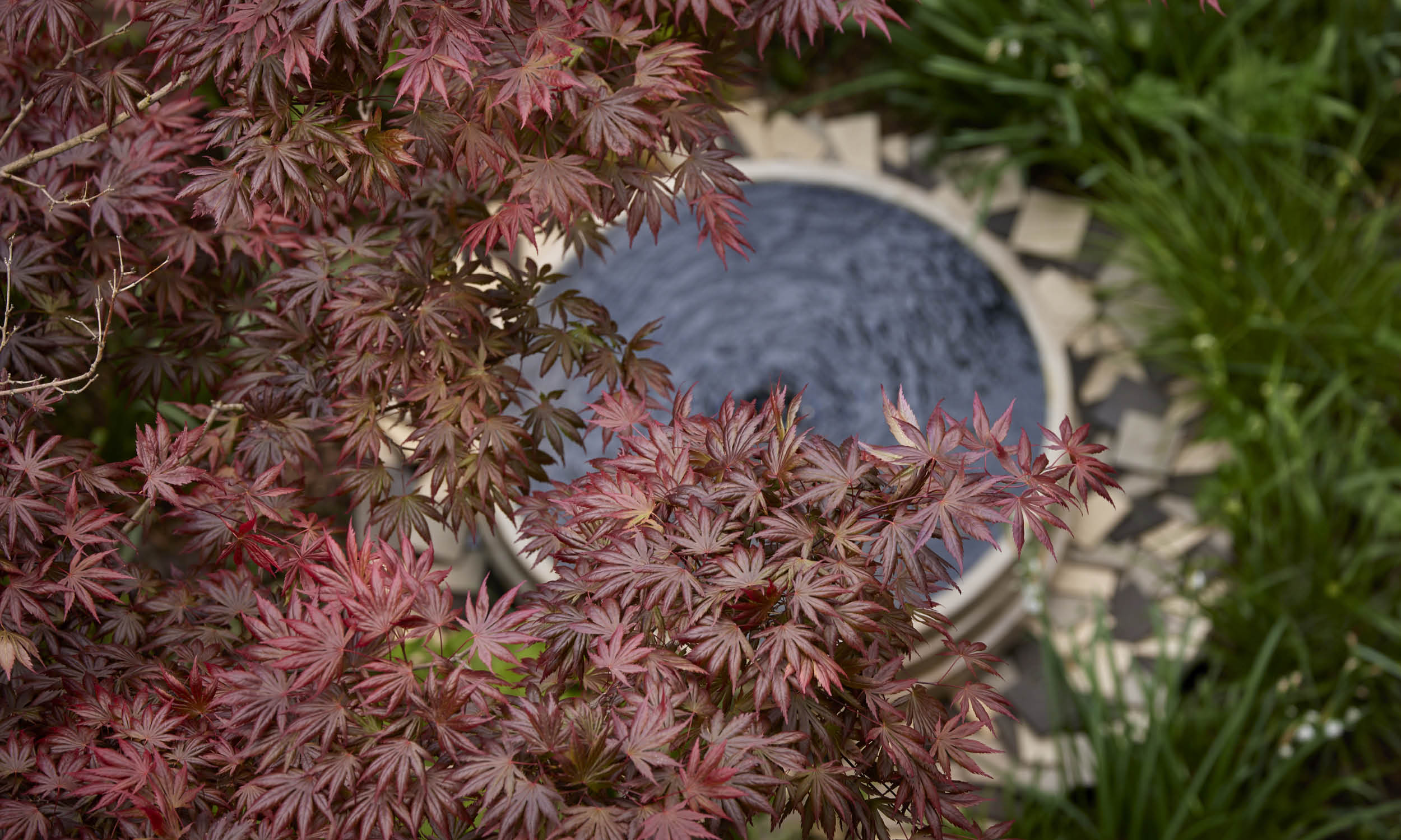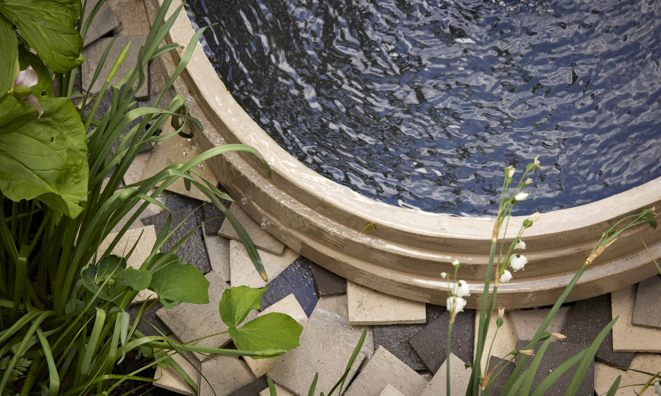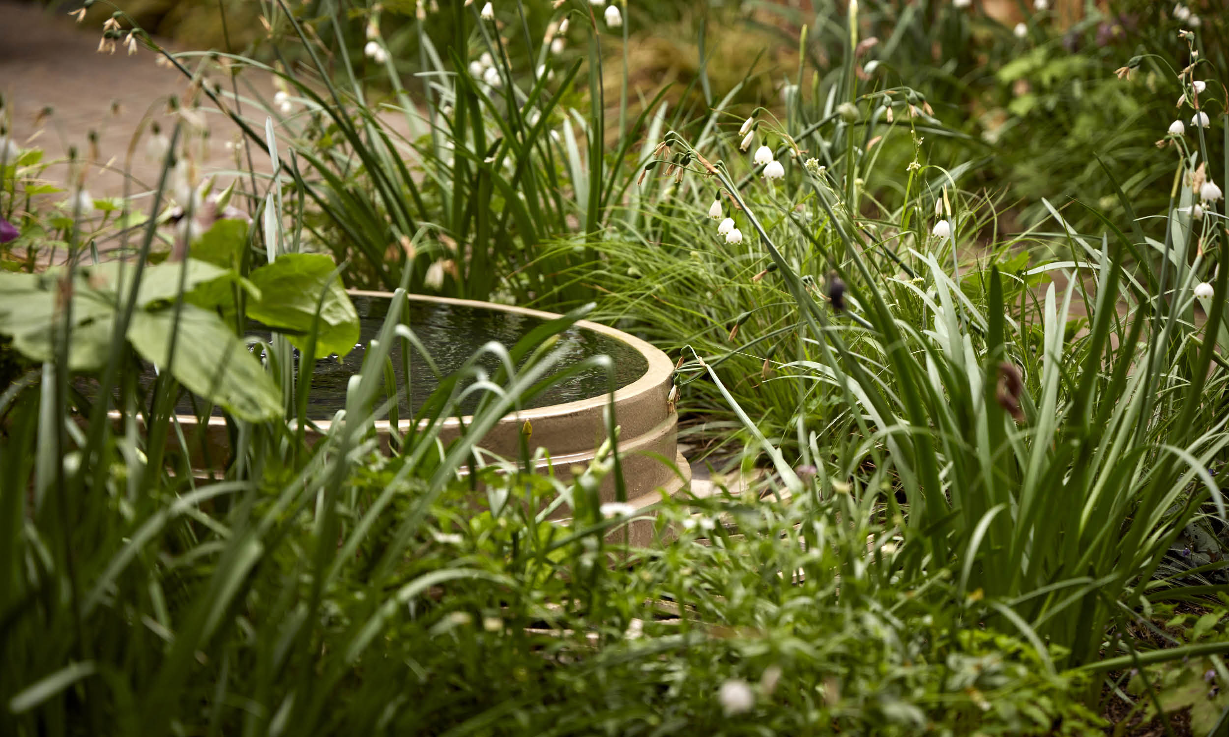 We mirrored the mellow tone of the garden wall in handmade bricks from Vande Moortel in Belgium, laying them in a herringbone pattern to create a path leading to a terrace at the garden’s far end. We made this terrace into a generous seating area by installing an L-shaped Ethimo sofa. The greys and blues of its upholstery and cushions marry with the colours of Gigi, an Atelier Vierkant pot placed like a punctuation mark at the sofa’s end. Planted with dwarf irises, Geranium ‘Rozanne’ and sweet-scented Daphne, Gigi resonates in its turn with the blues of a favourite painting hanging in the kitchen overlooking the garden. Pots by the same maker stand tall behind the sofa, and against the fence in one of the beds. Unplanted, their flowing contours draw the eye like sculptures in the garden. We converted a fifth Atelier Vierkant pot into a simple fountain, to fill the area immediately below the steps from the house with flashes of reflected light and gentle sounds.