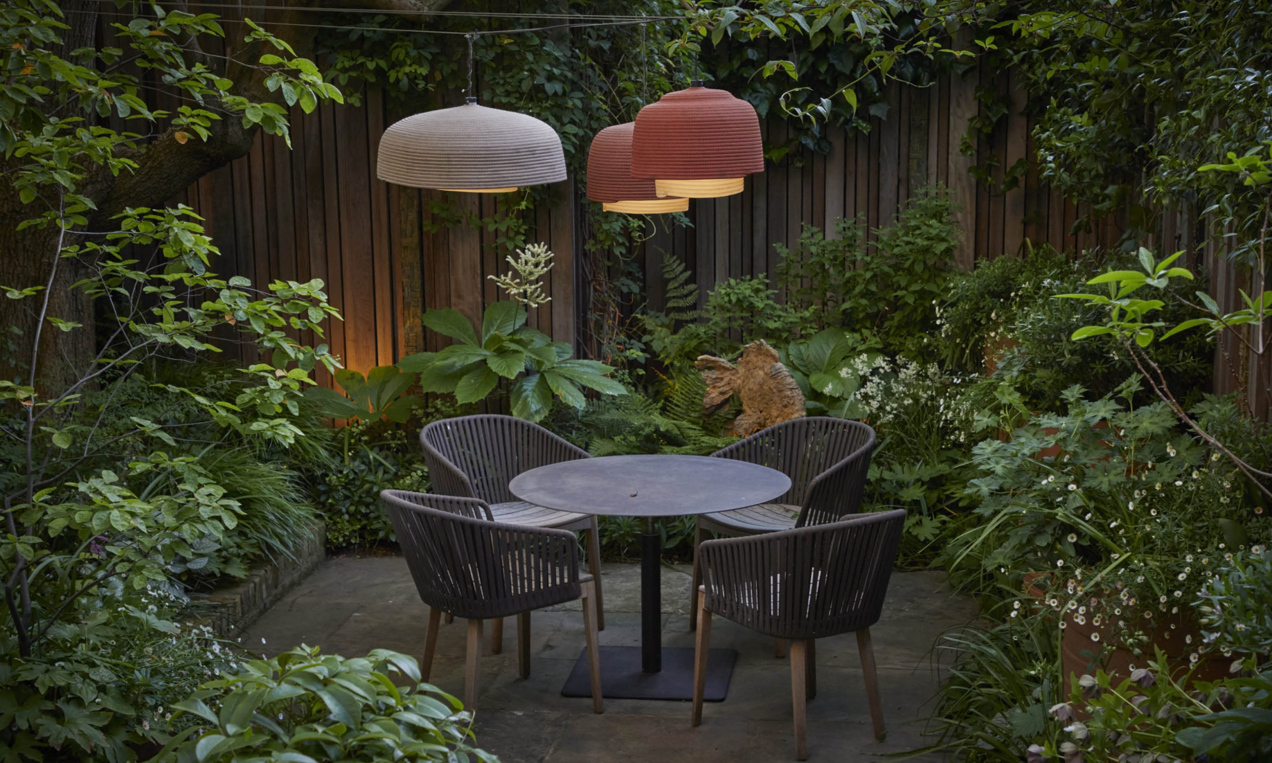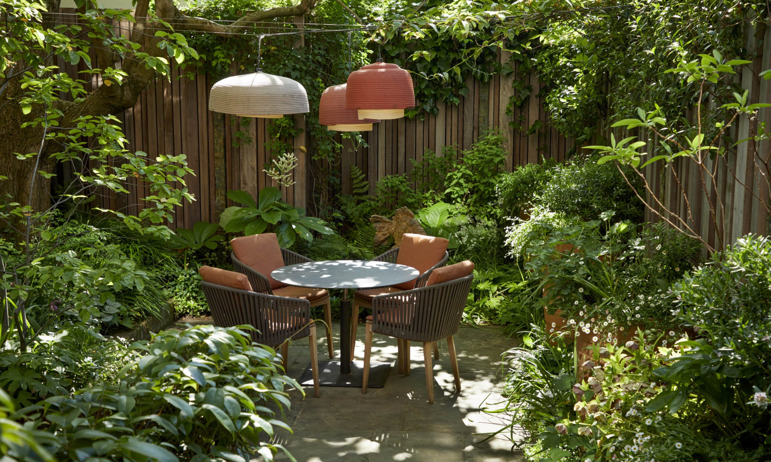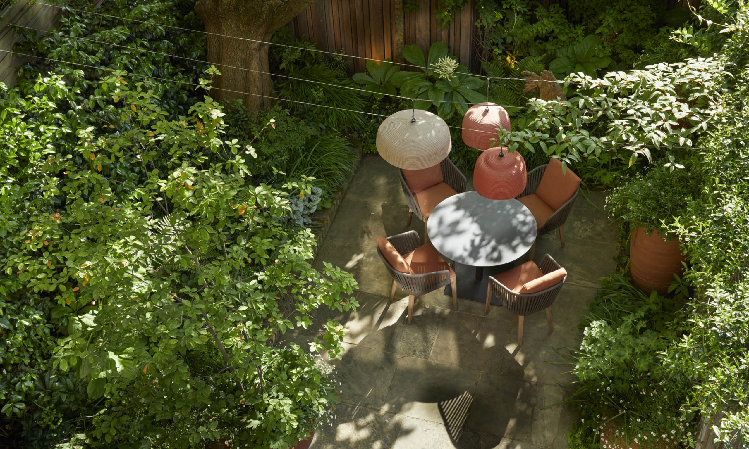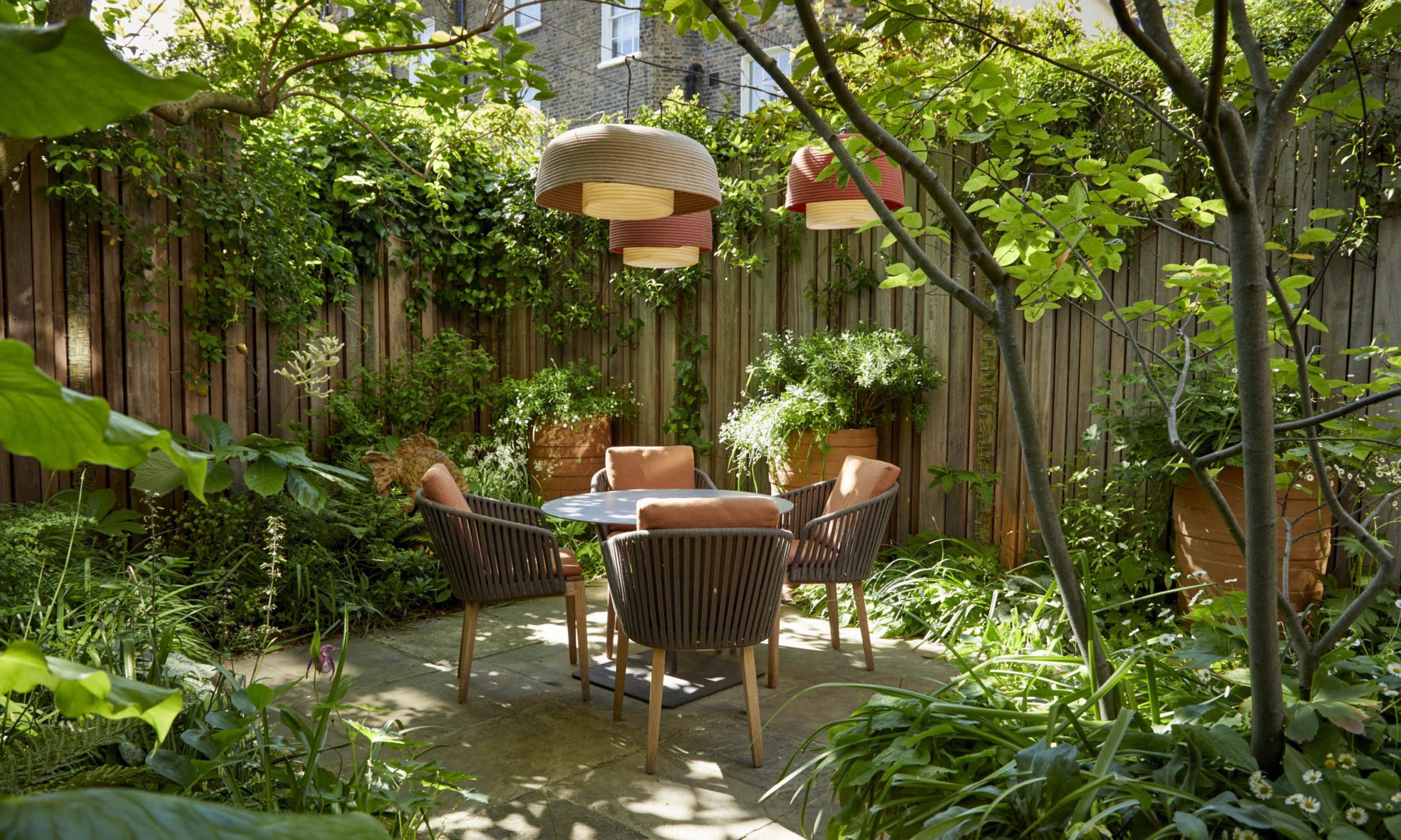 In the shade of a large Catalpa tree on the left hand side, we will plant shade-loving perennials. And beyond the tree there will be a circular table, illuminated at night by pendant lights. The rest of the garden will be lit by spike lights, positioned to highlight pots, trees, paths and other important features.