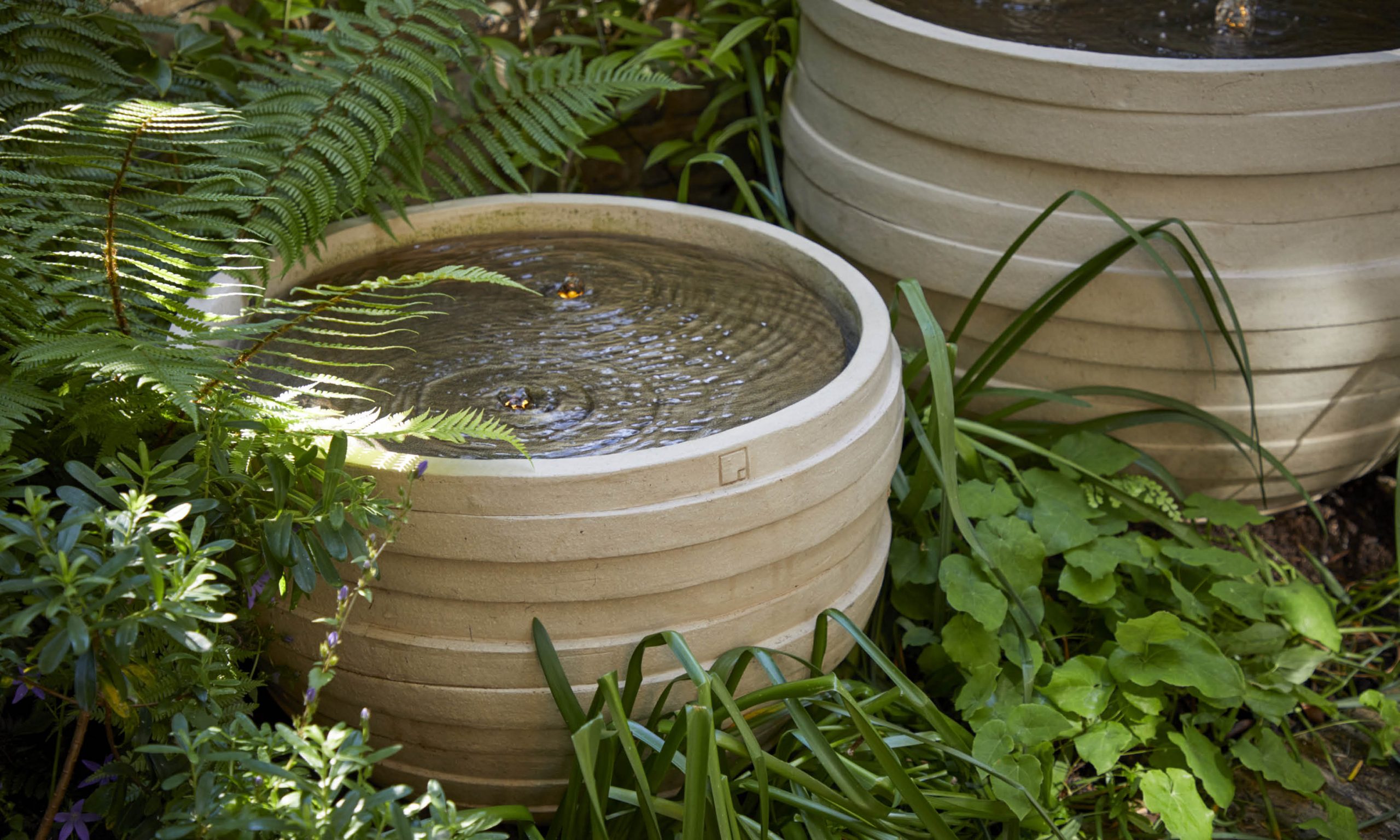 A multi stemmed, flowering tree in a pot will frame the top of the steps to the basement, where our client has his office desk overlooking the garden. Here we will transform an existing pool into a flowerbed, filling it with the same shade loving plants that we have used at street level. Two pots, also similar to the ones upstairs, will create a new water feature with gentle vertical jets that will be illuminated at night.