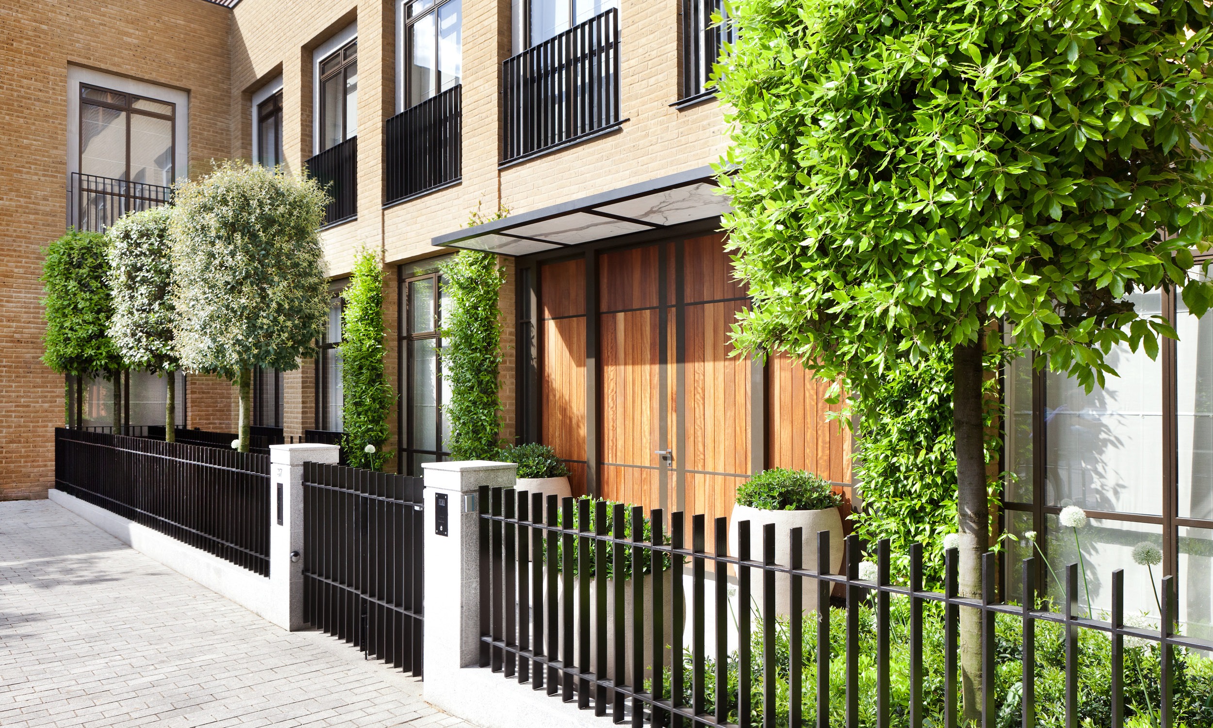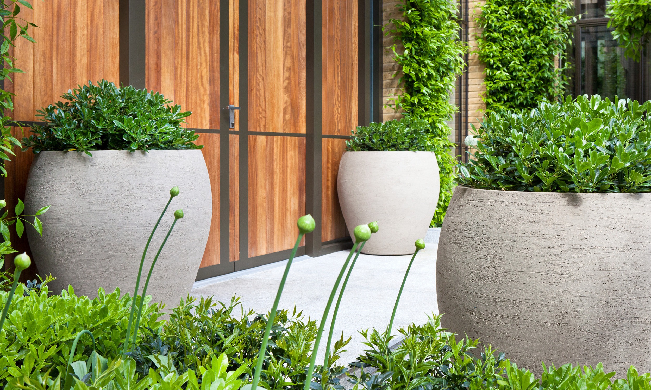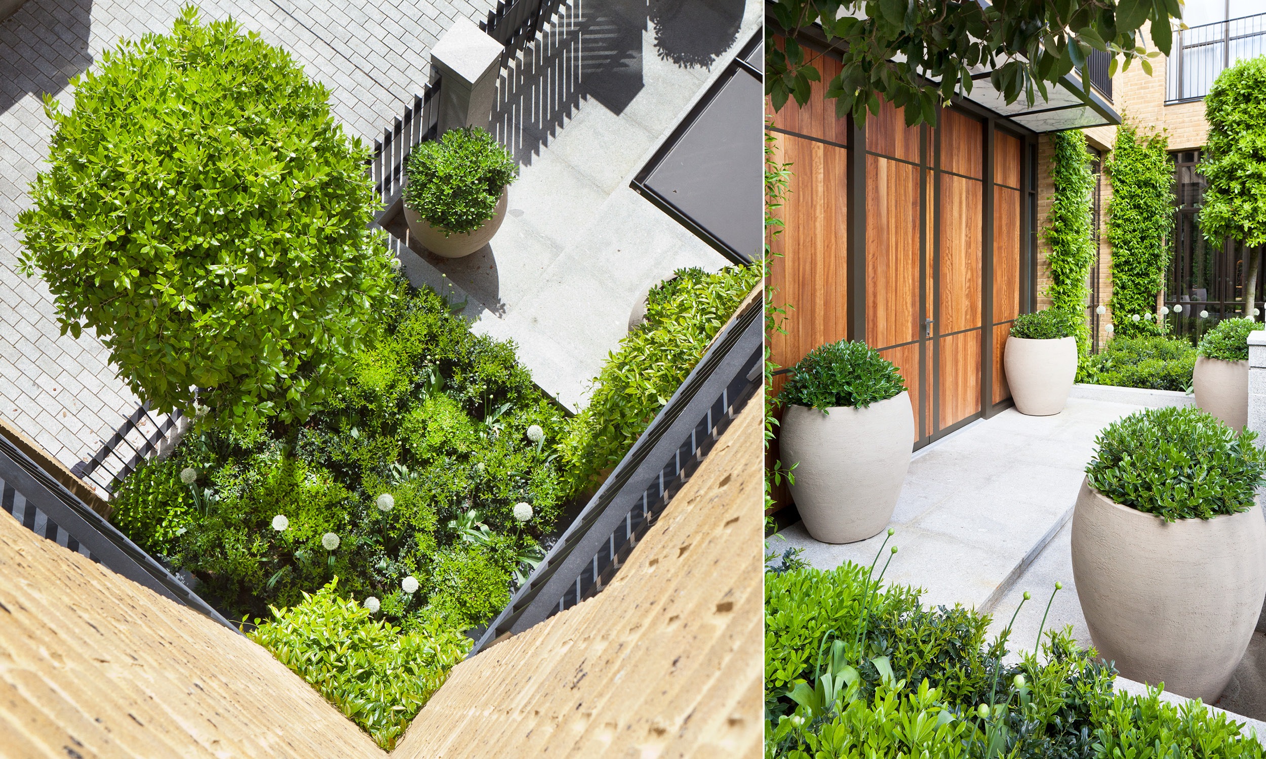 Visitors to this newly built family house in Chelsea are greeted by impressive sentinels of clipped Quercus ilex. As they approach the front door they can’t fail to notice the scent of Sarcococca confusa in winter and that of Pittosporum tobira nanum in summer. This evergreen theme continues behind the house, a space framed by the expansive glass door of the kitchen. Here a vibrant green wall encloses one side of the courtyard and Trachelospermum jasminoides covers the other walls. The contours are softened further by the extension of existing planting beds to merge with the paving, and the scent of jasmine combines with the sound of moving water to evoke images of ancient Arabic gardens. Rills flow down the walls into horizontal channels that eventually intersect, linking the vertical and horizontal planes of the garden, while specially designed bronze-finish strip lights softly illuminate the space at night, creating another visual link between the vertical surfaces of the walls.