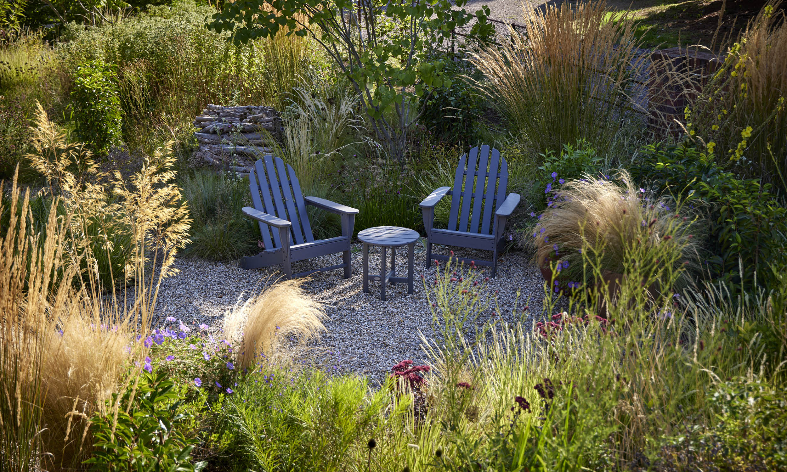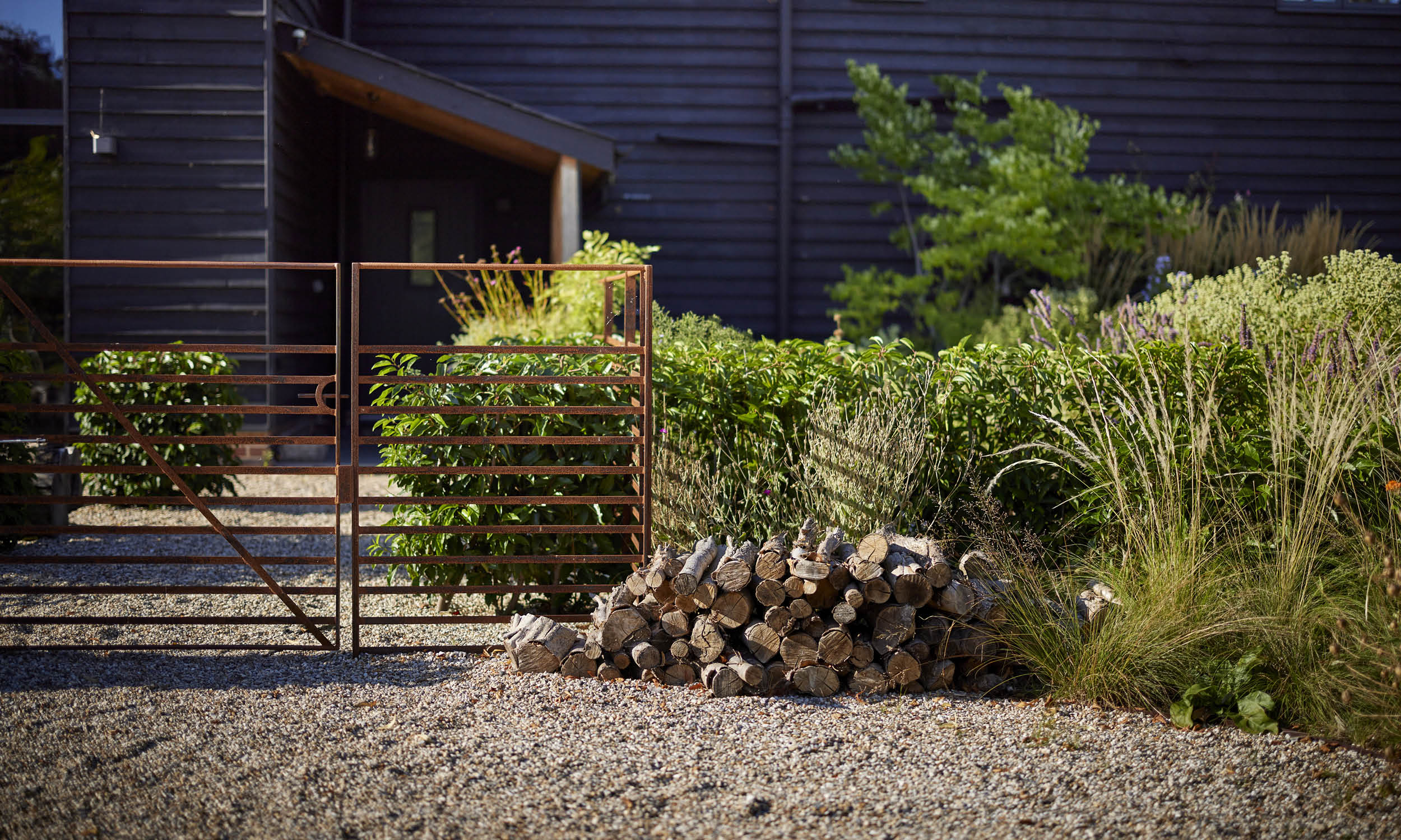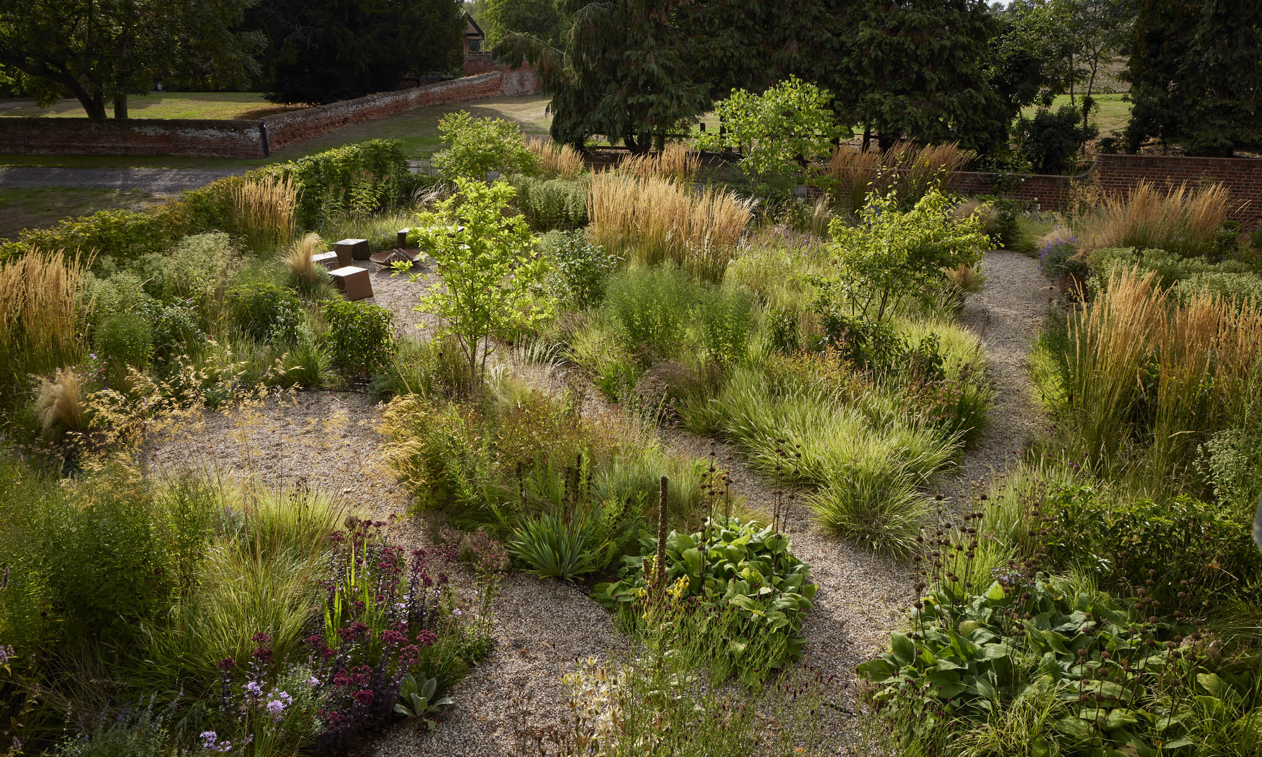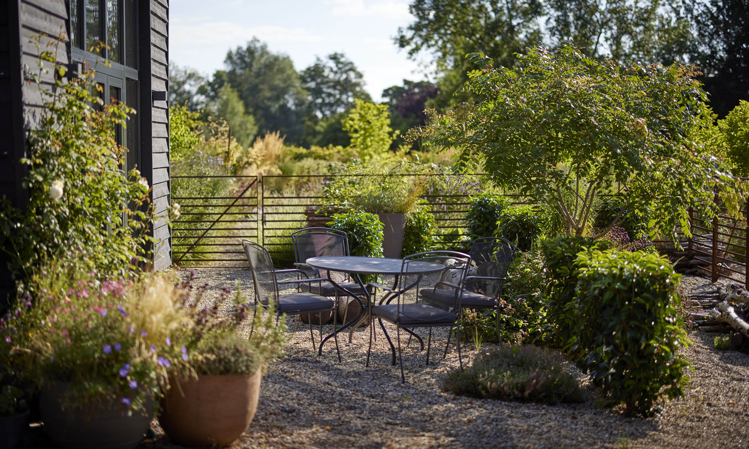 The site is crossed by meandering gravel paths leading to three areas – one created for sunbathing, one centred on the fire pit, and another on a sunny spot conceived for enjoying a morning coffee.