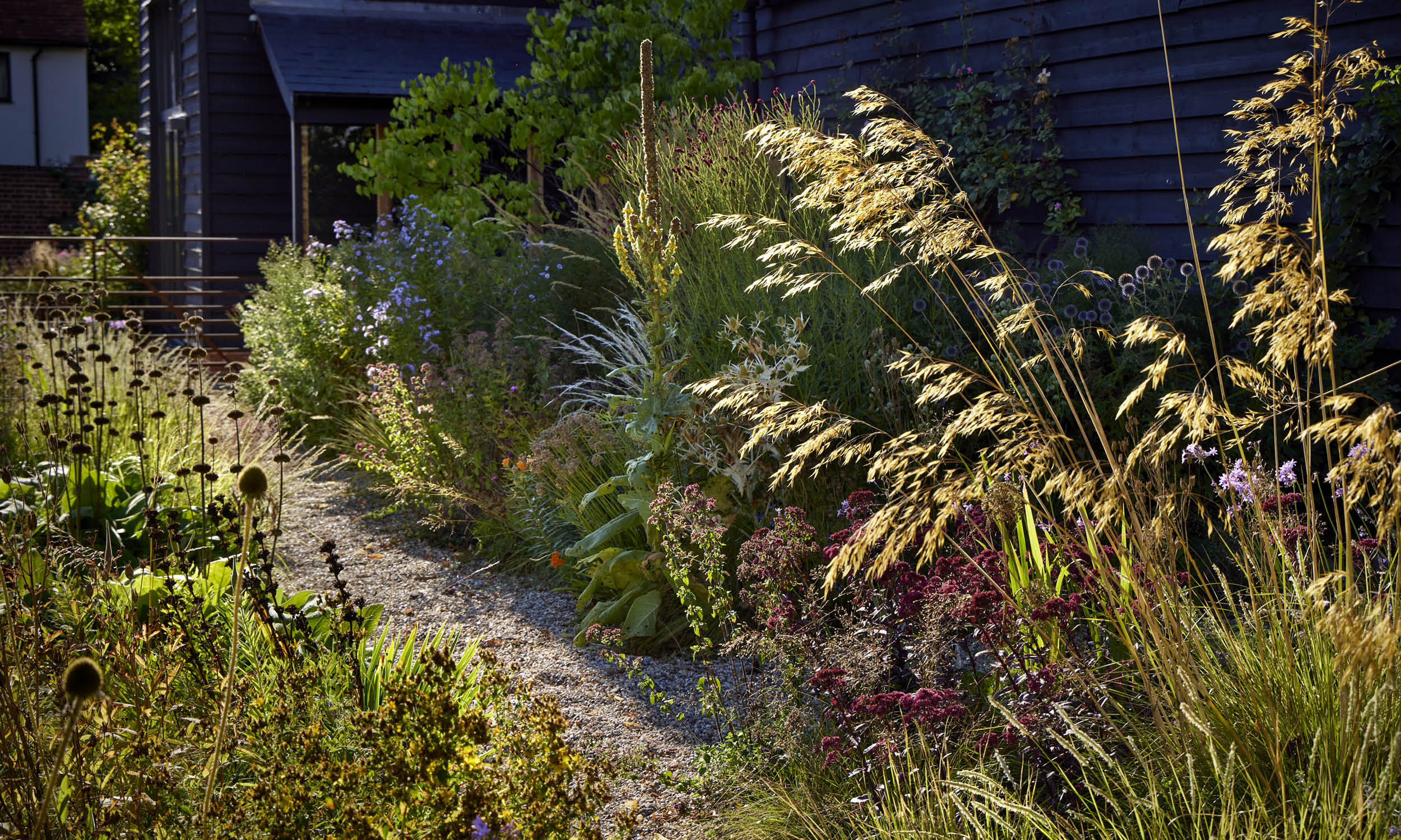 We have replaced the lawn with a substantial area of perennial planting that is guaranteed to attract birds, butterflies and beneficial insects. Two grasses – Sesleria autumnalis and Sporobolus heterolepis – dominate, unifying the design and creating the matrix into which we have blended sheets of bulbs and over a thousand perennials, ensuring interest from end to end of the year.