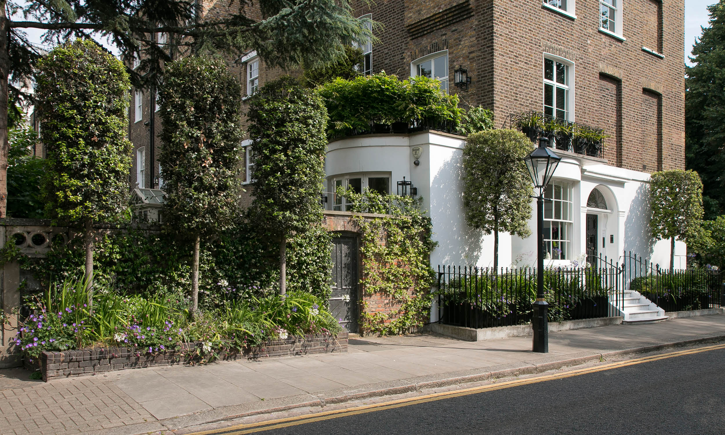 While we were completing the courtyard area of the project (Please refer to the Alexander square – Courtyard) we saw the opportunity of greening up the front of the property by removing the invasive bamboo which was planted where the 3 Quercus ilex are not located and installing bespoke planters on either side of the main door in order to make the most out of the space which is enclosed by the railings. The only plants which were kept from the front before our intervention are the two Quercus ilex which were moved out from the small timber pot in which they were planted and moved in to the new long metal planters. Both the planting bed under the 3 Quercus ilex and the one on either side of the main entrance are planted with evergreen shrubs as well as perennials in order to provide interest and scent all year around.