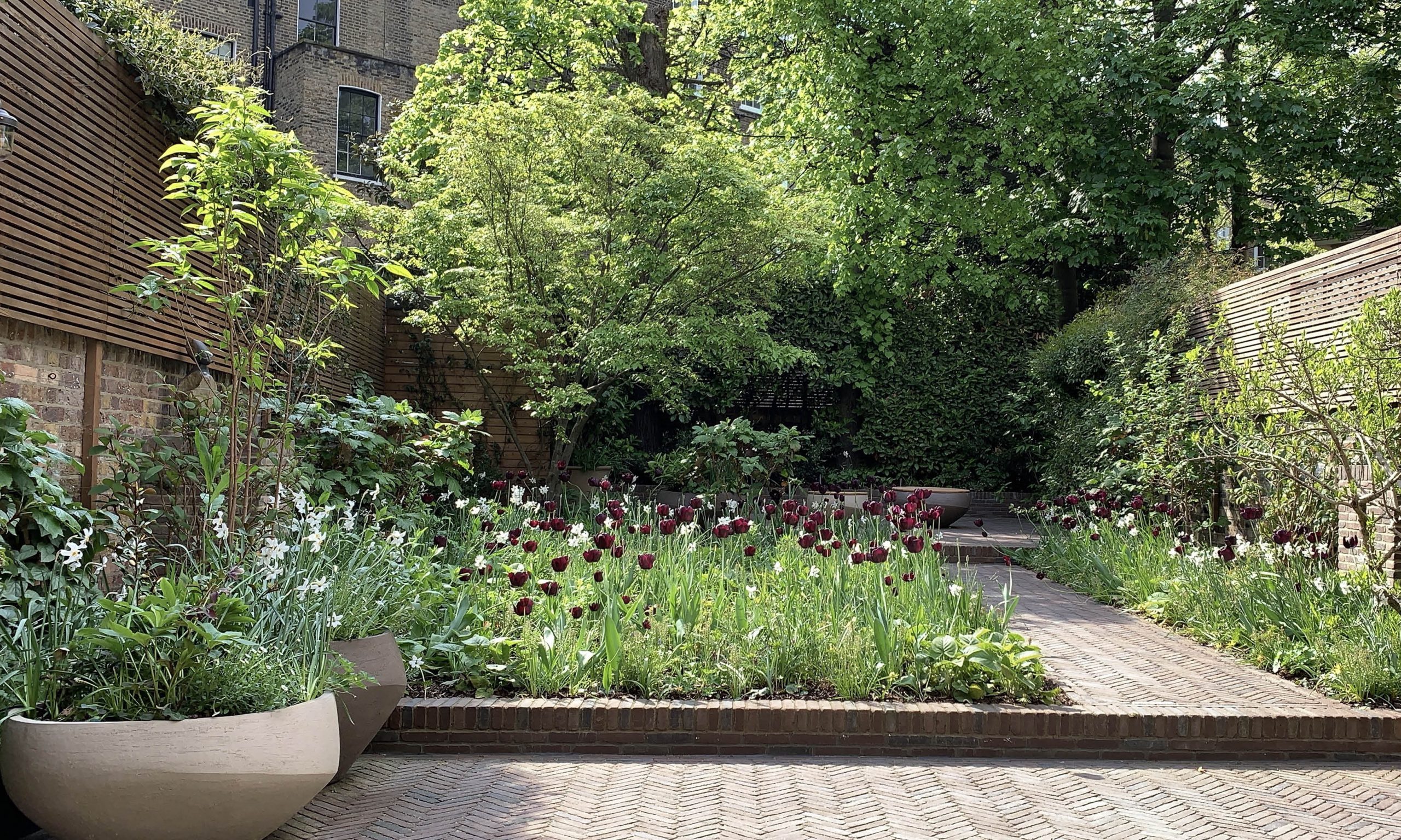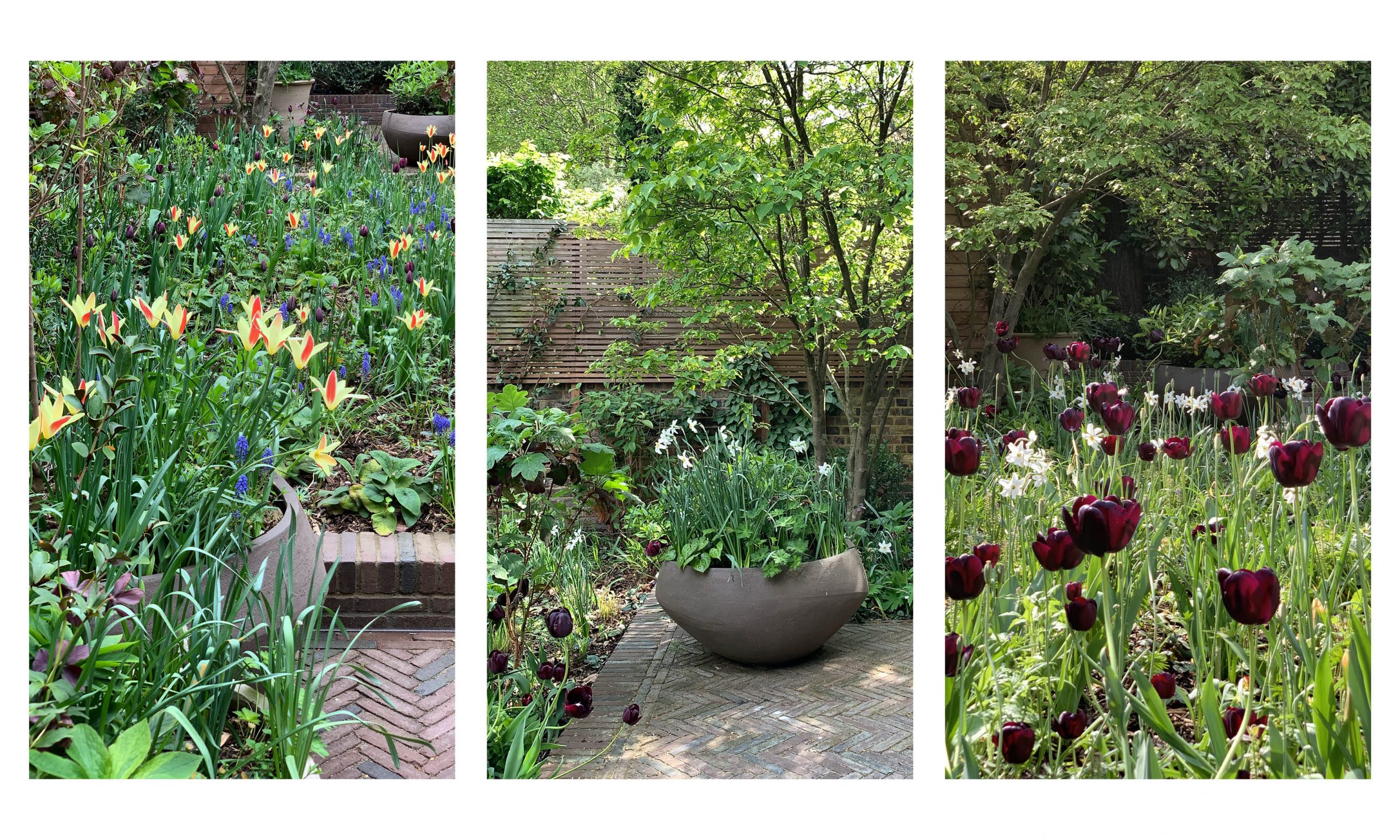 Snowdrops will herald the spring here in Pelham Cresent, followed by a rich mix of bulbs and corms, including daffodils, cyclamens, and combinations of the very dark tulip ‘Queen of the Night’ with pure white ‘Angel’s Wish’ tulips and little yellow aconites.