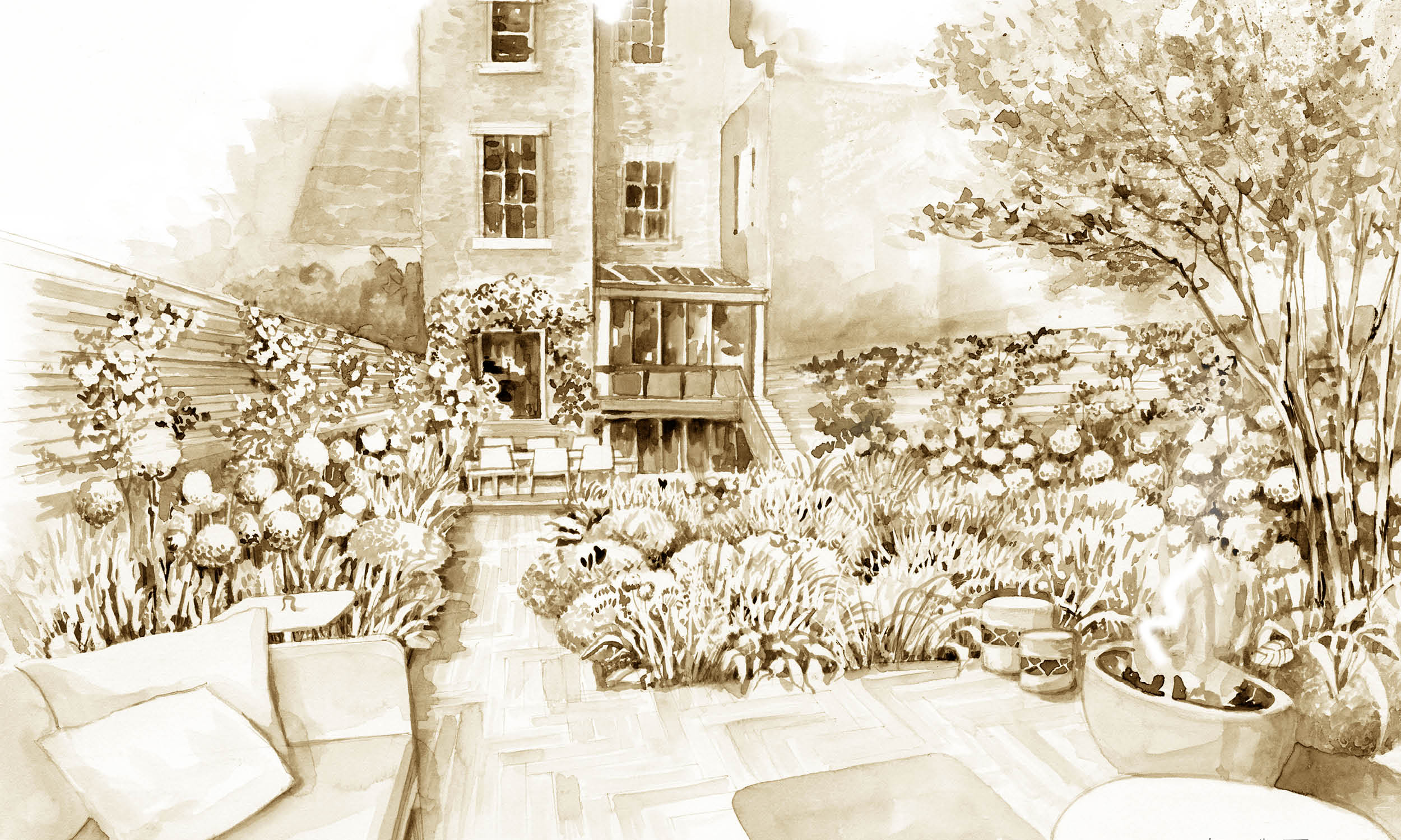 We kept the two terraces, although we replaced their stone slabs with delicate Belgian bricks laid in a herringbone pattern, and made sure that the nearest of the two drained away from the house. The lawn had always been too small to be of any practical use, and now we took it up, linking the two terraces instead with a brick path along one side of the site. The nearer terrace, which is conveniently close to the house, is the sunniest spot in the garden, and this makes it the ideal place for alfresco dining. We have furnished it with a table and chairs, and an array of low, ornamental pots that can be planted up for each season. The further terrace is a more intimate, sheltered space that we will furnish with comfortable sofas, low tables and our trademark fire pits made from elegant terracotta pots.