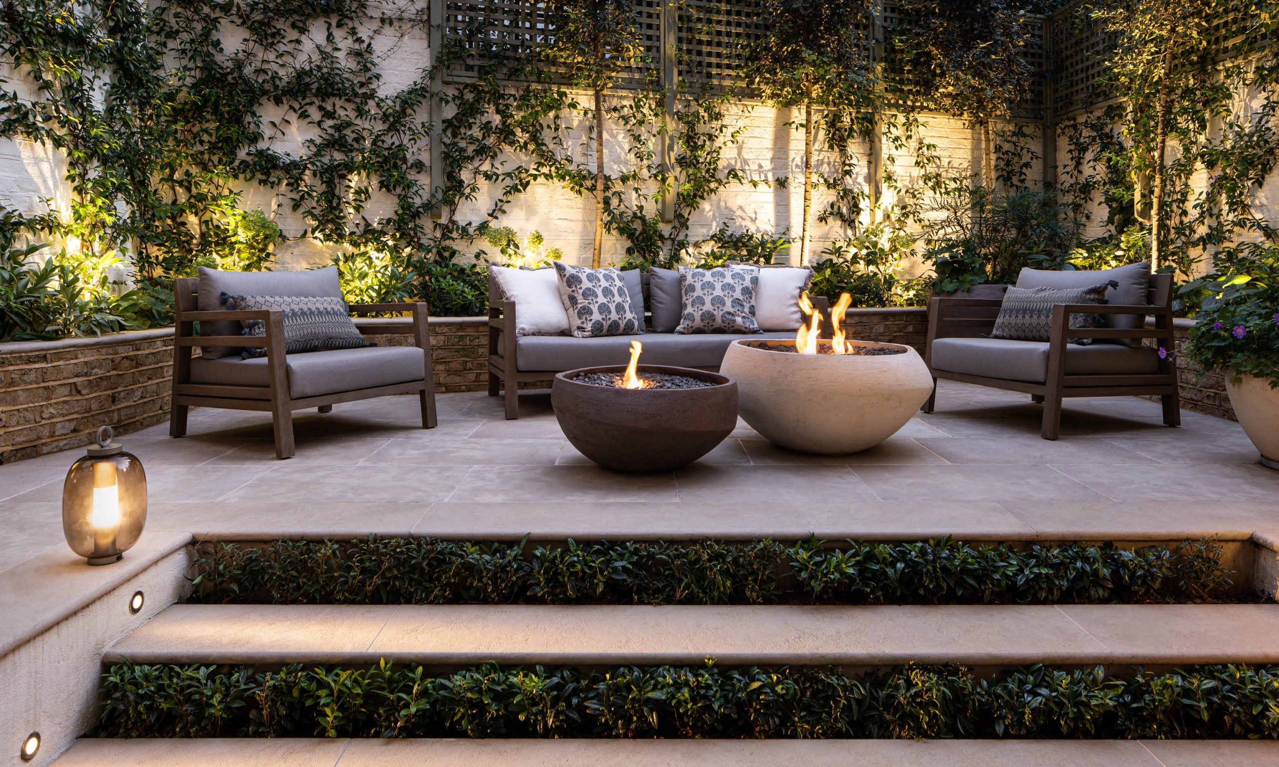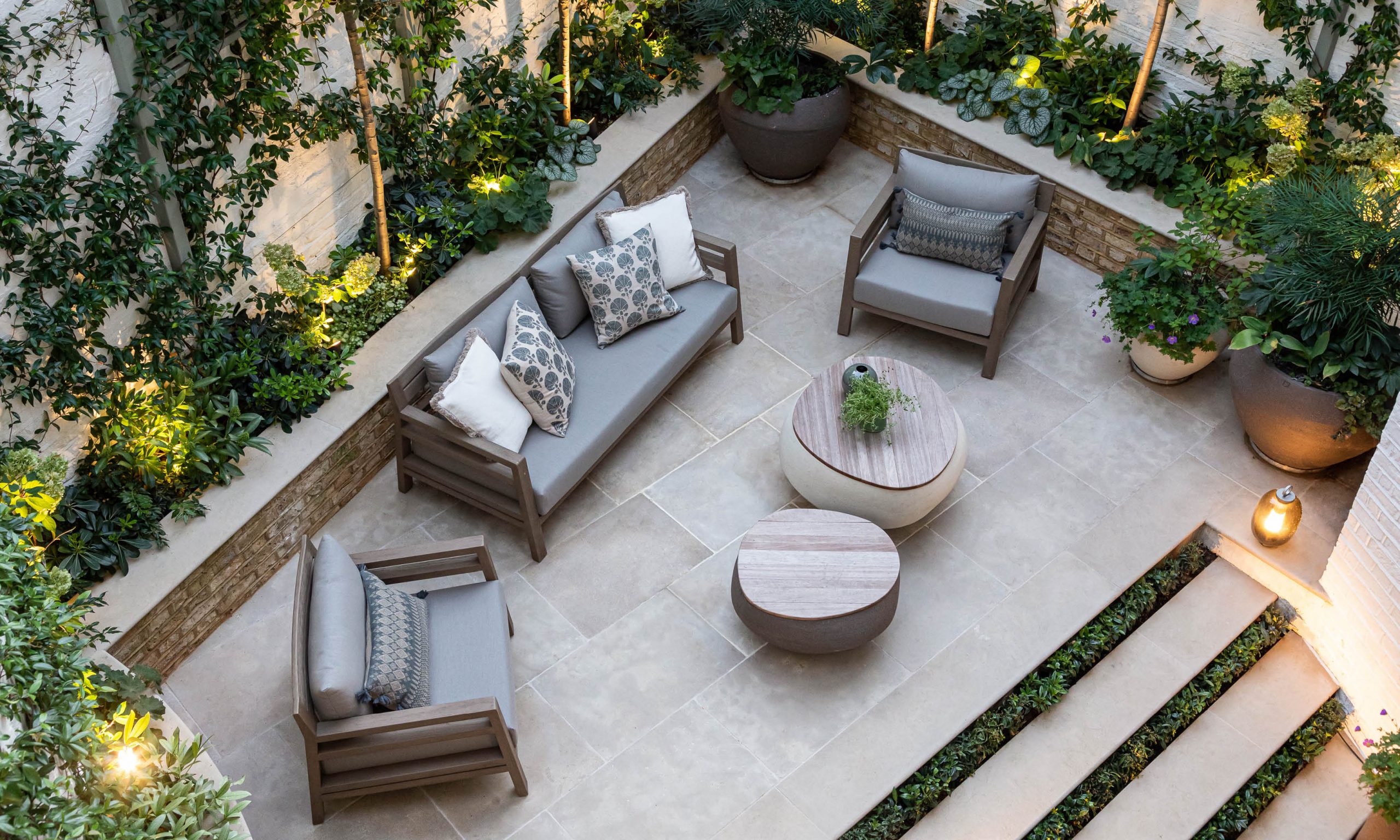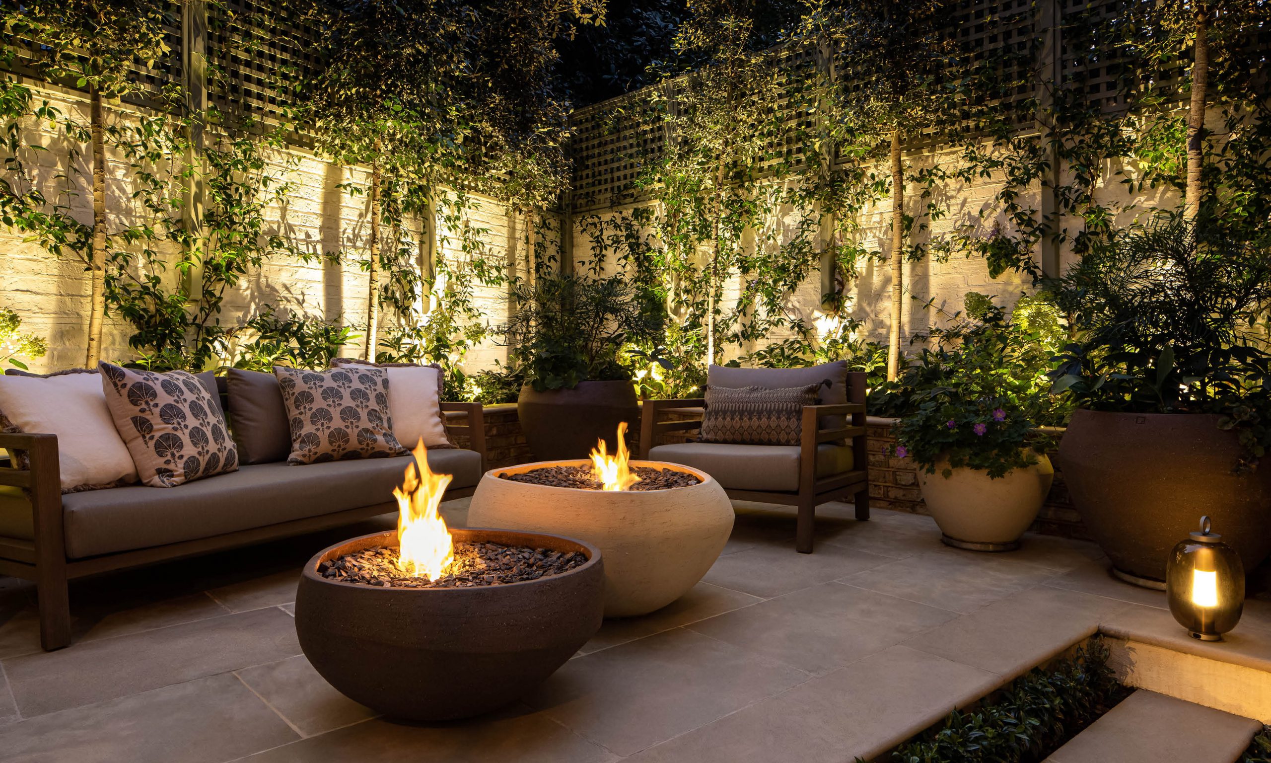 The wonderfully elegant and intimate space we have created behind the house is comfortably furnished with sofa and chairs. Our lighting makes it as welcoming after dark as it is during the day. We have planted an enfilade of Quercus ilex to line the walls, and their bare trunks and clipped heads produce a familiar touch of formality. This is offset by the rich mix of shrubs and perennials beneath the trees, which fill the garden with colour and scent all year. As always we have included one novelty in our planting. This time it is a new variety of mahonia, M. eurybracteatasubsp. ganpinensis ‘Soft Caress’. Its delicate fern-like leaves add another texture to the planting, and its flowers fill the garden with their honey scent in late summer.