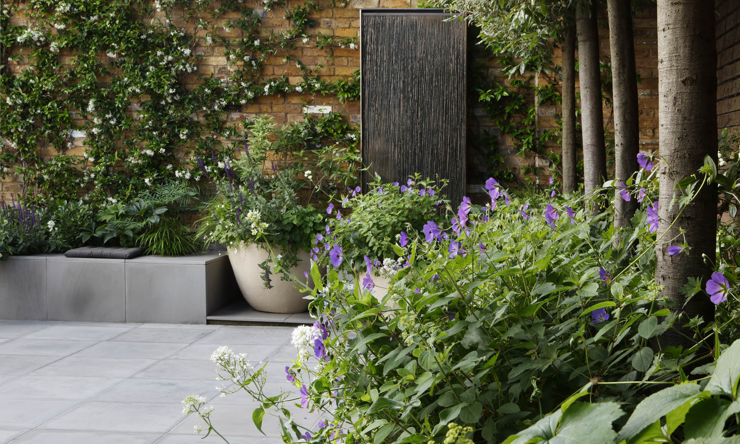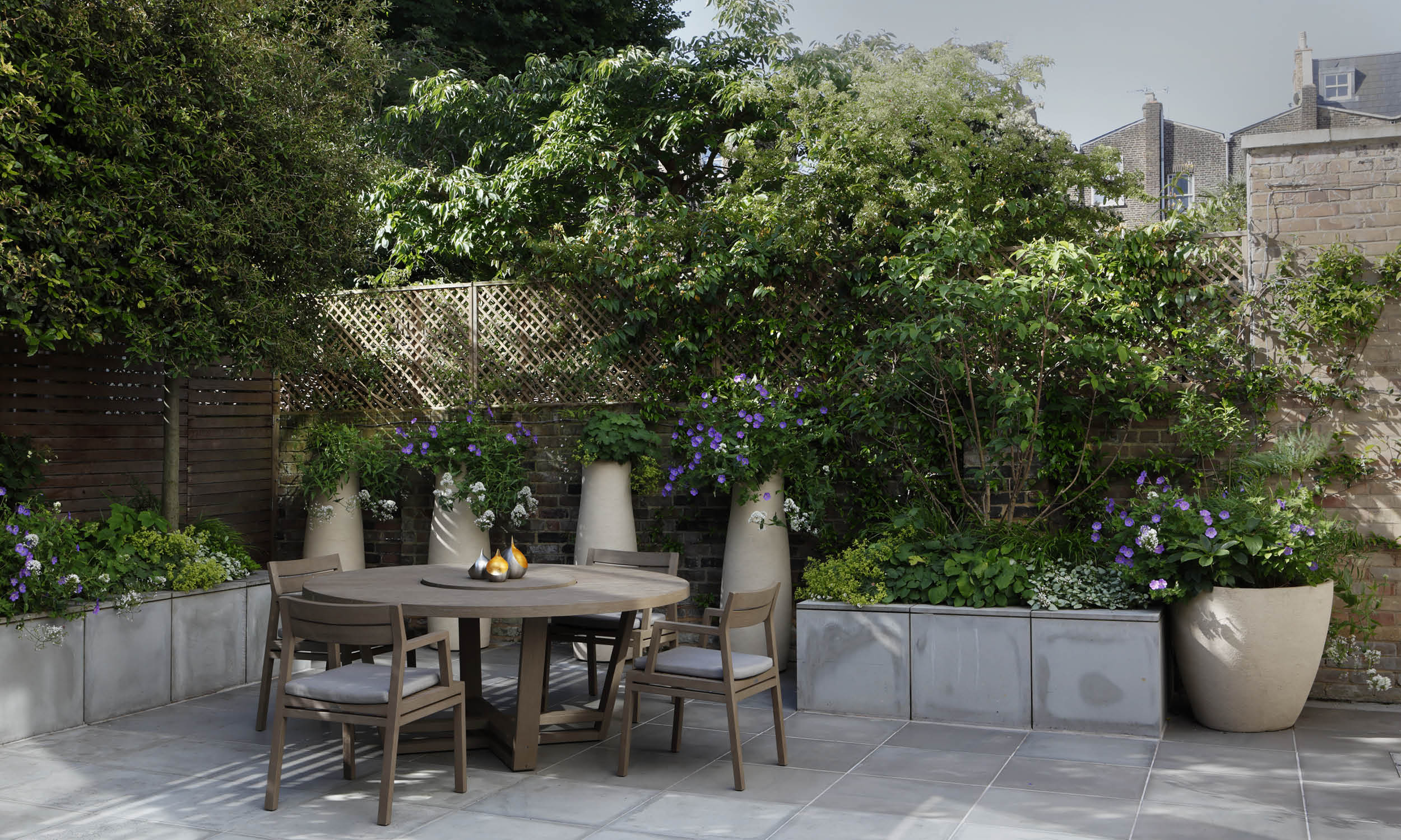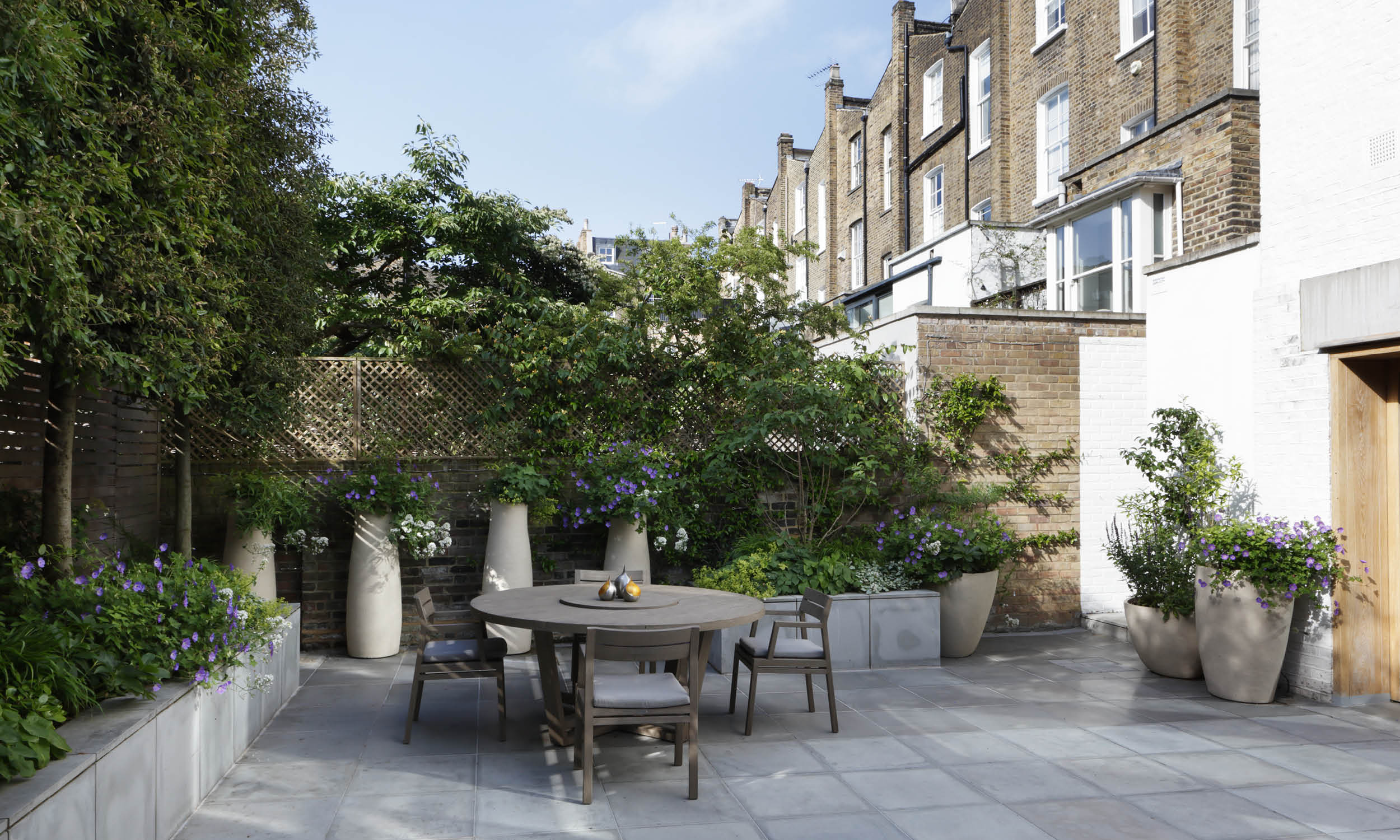 The slender trunks of hornbeams (Quercus ilex) emerge from a slate-grey planter opposite the back door, their pleached canopies screening the garden throughout the year. All the pots, planters and furniture here are characterised by the kind of simple elegance that guarantees serenity in even the smallest space. We have planted a carefully curated selection of plants and shrubs to create a vibrant mix of scents, colours and textures throughout the year. First comes the mid-winter perfume of Sacococca, then the compact mounds of Japanese mock orange (Pittosporum tobira nanum) bear their honey-scented flowers. Soon the violet-blue of hardy geranium ‘Roxanne’ is seen alongside white valerian and the inky spikes of Salvia nemorosa caradonna, plants that can be relied on to give their all throughout the summer. This sunny palette is drenched in scent by summer jasmine scrambling up the wall, and underpinned by the darker, more exotic notes of Disporum cantoniense ‘Black heron’, with its dusky stems and green flowers. Late summer sees the lace-caps of climbing Hydrangea petiolarison the fence, and in autumn the star of the garden is the multi-stemmed Clerodendron trichotomum, with unusual, heavily scented flowers that are followed by blue-black berries.