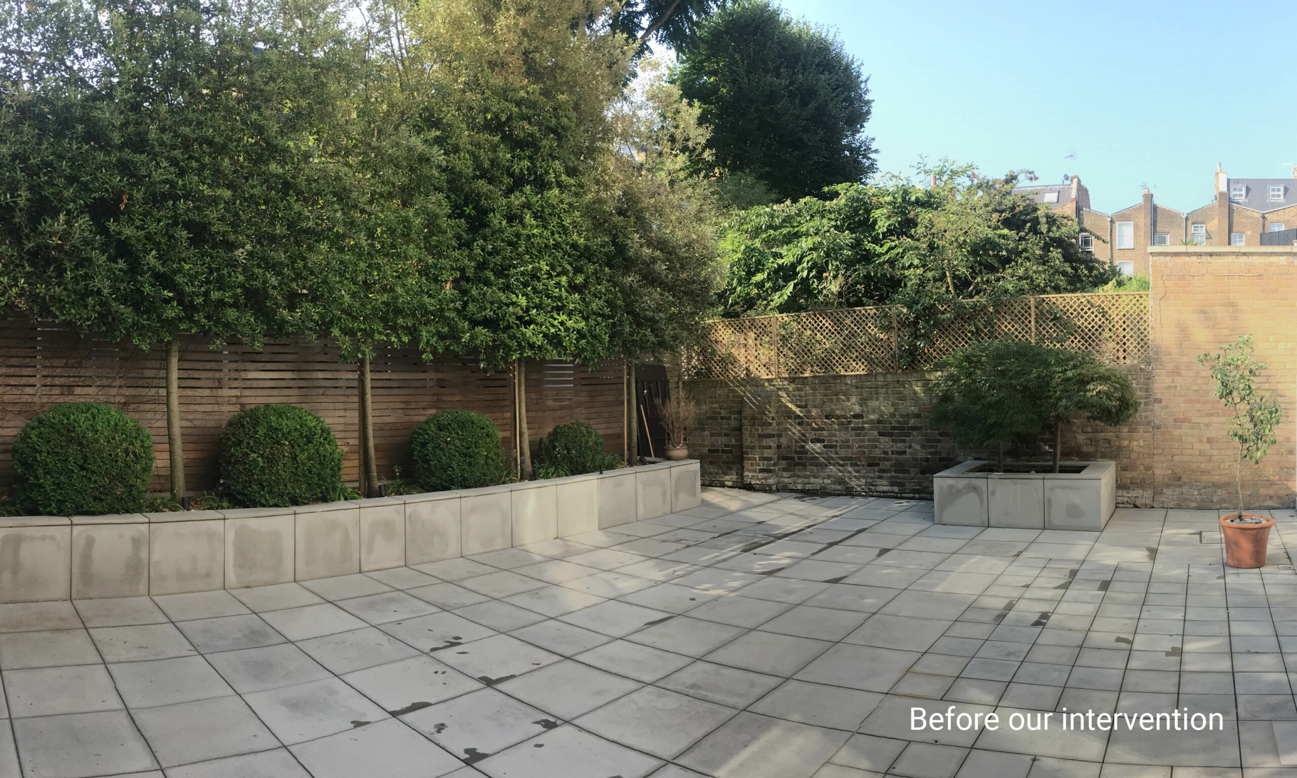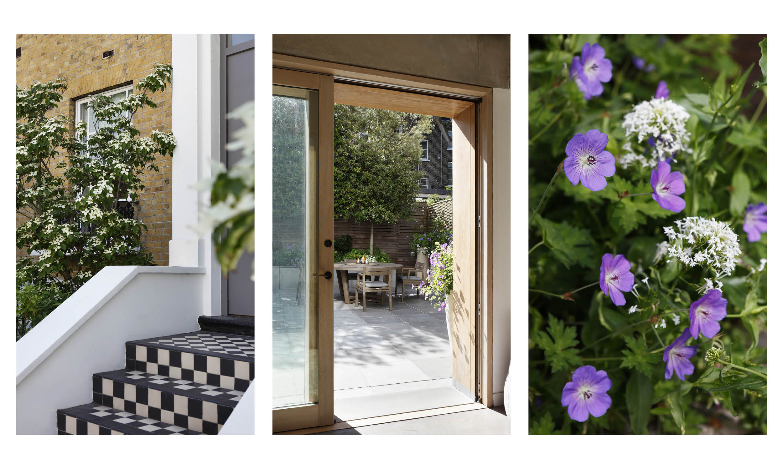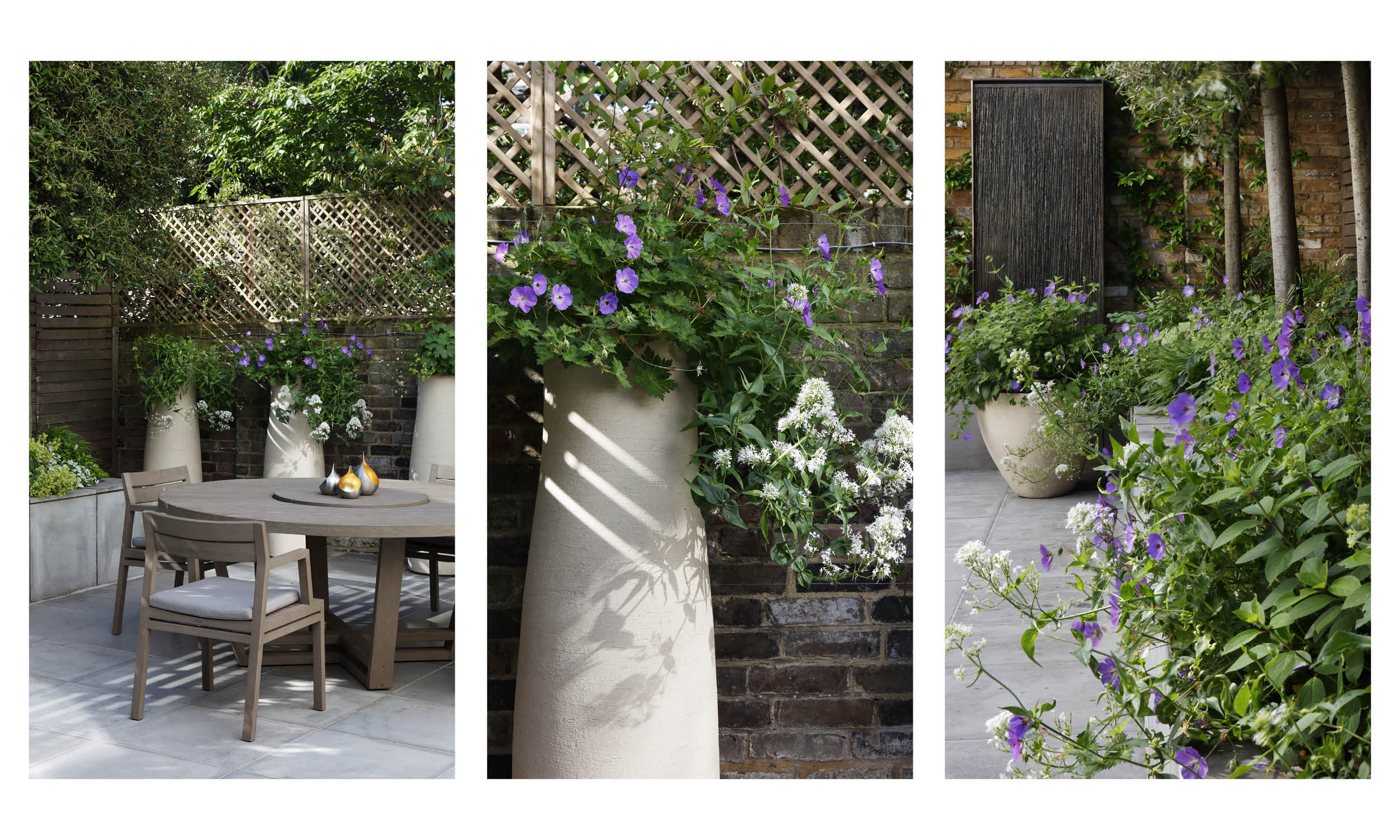 The slender trunks of hornbeams (Quercus ilex) emerge from a slate-grey planter opposite the back door, their pleached canopies screening the garden throughout the year. All the pots, planters and furniture here are characterised by the kind of simple elegance that guarantees serenity in even the smallest space. We have planted a carefully curated selection of plants and shrubs to create a vibrant mix of scents, colours and textures throughout the year. First comes the mid-winter perfume of Sacococca, then the compact mounds of Japanese mock orange (Pittosporum tobira nanum) bear their honey-scented flowers. Soon the violet-blue of hardy geranium ‘Roxanne’ is seen alongside white valerian and the inky spikes of Salvia nemorosa caradonna, plants that can be relied on to give their all throughout the summer. This sunny palette is drenched in scent by summer jasmine scrambling up the wall, and underpinned by the darker, more exotic notes of Disporum cantoniense ‘Black heron’, with its dusky stems and green flowers. Late summer sees the lace-caps of climbing Hydrangea petiolarison the fence, and in autumn the star of the garden is the multi-stemmed Clerodendron trichotomum, with unusual, heavily scented flowers that are followed by blue-black berries.