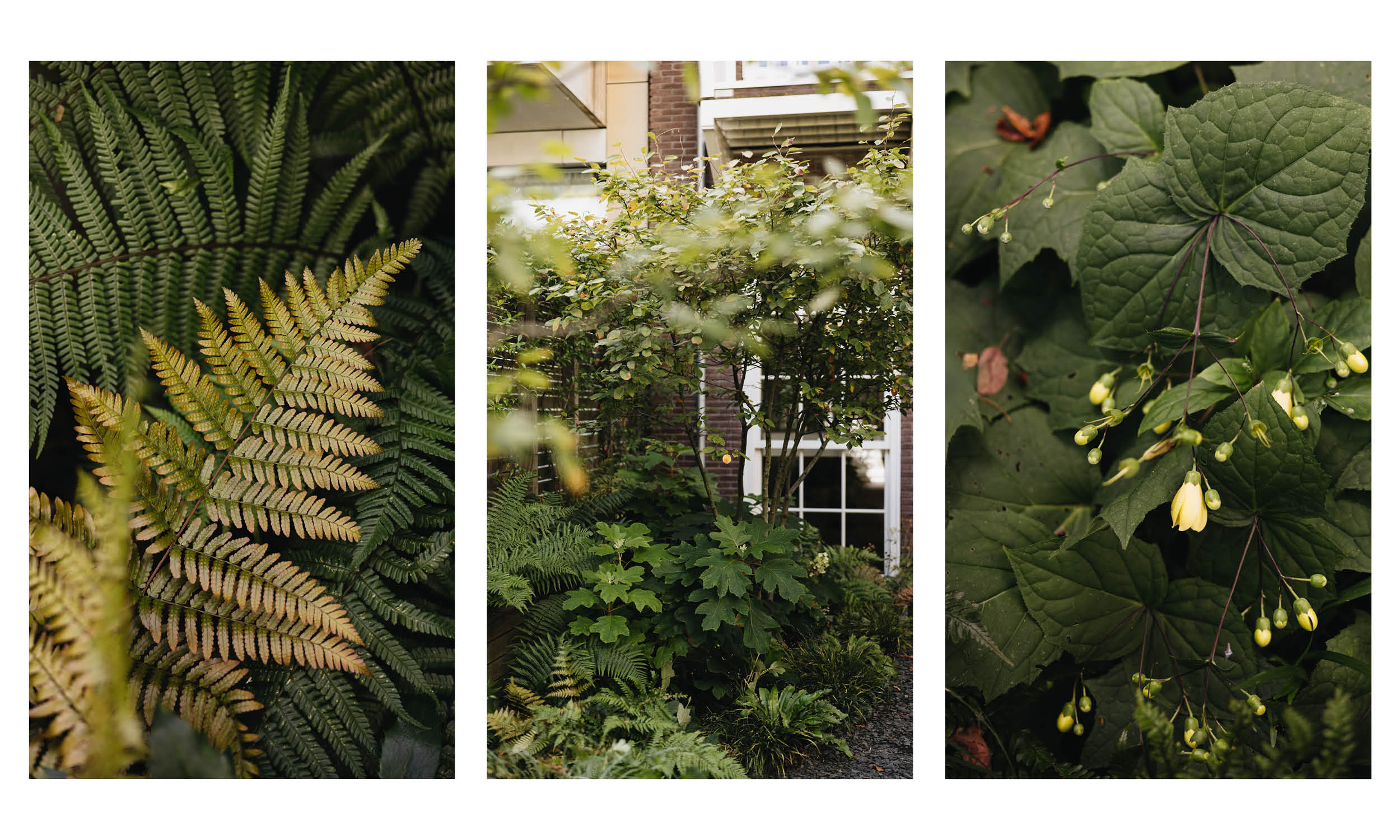 Although the garden benefits from soft morning light, the surrounding tall buildings create a predominantly shaded environment. The planting scheme was thoughtfully composed to thrive in these conditions, with a rich mix of evergreen ferns, hydrangeas, Brunnera, Kirengeshoma palmata, and a structural matrix of ornamental grasses such as Sesleria autumnalis ‘Greenlee Hybrid’ and Luzula nivea.