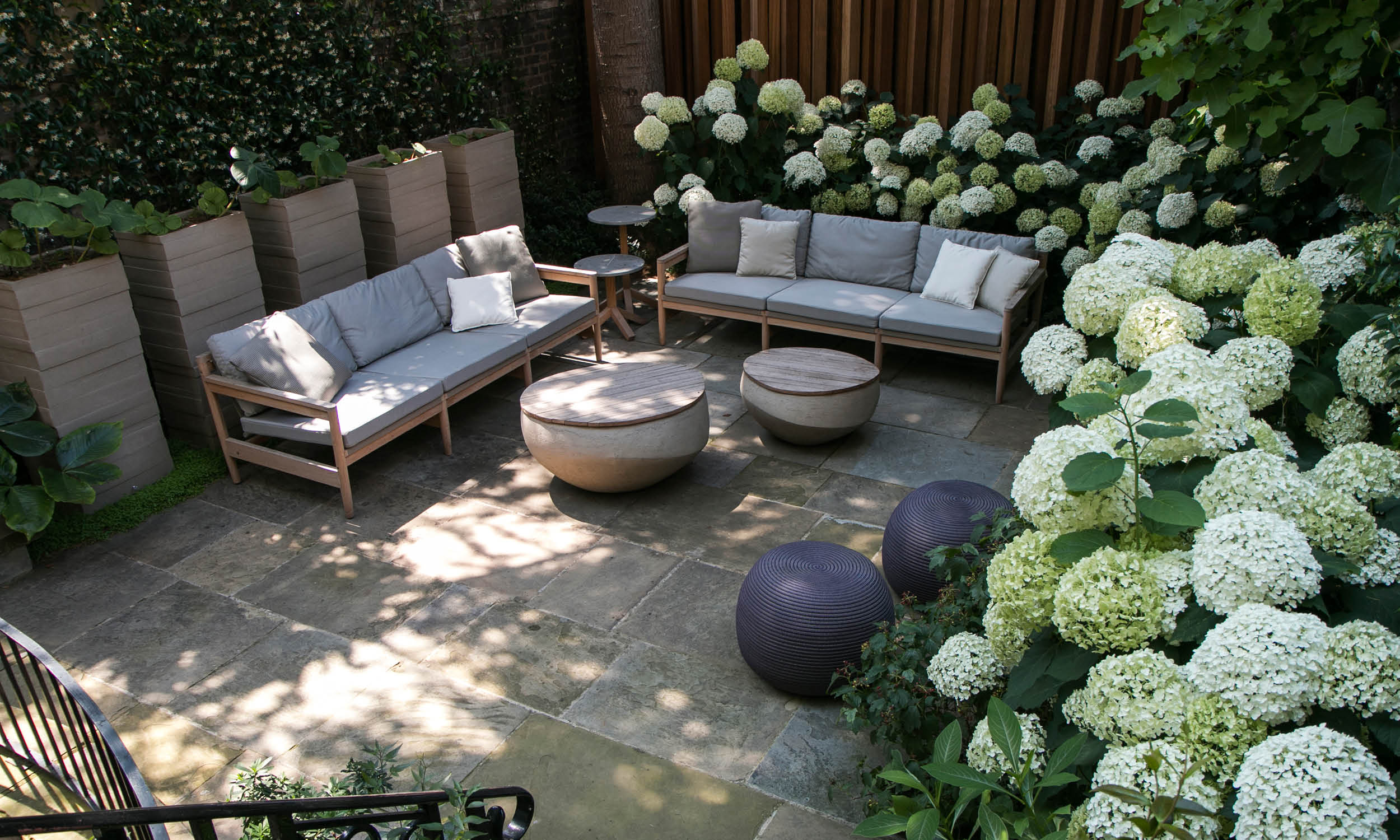 The tree already did a good job of shading a corner of the house in summer and screening a view over neighbouring properties. Taking inspiration from the lovely tracery of its bare branches in winter, we designed a wooden trellis. The regular sequence of vertical posts create a backdrop on two sides of the site, while the softer contours of a heavily scented jasmine wall enclose the garden on the other side.