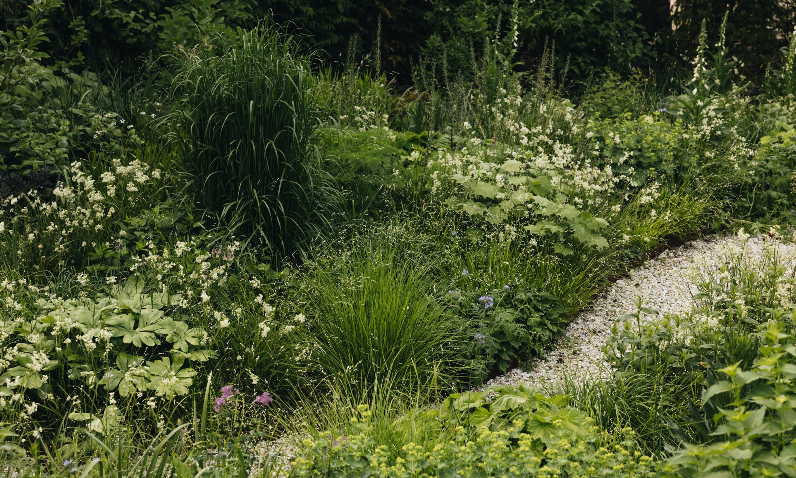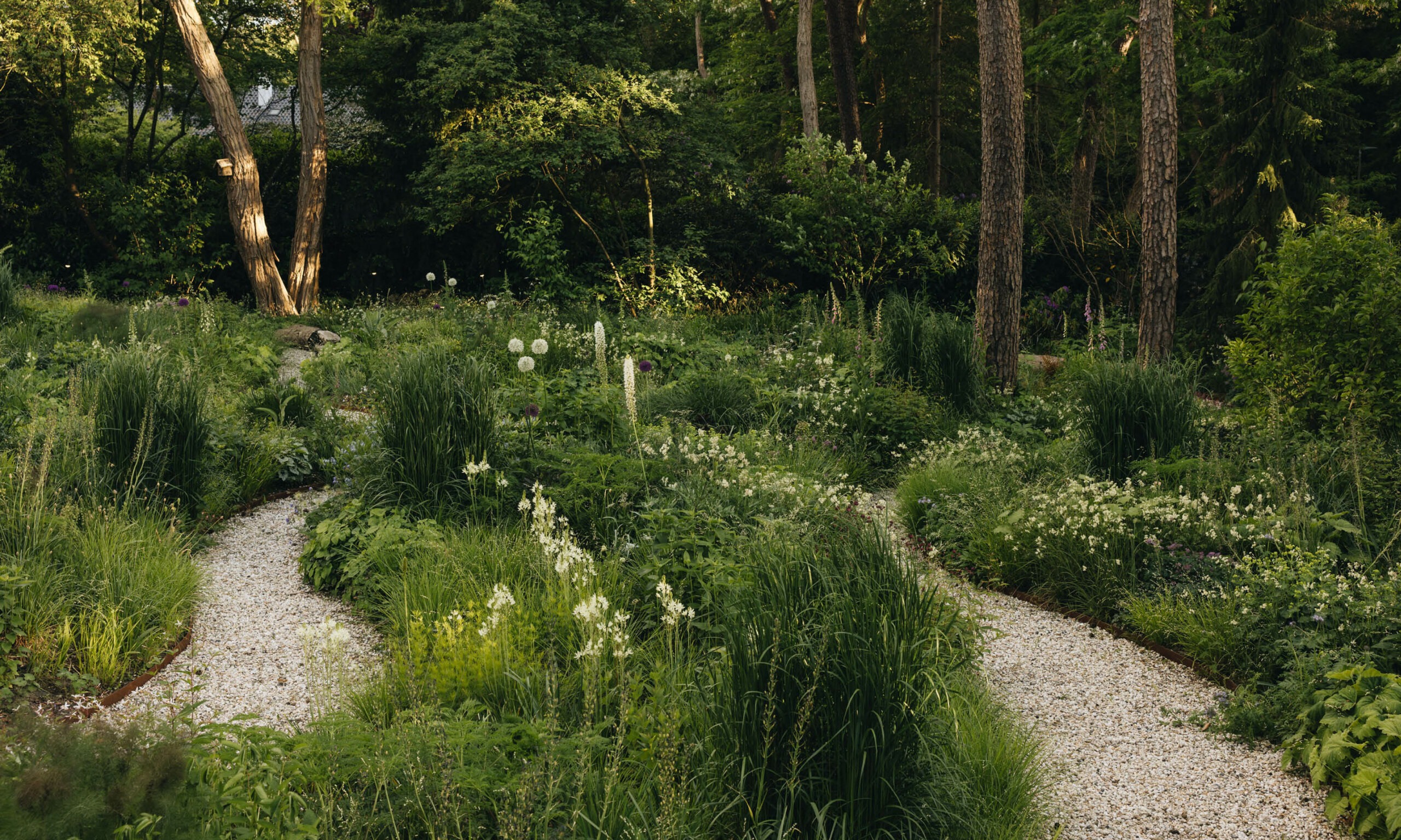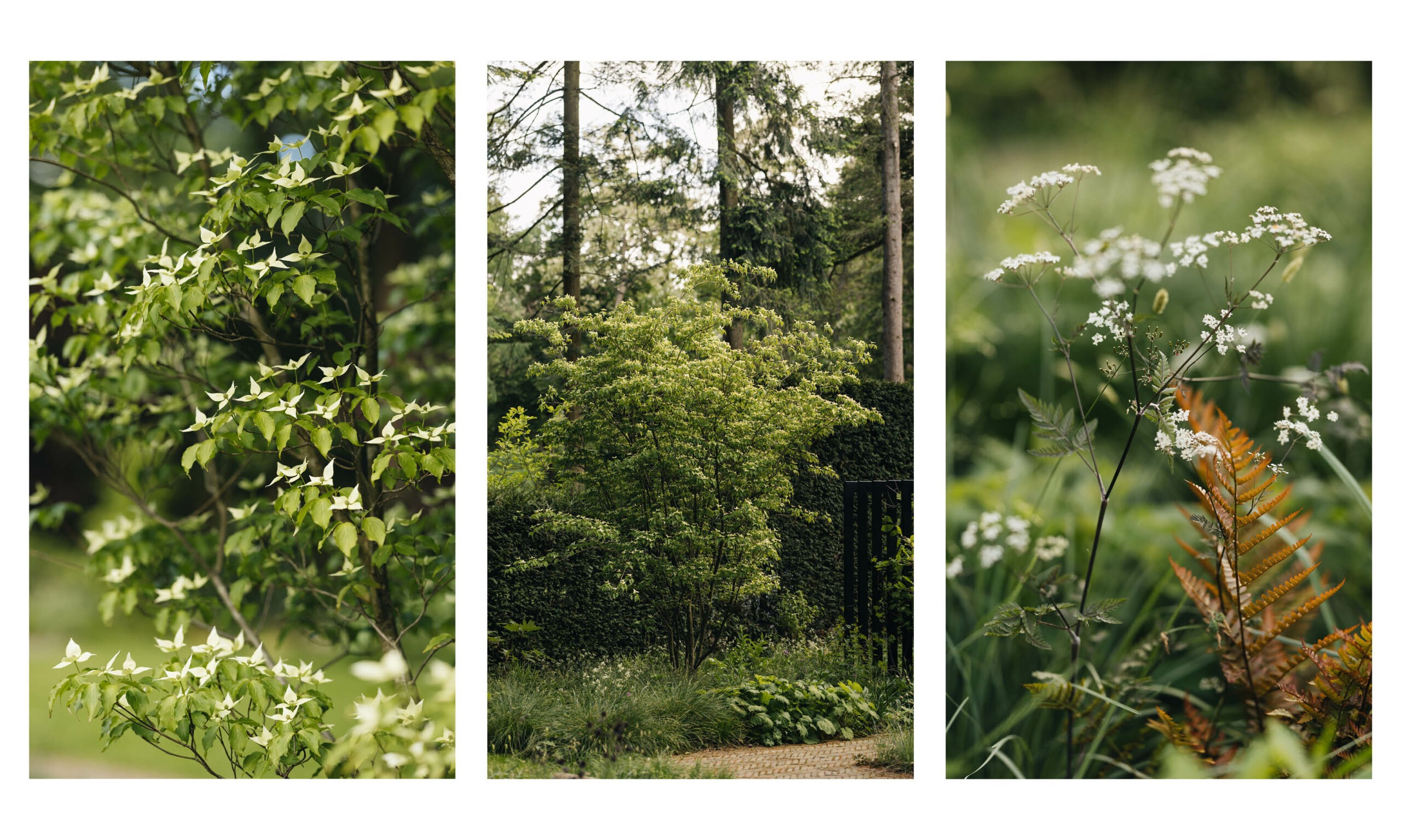 To further integrate the garden with the surrounding landscape, we planted two large Cornus cousa trees, each 5 meters tall, on either side of the pergola. These trees help bridge the scale of the garden to the larger trees in the background, reinforcing its connection to the woodland beyond.