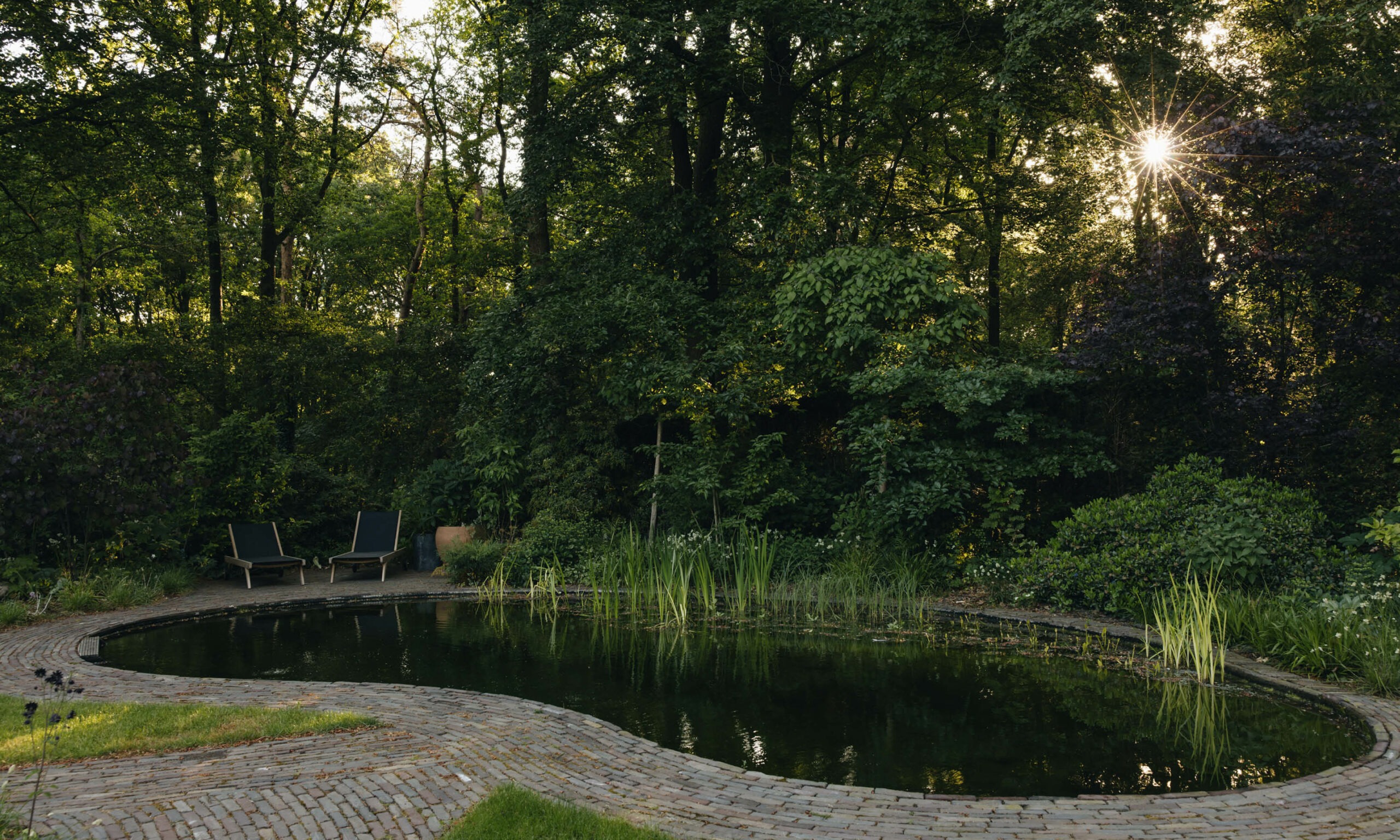 We designed organic, curving paths of varying widths to guide visitors through the garden and lead them to a natural swimming pool. The rear garden, previously dominated by a struggling lawn shaded by large trees, underwent a significant transformation. We reduced the lawn to about one-third of its original size, ensuring that the remaining areas receive ample sunlight to flourish. This lawn space was preserved for the clients’ dog and as a comfortable surface for barefoot walks between the pool and the sauna.