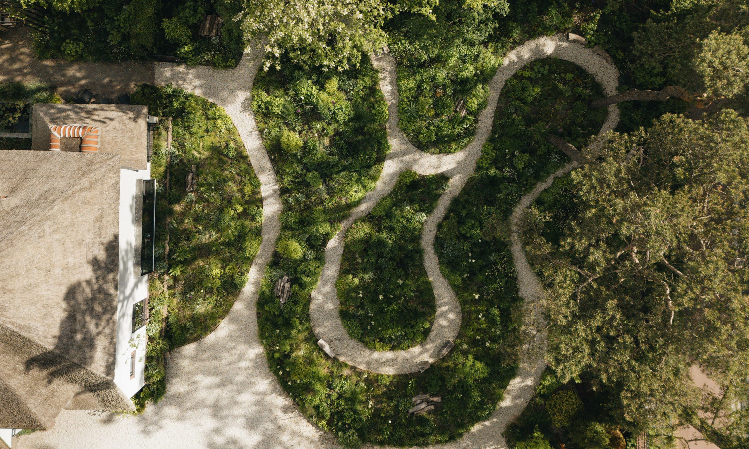 We chose gravel for the paths and car park to blur the lines between the driveway and the garden. This design choice allows the planting and overall garden aesthetic to take centre stage, shifting focus away from the functional aspects of parking. Previously, the car park’s brick surface drew undue attention; the new design redirects focus to the natural landscape, sparking curiosity and encouraging exploration. Additionally, we introduced larger planting areas to enhance the views from both inside the house and the entrance, enriching the overall experience of approaching the property.