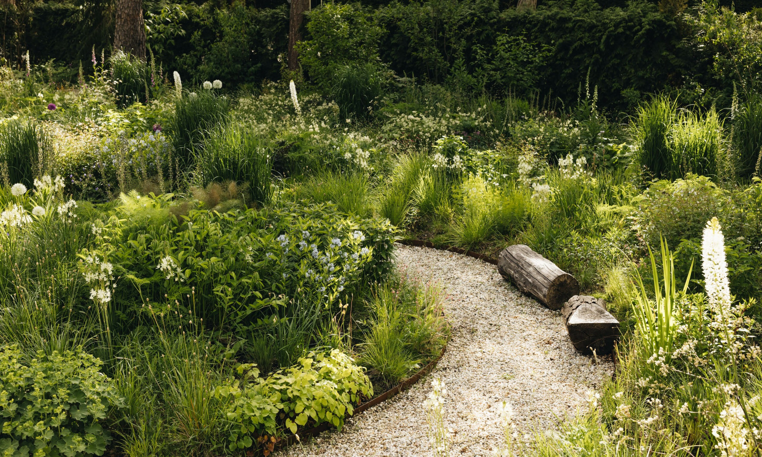 The addition of log piles within planting beds and log seats along the path edges enhances the garden’s narrative, evoking the feel of a woodland edge that complements the tall trees around the perimeter. These logs function as both sculptural and structural elements, adding interest and creating focal points, especially during the less active winter months.